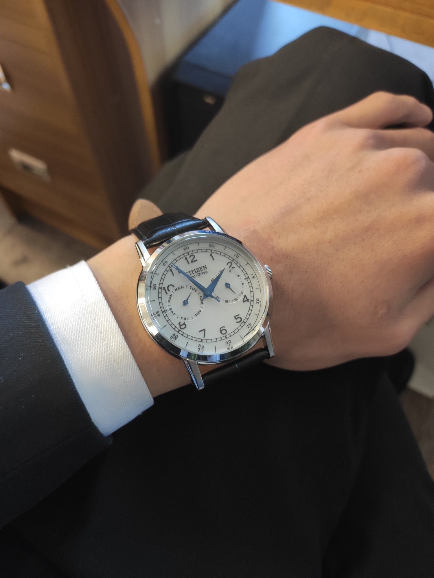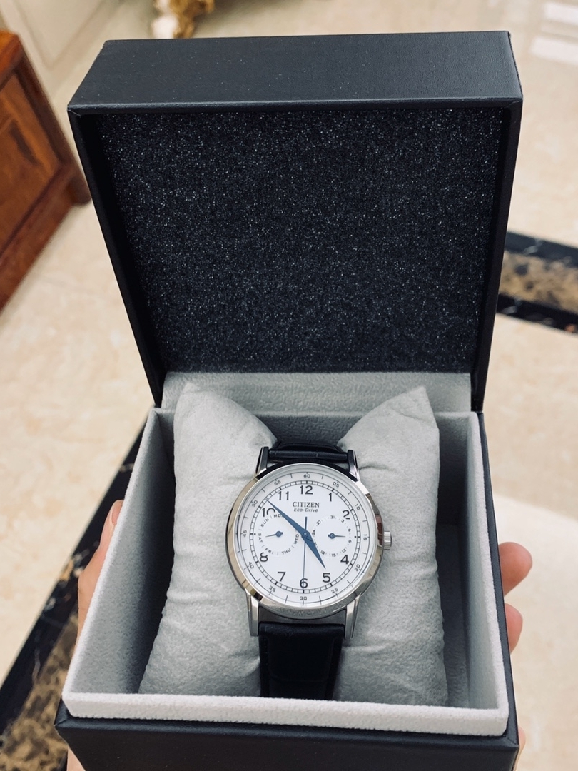 大气的白色表盘上跳动着蓝色的小指针,后来我才知道,还是光动能机芯的,我还傻傻的问客服用不用上弦,真是懒人的福音啊,他打开礼盒被惊艳到,原来他自打上班以来就想买块表,只是自己舍不得。