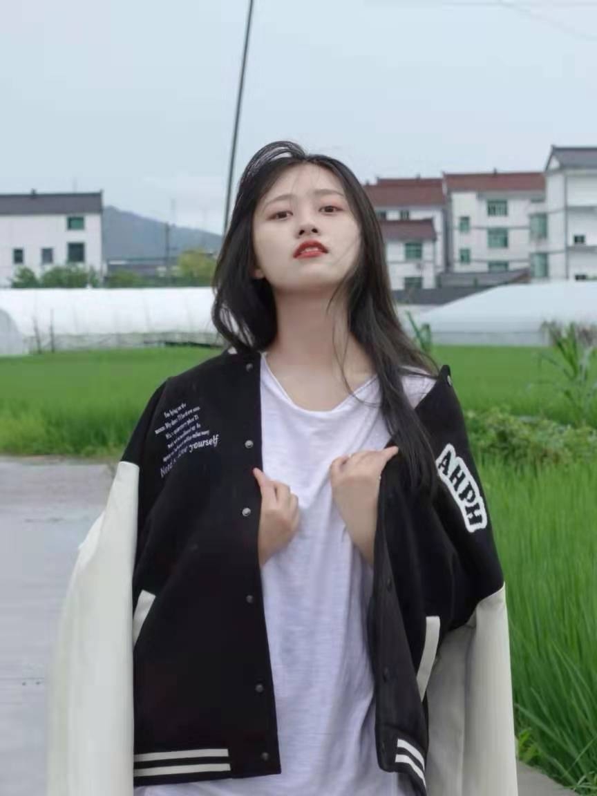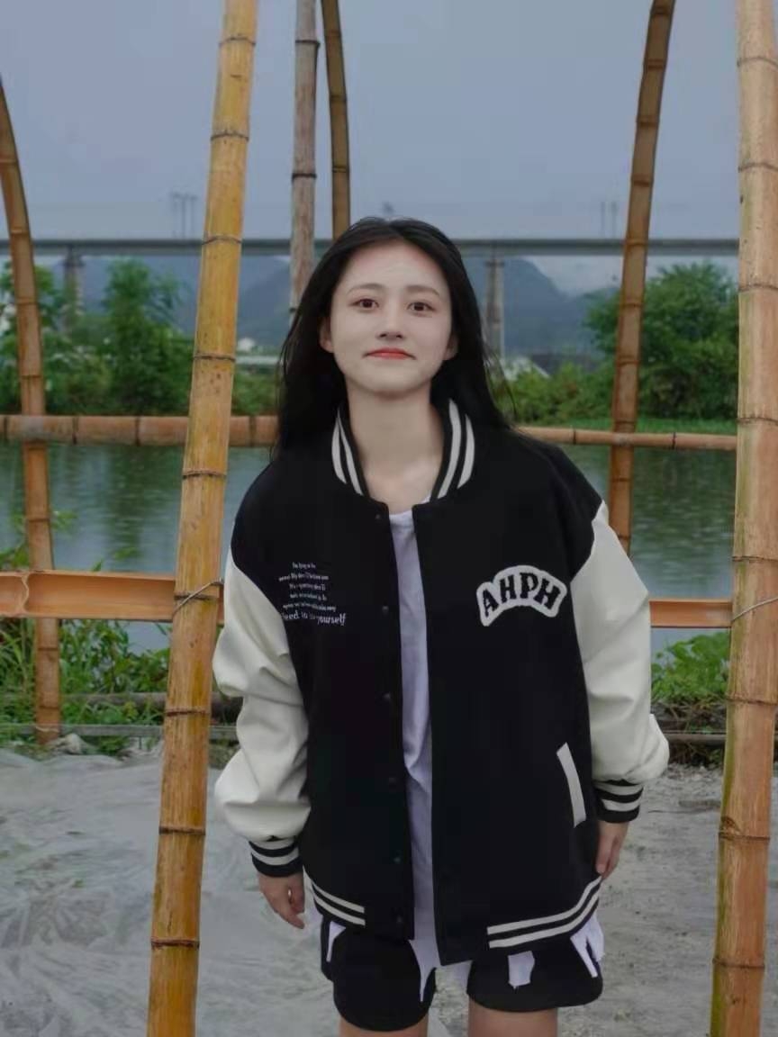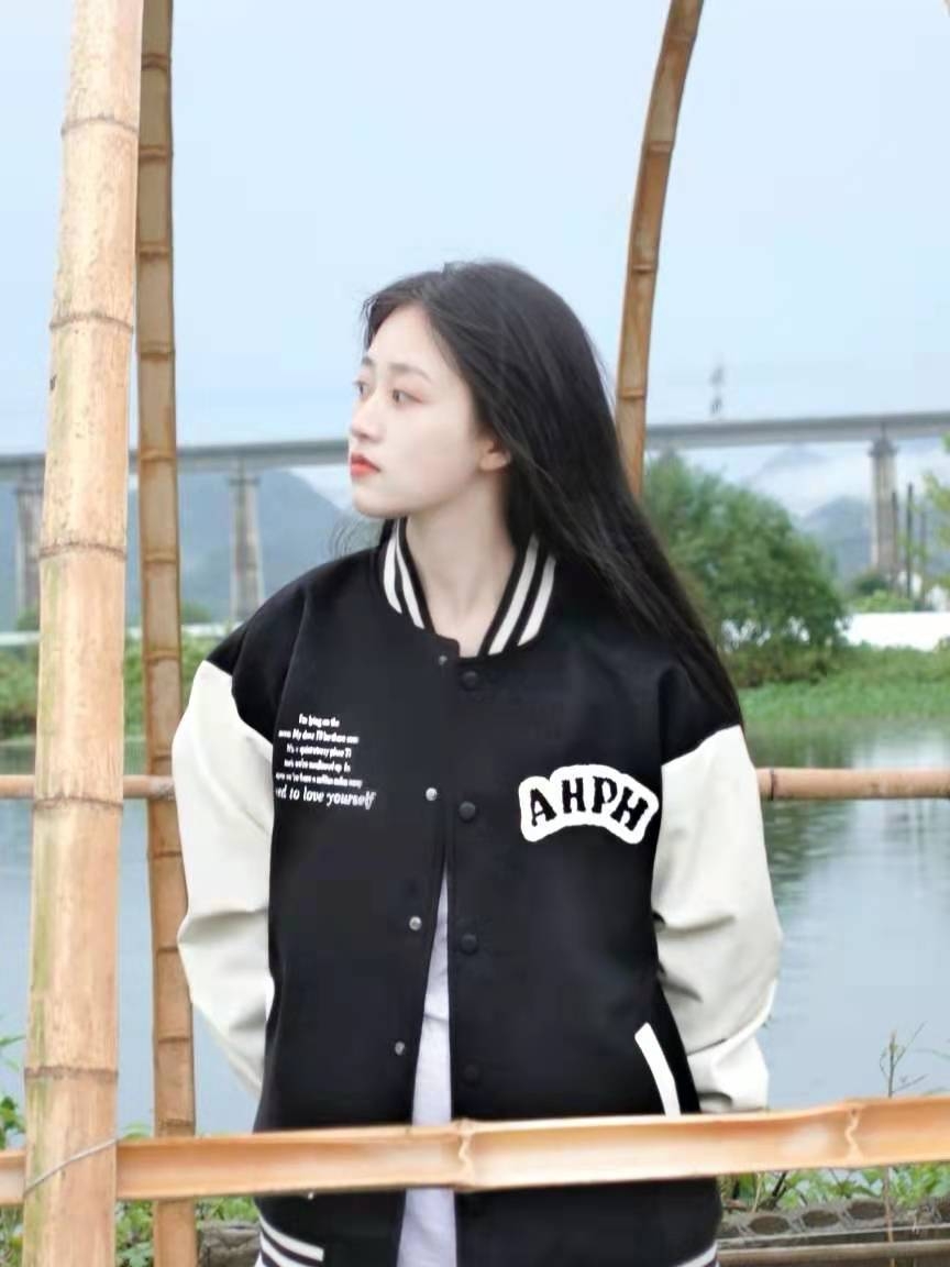 采用经典黑白配色的美式棒球夹克,经典耐看,图案分别采用毛巾绣,刺绣两种工艺呈现,增加潮流感,层次感和丰富度。