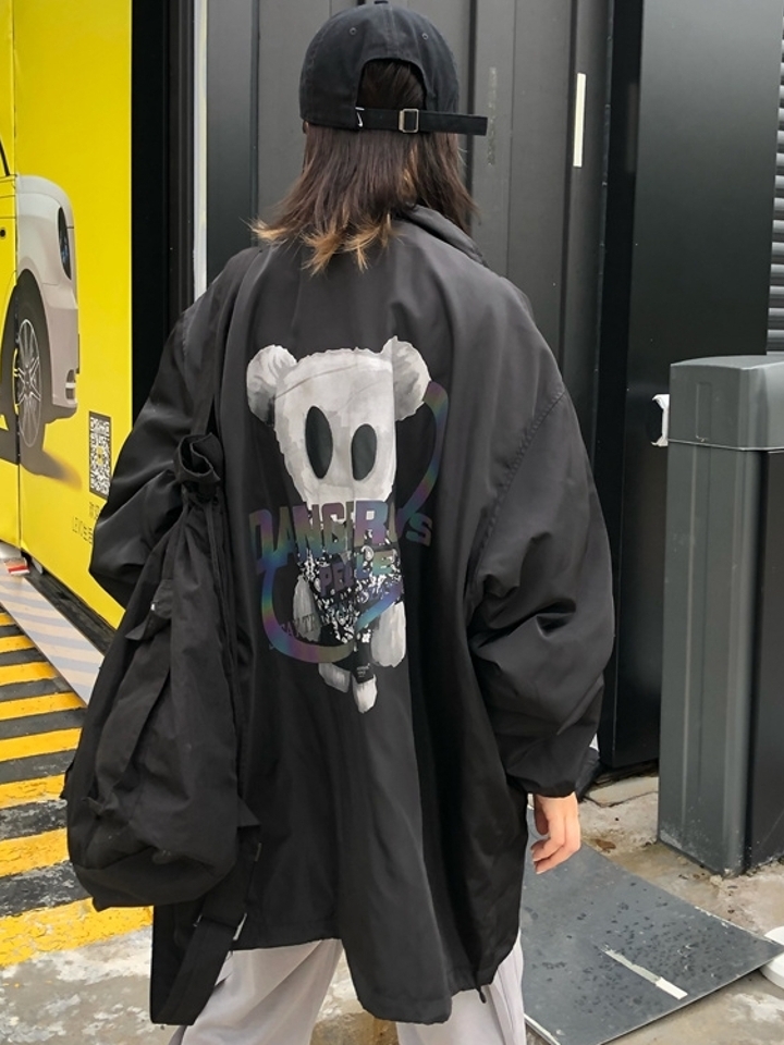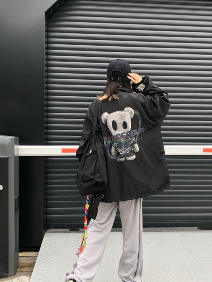 黑色的夹克可以说潮男衣橱中不能少的单品,在黑色简约外套上,用卡通标志进行装饰,加上白色字母的点缀,吸晴度爆表。