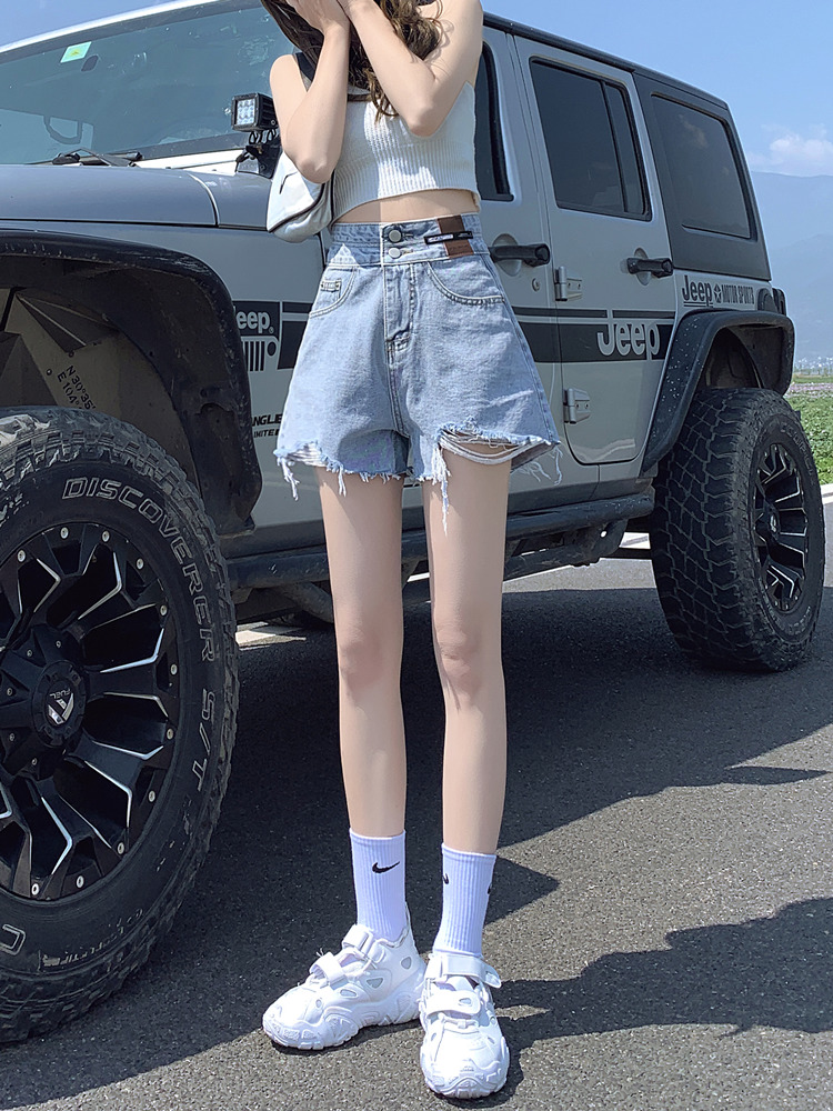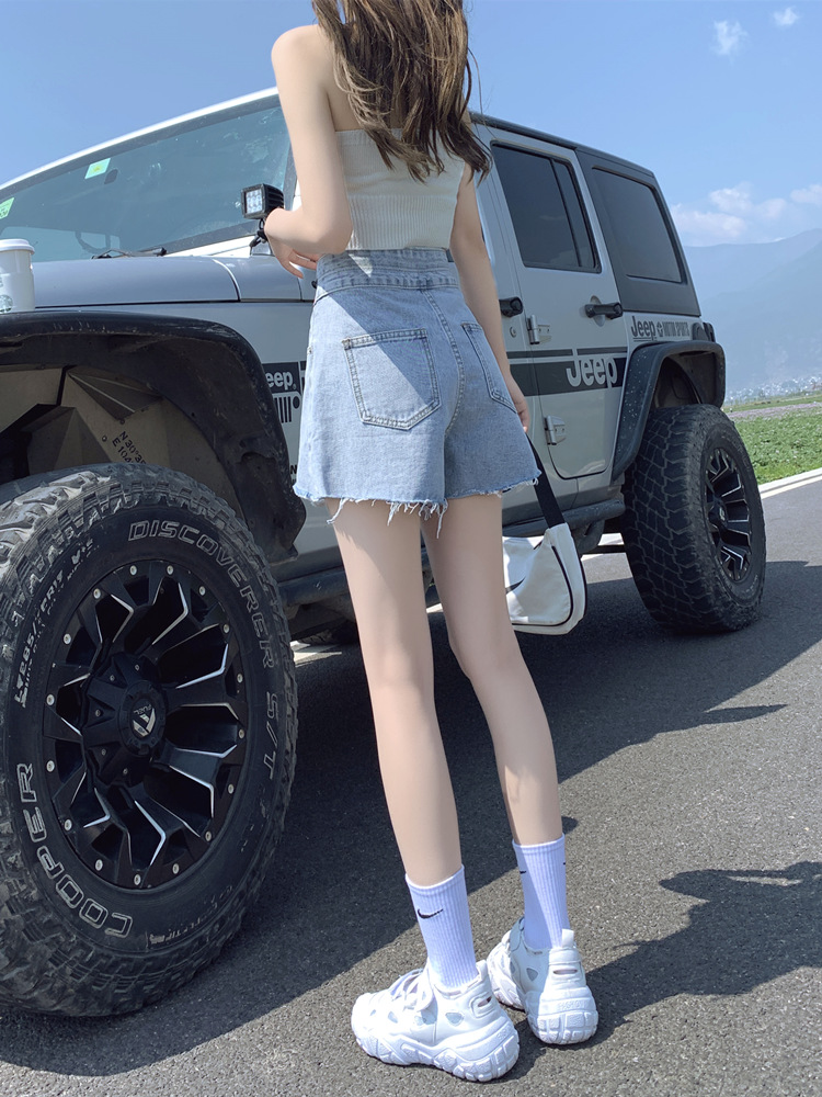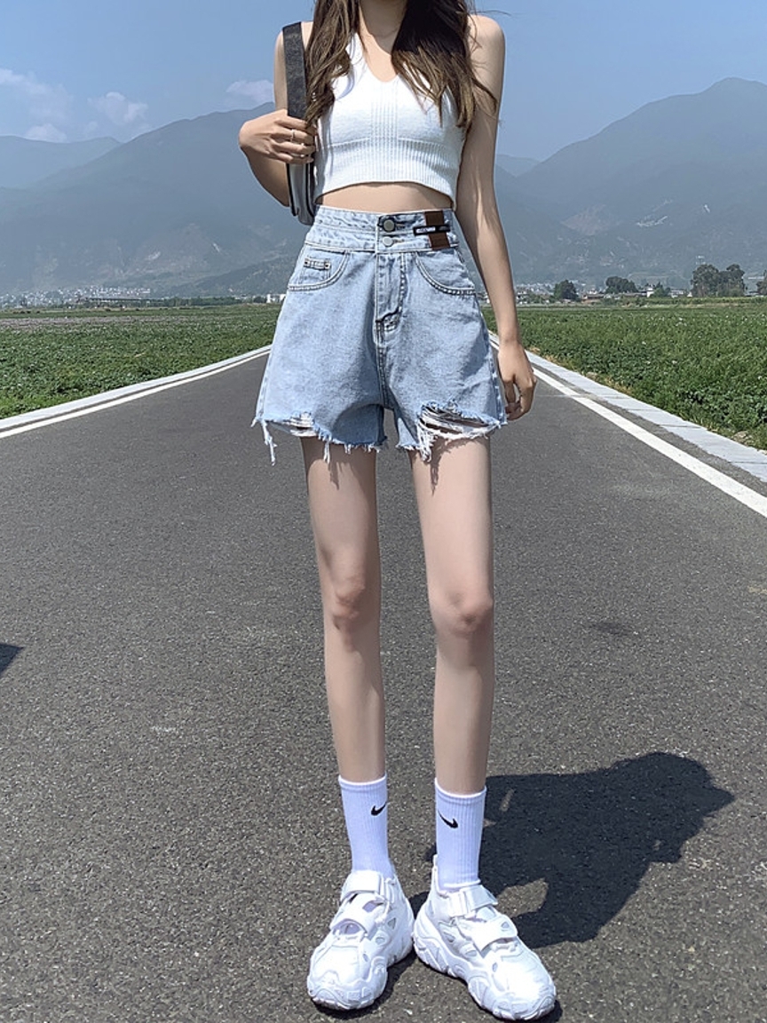 版型挺括的短裤有型又显瘦,裤摆的卷边设计能很好地修饰梨型身材。