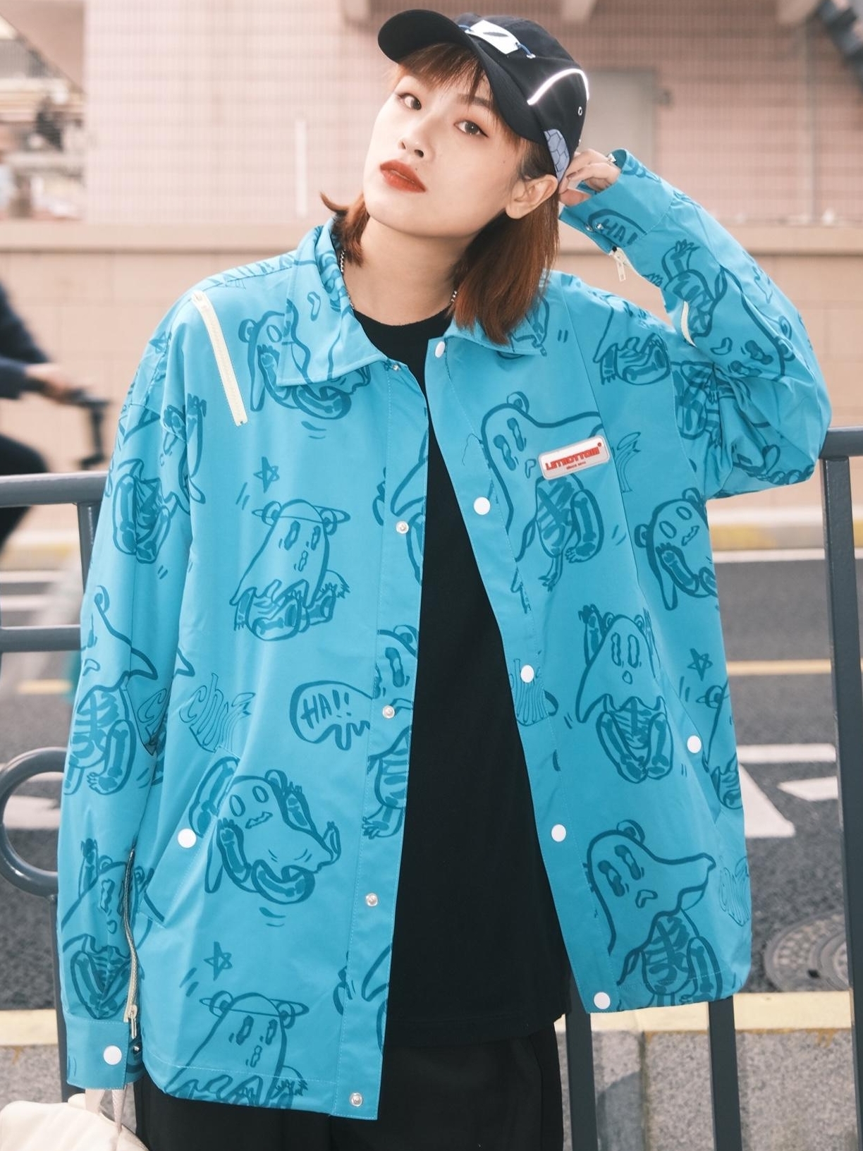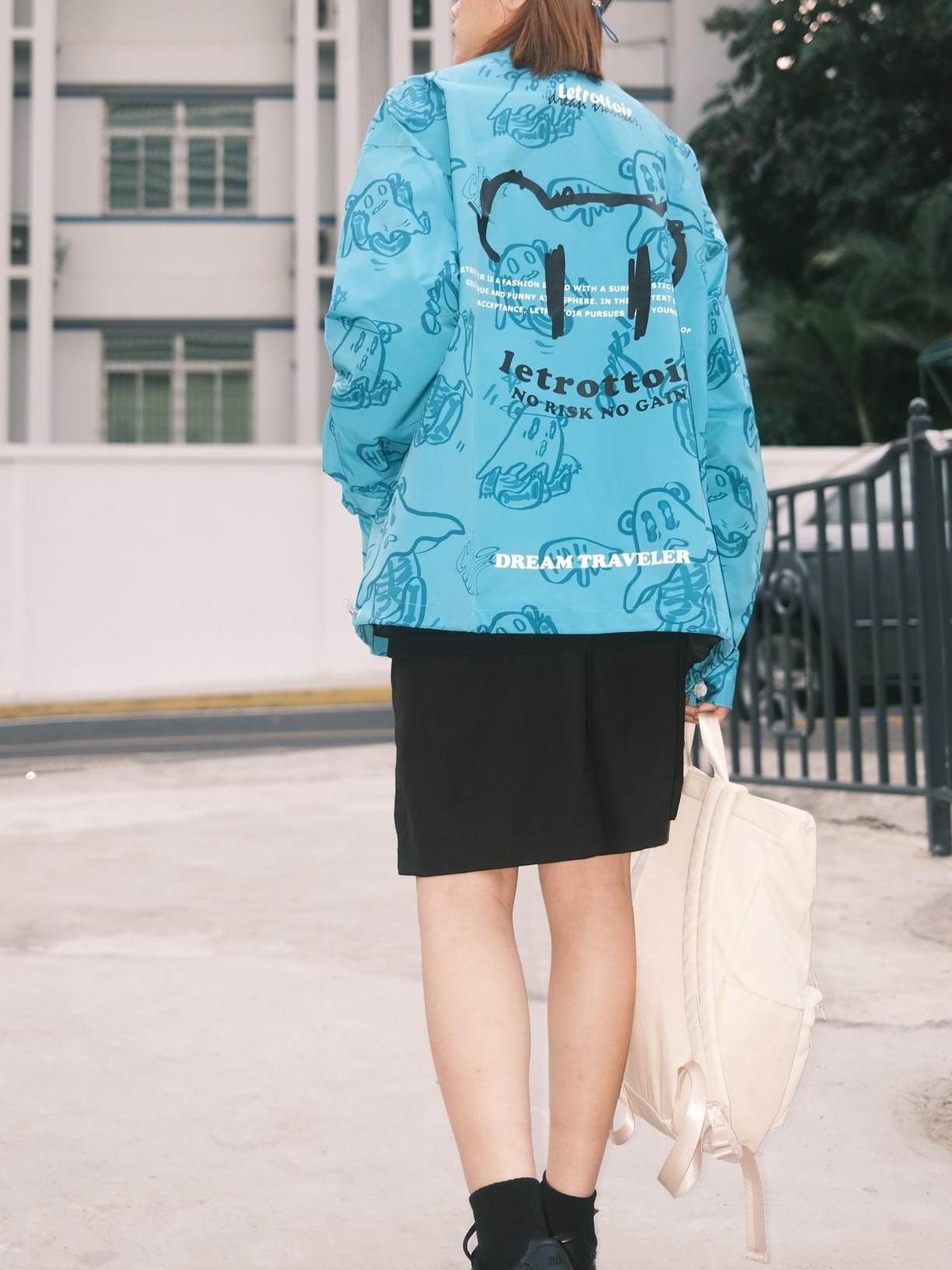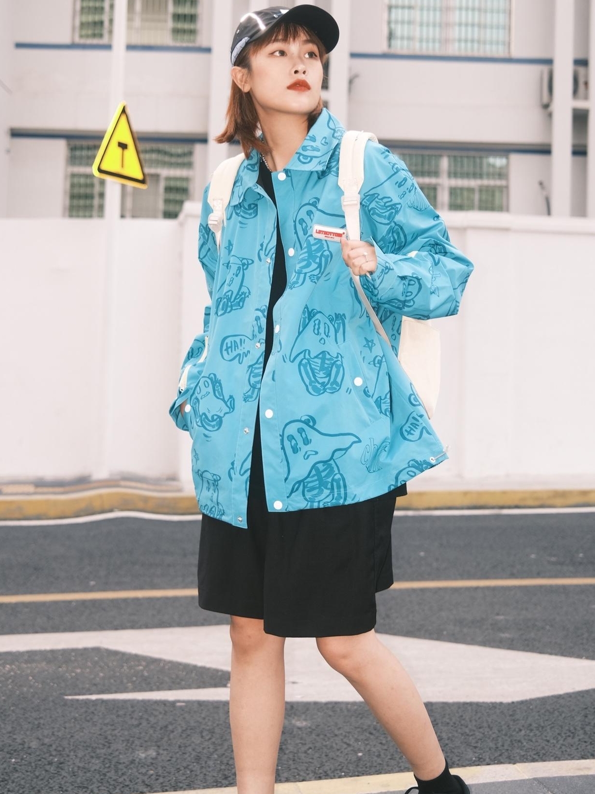 这款清新的蓝色打造而成的夹克,采用落肩宽松的版型,尽显慵懒。