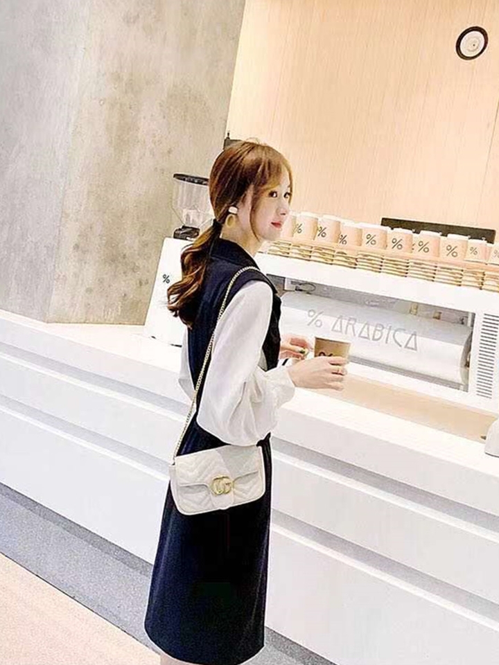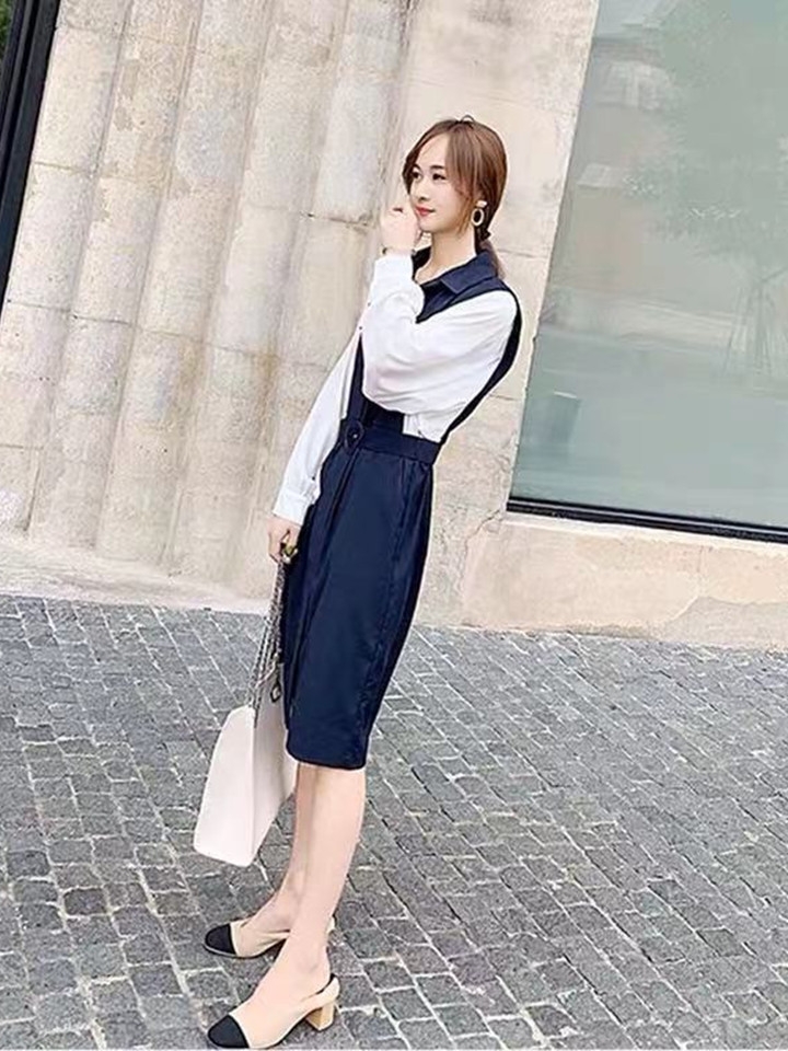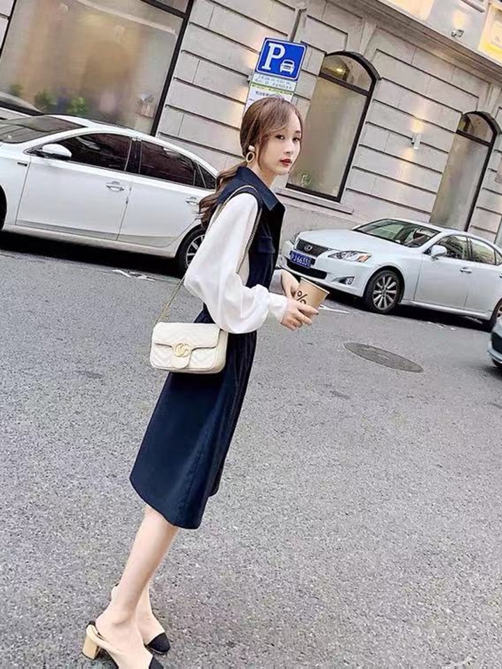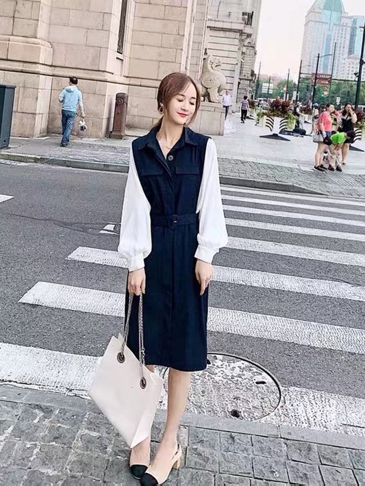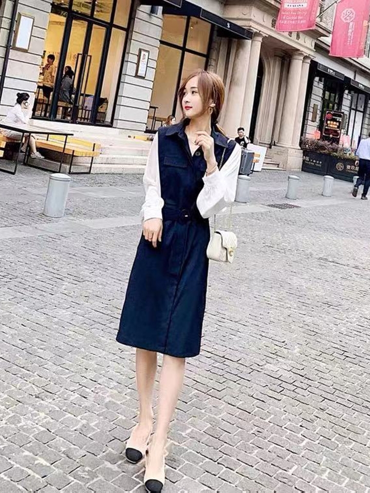 衬衫裙打底,个性时尚,修身收腰,丰富的视觉层次,活力清新,优雅大方,上身很显气质。