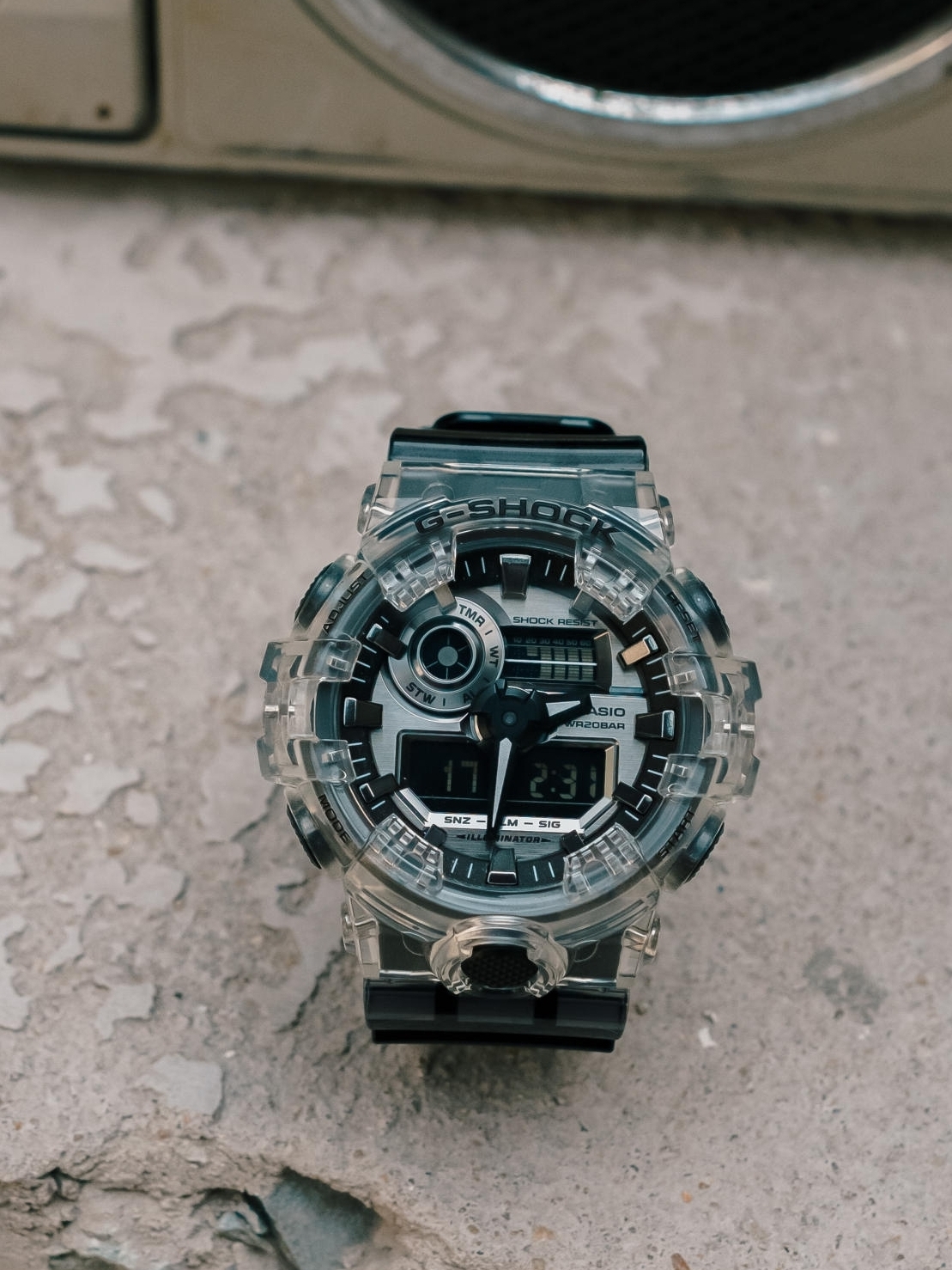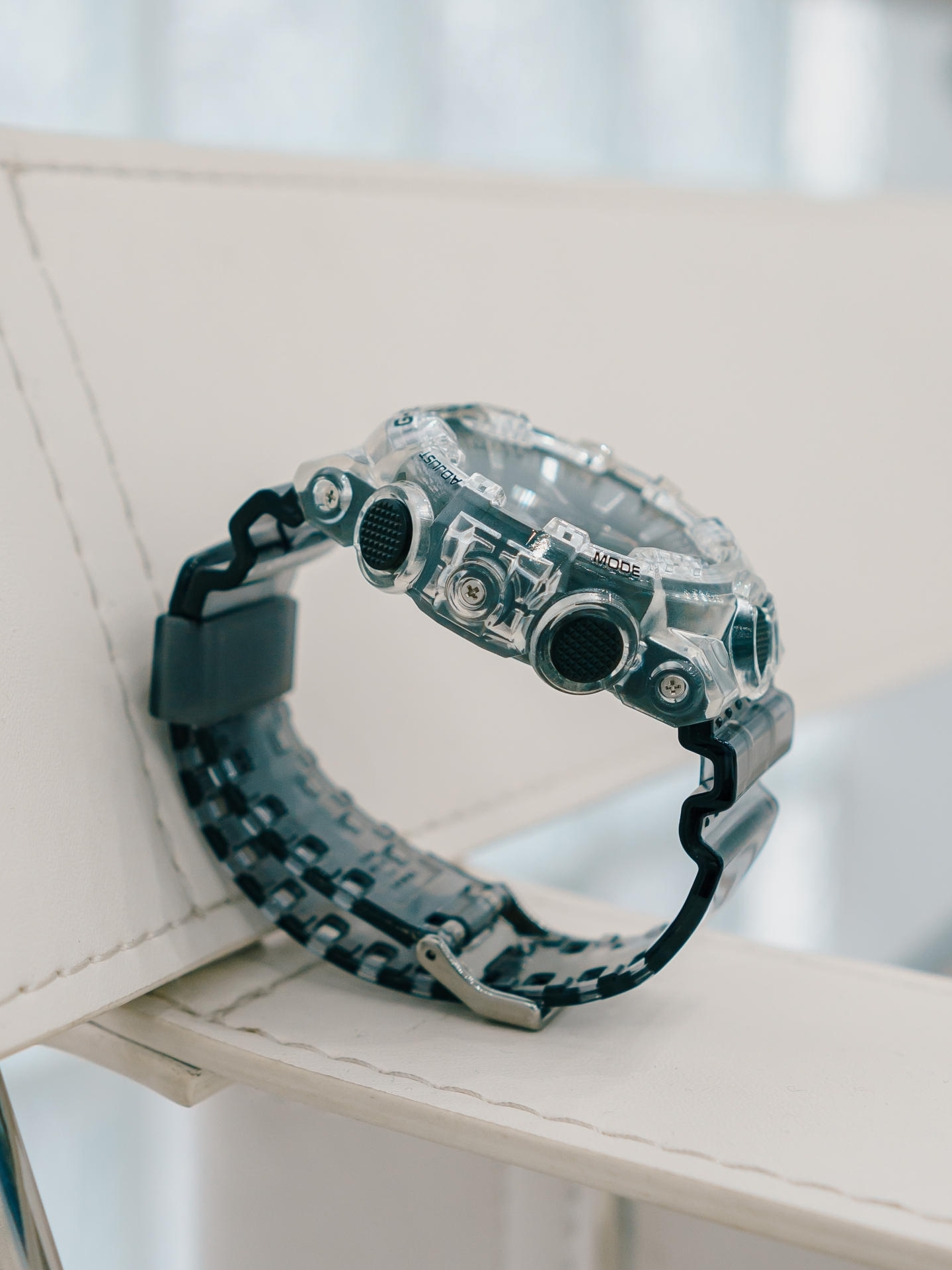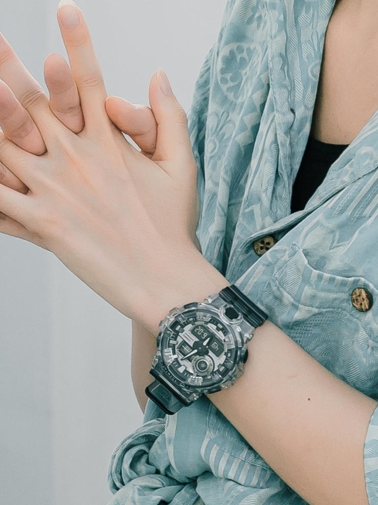在表盘处加入迷彩纹理,突显丛林冒险家的冷静与睿智,以指针与数字双显的大表盘GA-100为设计原型,GA-100CF采用军绿迷彩表盘搭配金色指针及刻度,将军人的荣耀铭刻在表盘的每一个细节之处,运动与潮流的结合。