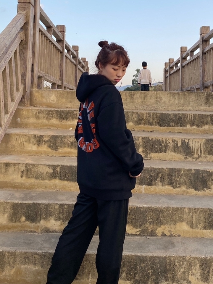 连帽抽绳的衣领设计充满了街头嘻哈感,整体为简约时尚的风格,胸前的圆形印花与背后的印花切合街头嘻哈感。