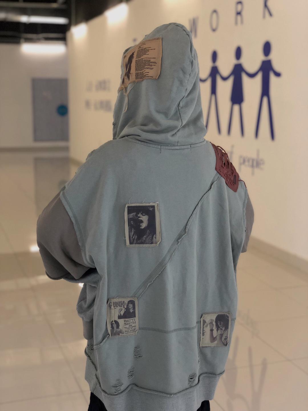 撞色拼接设计,个性十足,复古印花,彰显时尚个性,宽松卫衣,穿着舒适自在,个性破洞设计,时尚潮流,格纹设计,增添复古气息,胸前贴布设计,个性十足。