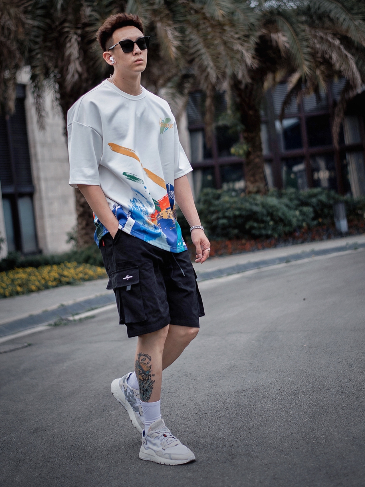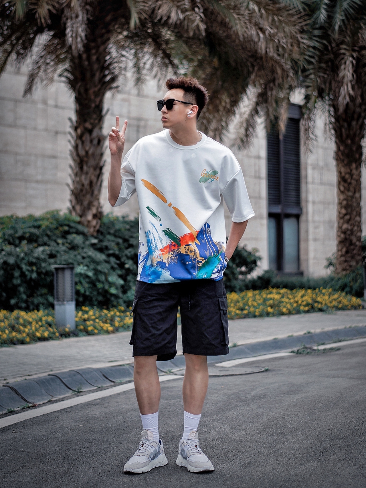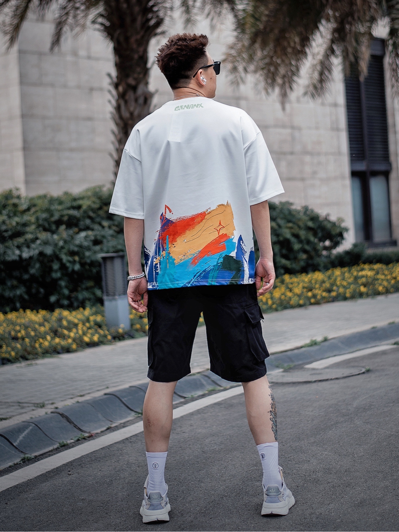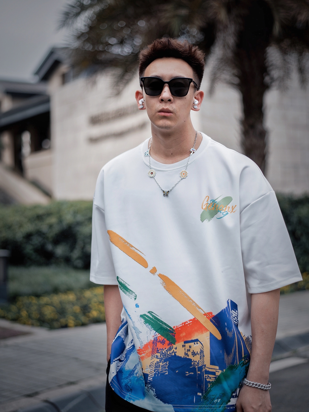此次推荐的这款短袖T恤,最大的设计亮点就是采用创意的涂鸦拼接设计,但是与以往不同的是区别传统的强烈的视觉冲击效果,在颜色的选取上面采用同一种风格的色调,在丰富视觉效果的同时,也用一种颜色层次的变化感彰显出文艺清新。此外经典的螺纹圆领设计,又带有一种趣味的时尚感。