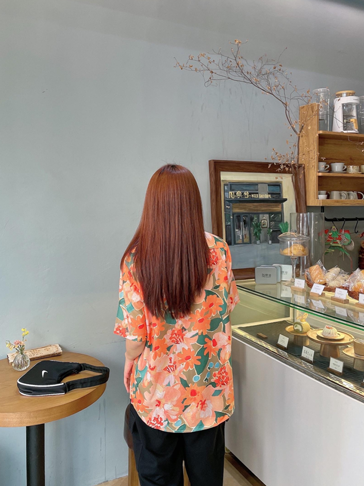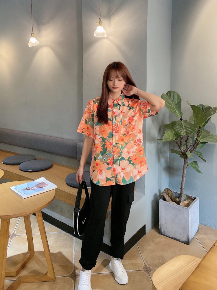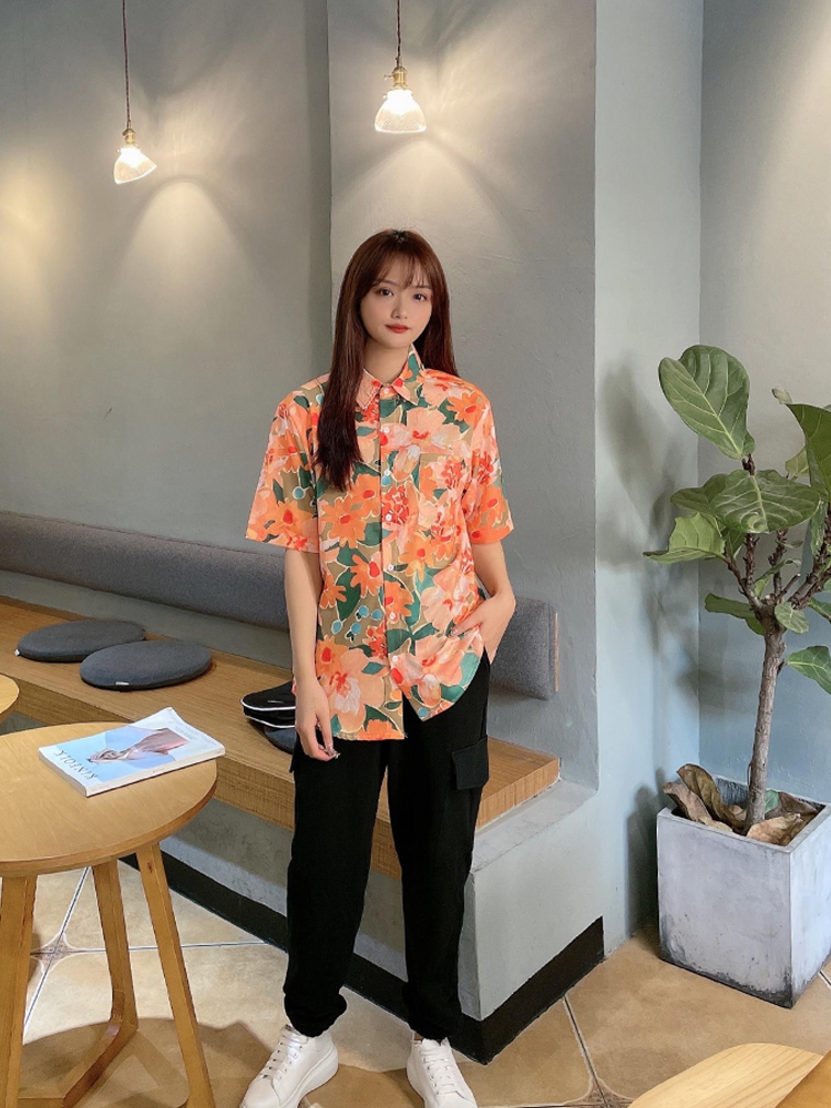 这款衬衫充满了复古慵懒风,鲜艳的橘黄色,搭配上清新的绿色,在视觉上带来时尚的气息,在阳光下看十分凸显白皙的肤色。