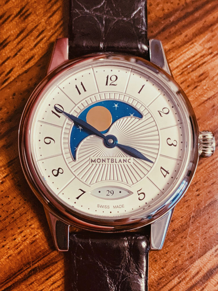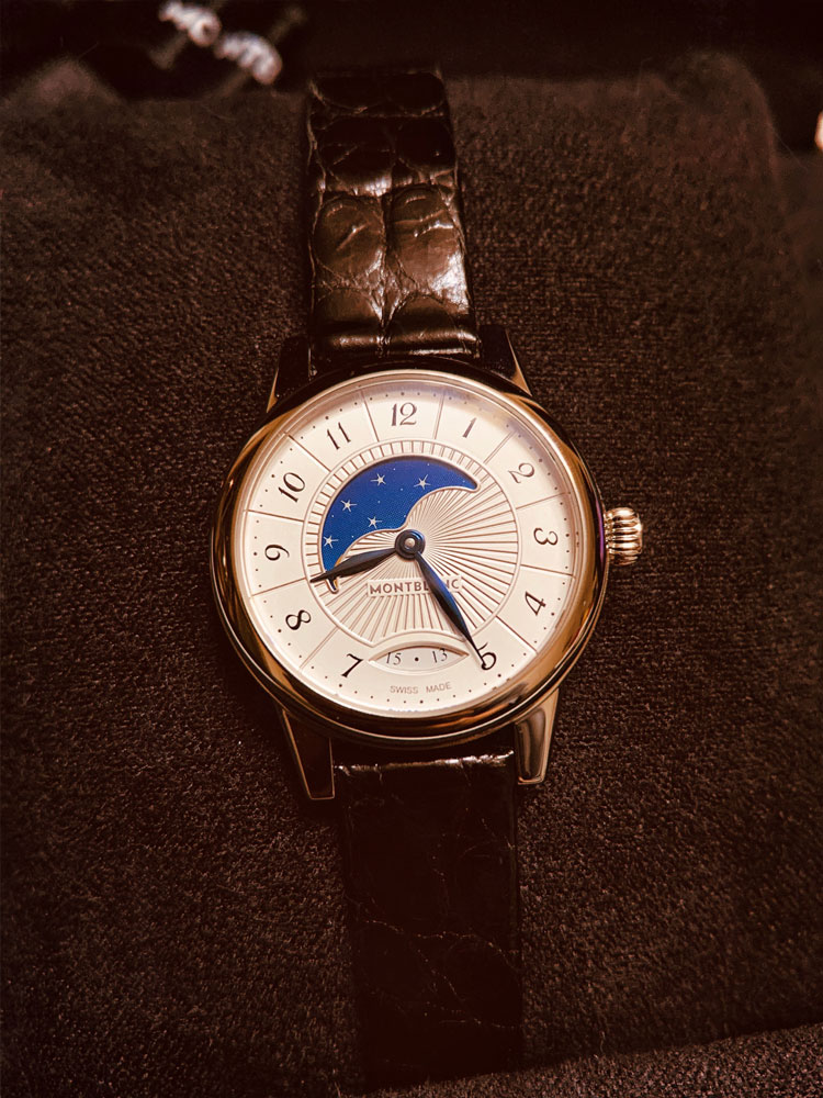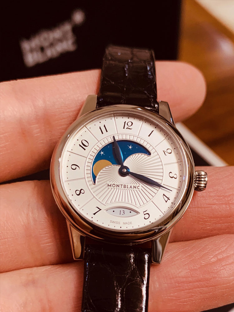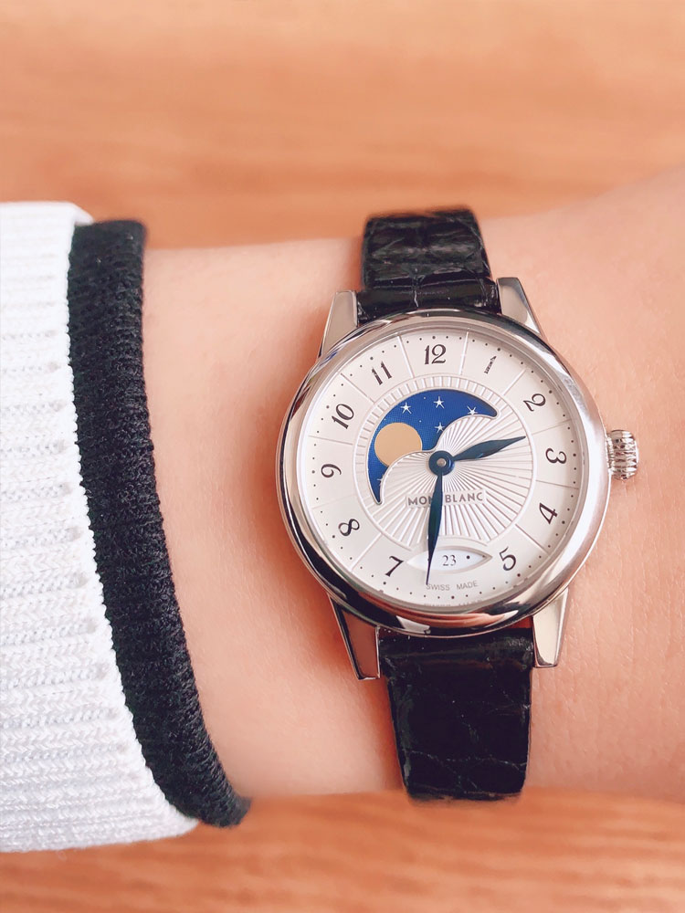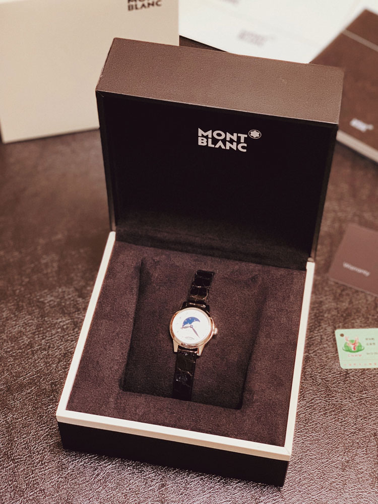 这款万宝龙腕表采用精钢材质打造的表壳,搭配经典的圆锥形洋葱头旋入式表冠。黑色的表带,佩戴凸显手臂白皙。