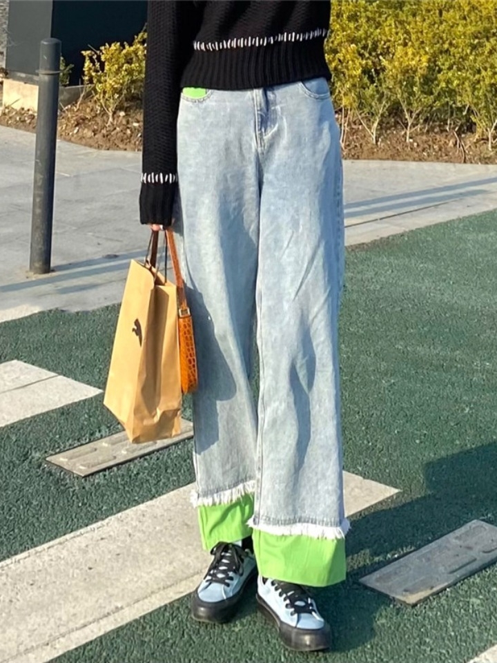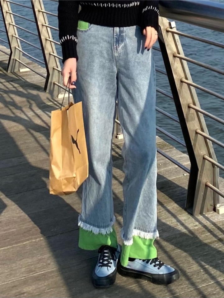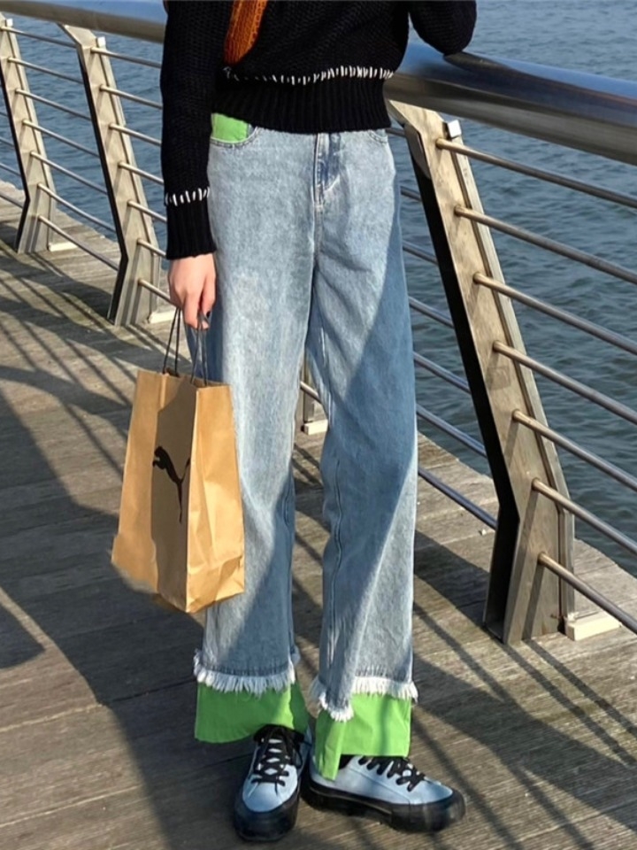 这款原创设计的牛仔裤,面料细腻,超自然的颜色,舒适透气。撞色拼接,完美打破了纯色的沉闷,前卫时尚。可以搭配球鞋,造型感十足。