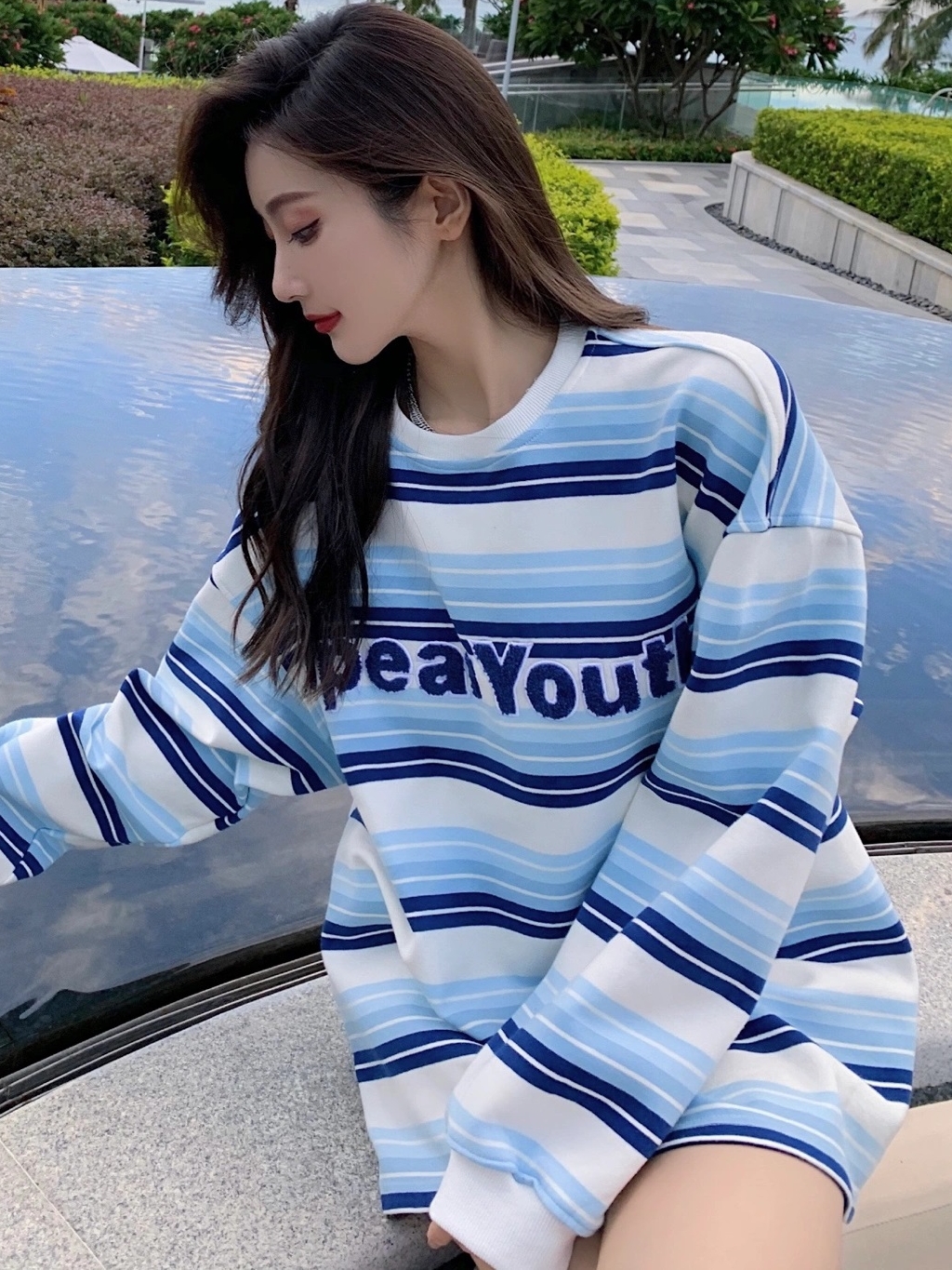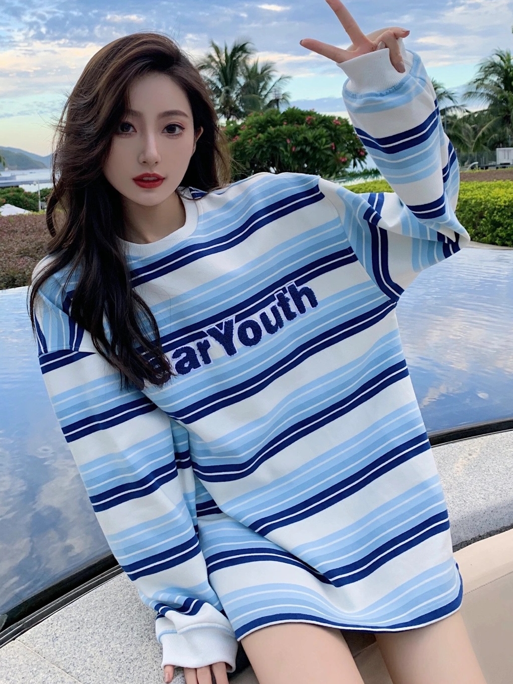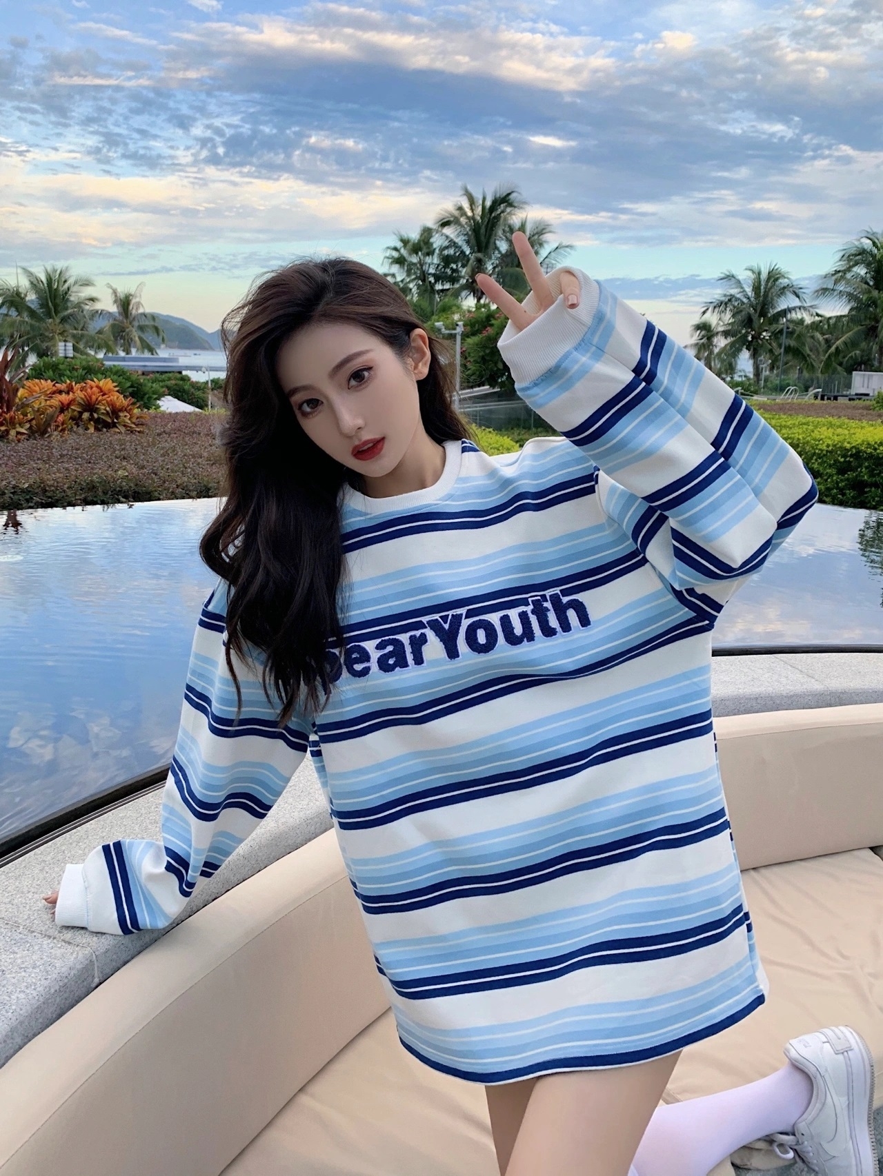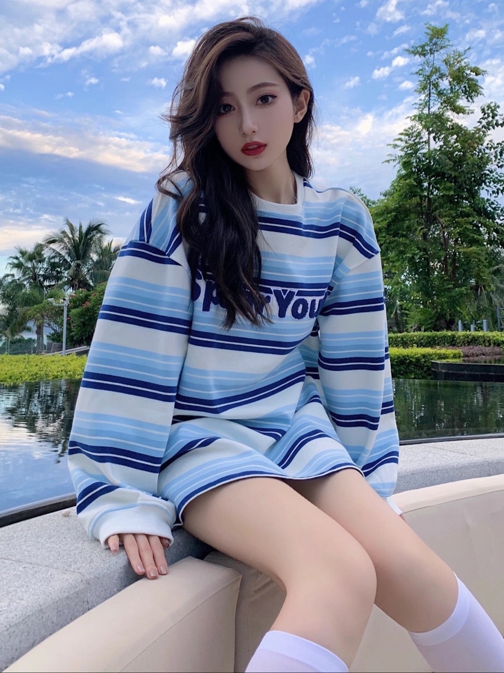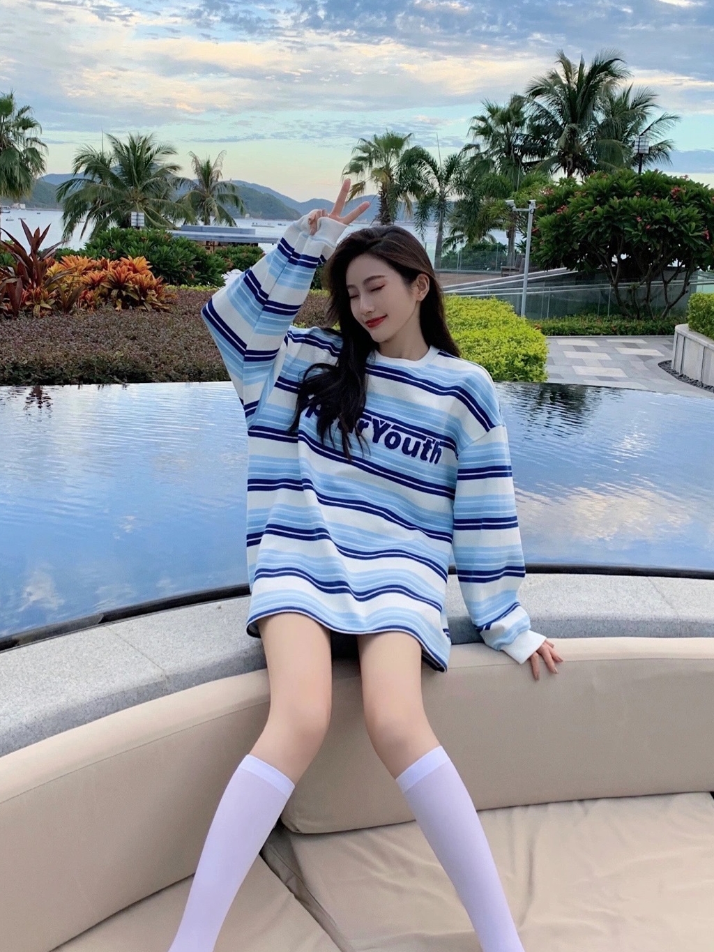这种宽松大大的版型的衣服,上身效果是非常显瘦的,很有韩范,下面搭配一条短裤就可以轻松打造下衣失踪的感觉。