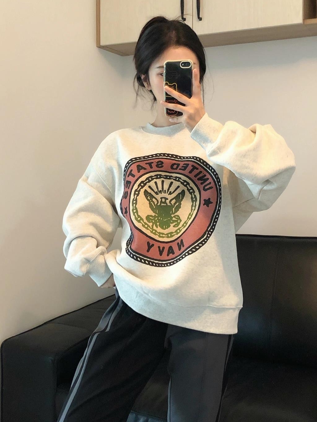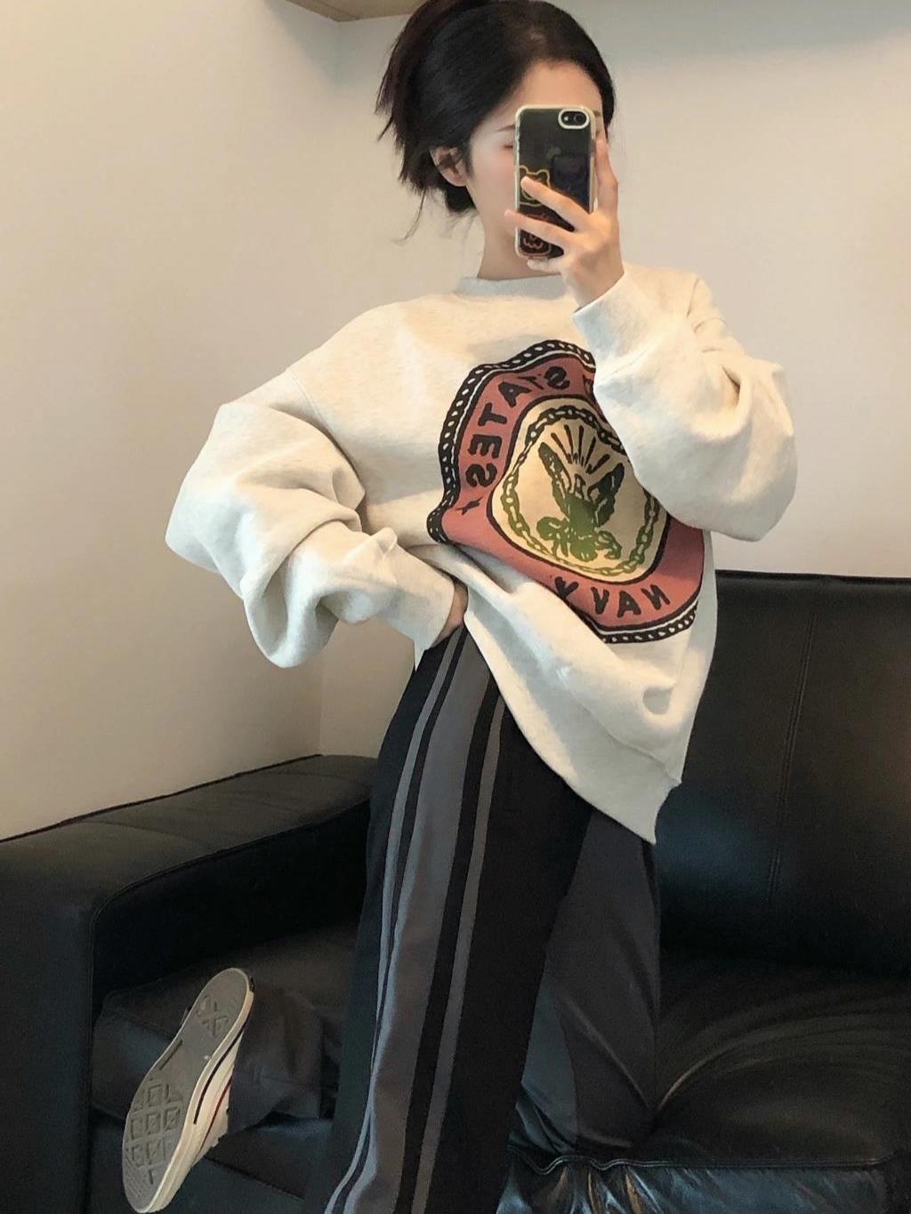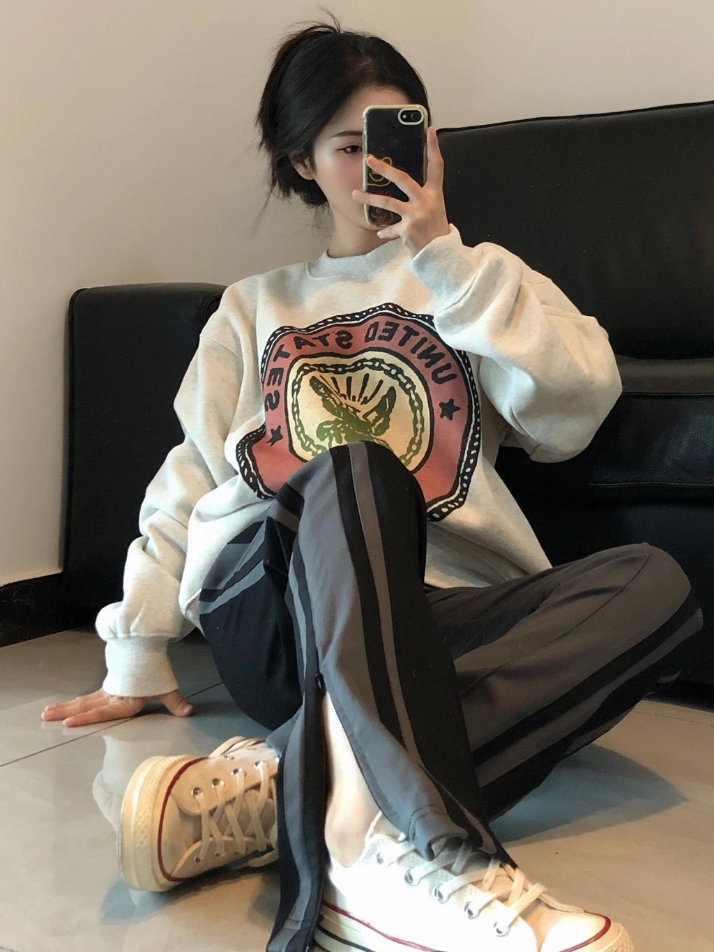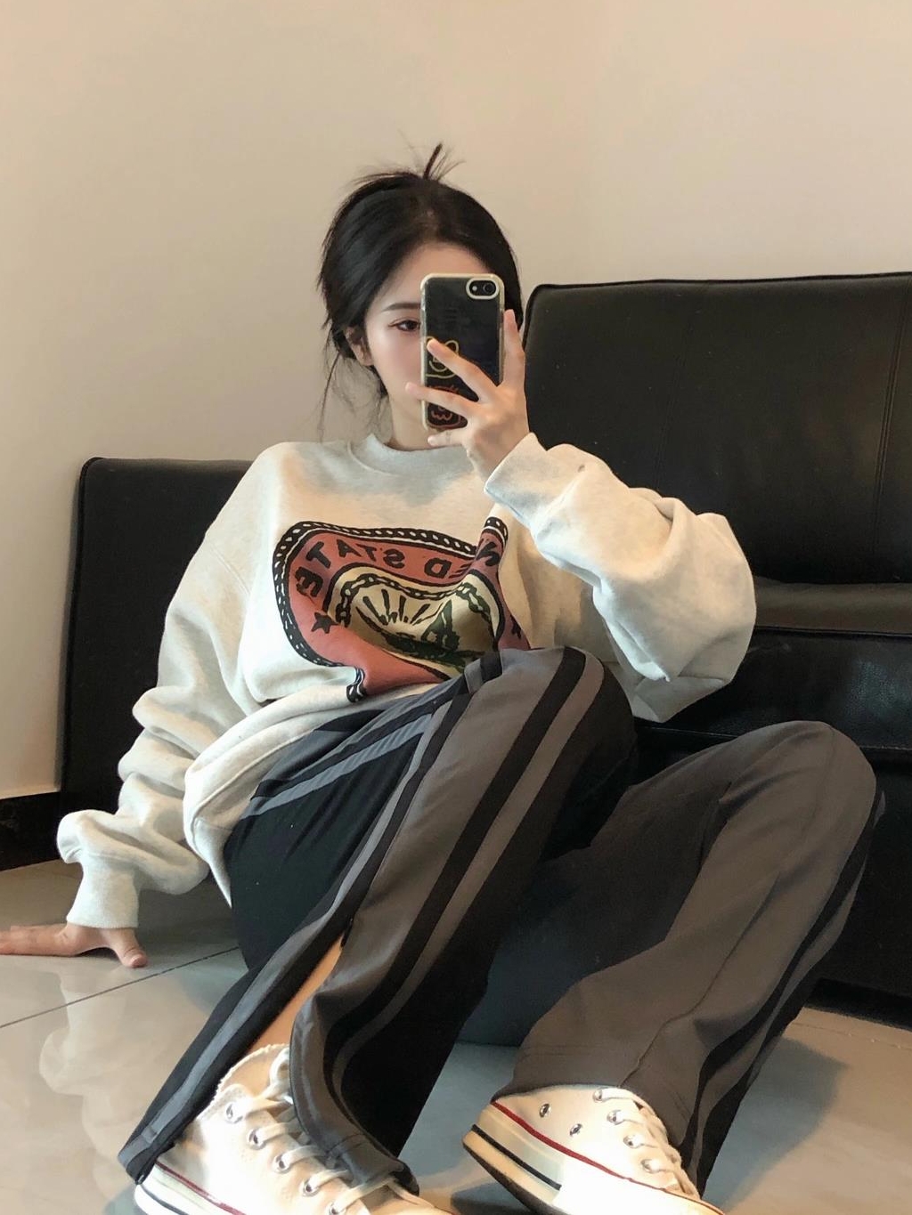 美式复古风印花特别,不显胖,软绵绵的质感,最适合作为情侣衣了,拥抱都是温暖的,搭配运动条纹撞色休闲长裤,超级无敌螺旋显瘦很百搭。