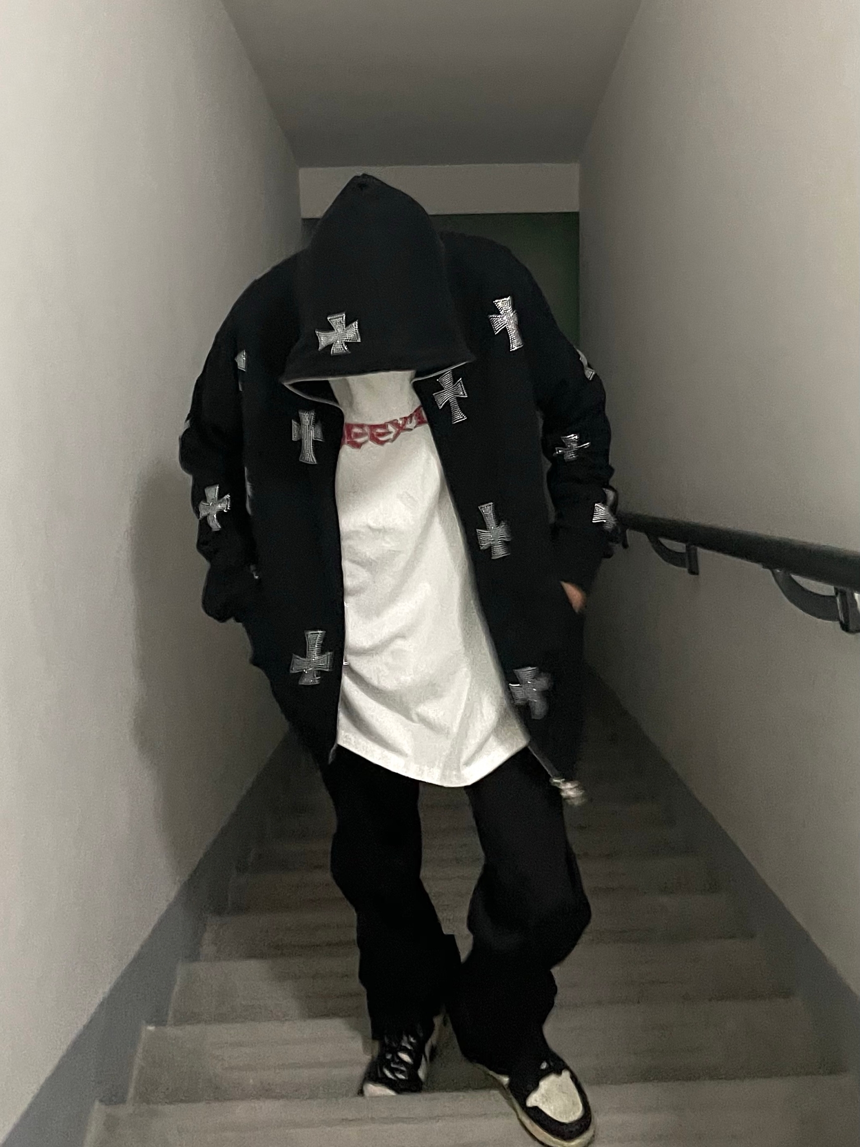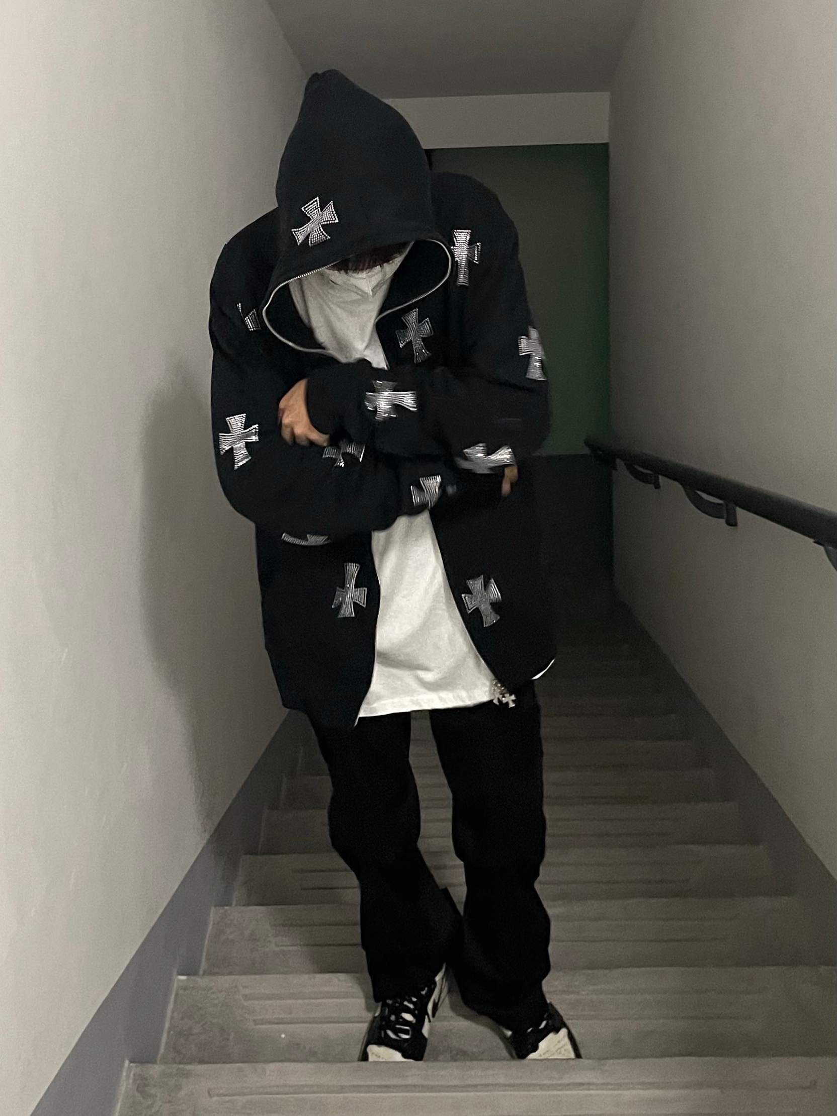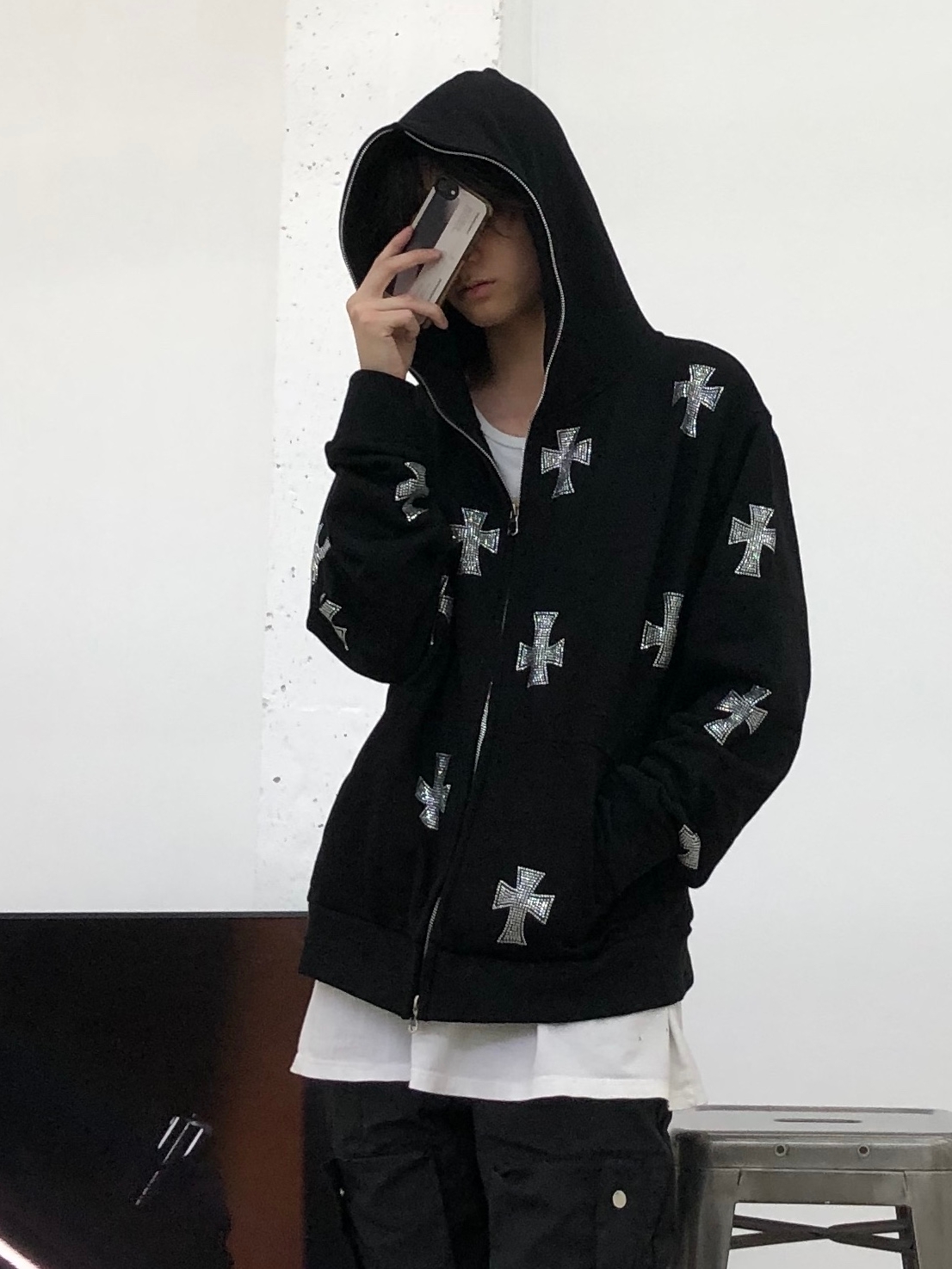 时尚都市风格的圆领套头卫衣。衣服前片采用光泽感烫钻勾勒出醒目张扬的十字架标志,并在两边袖子上呈现出对称立体的衍缝效果。
