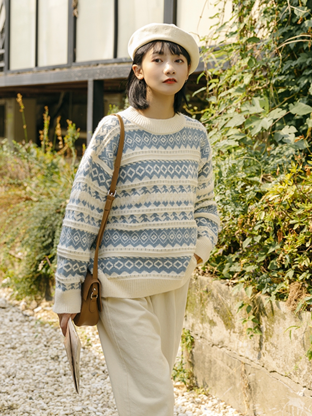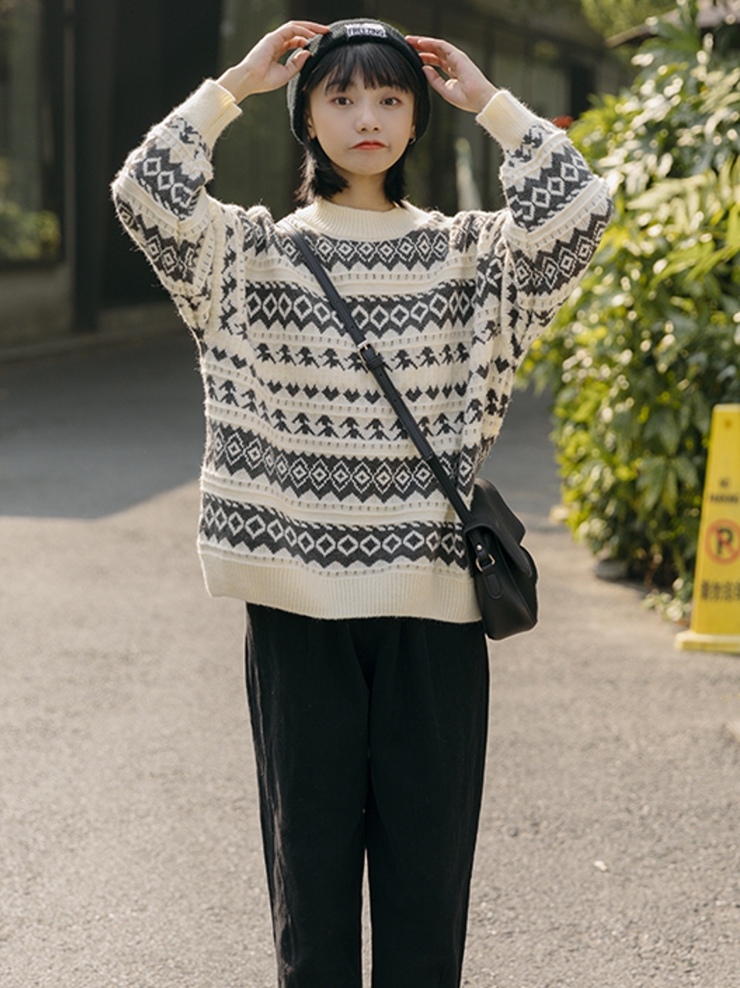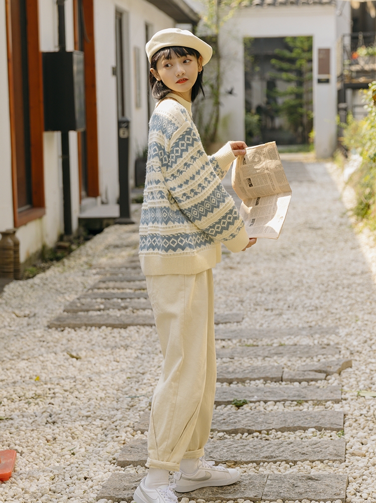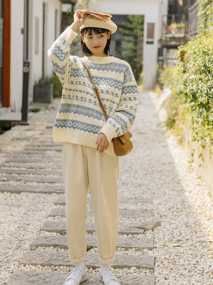日系小清新毛衣,下装可以搭配一件同色系的休闲,使整体风格一致,看起来时髦又养眼。