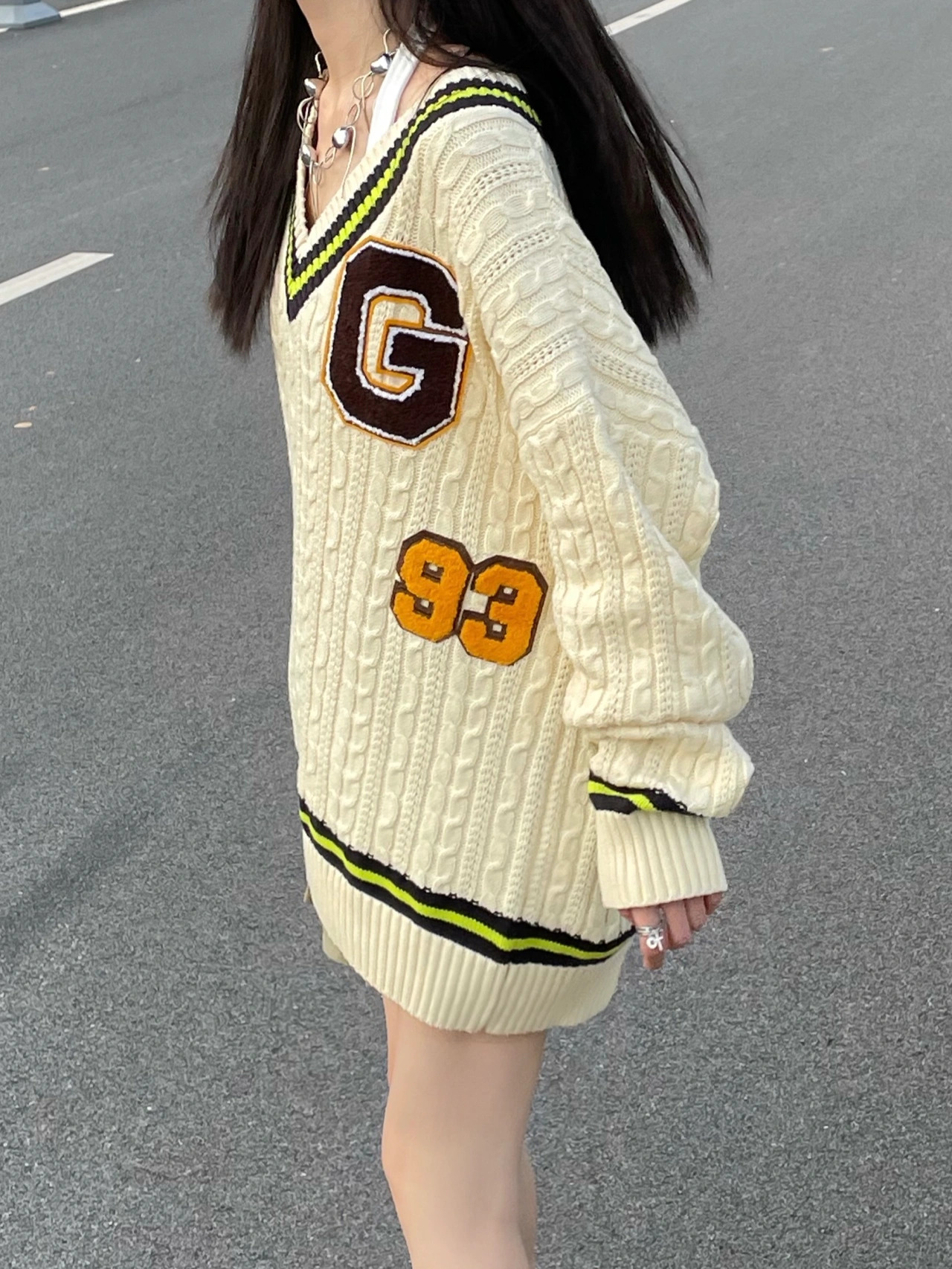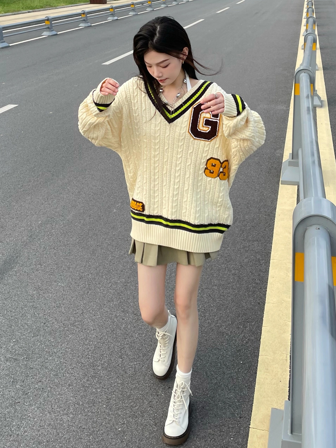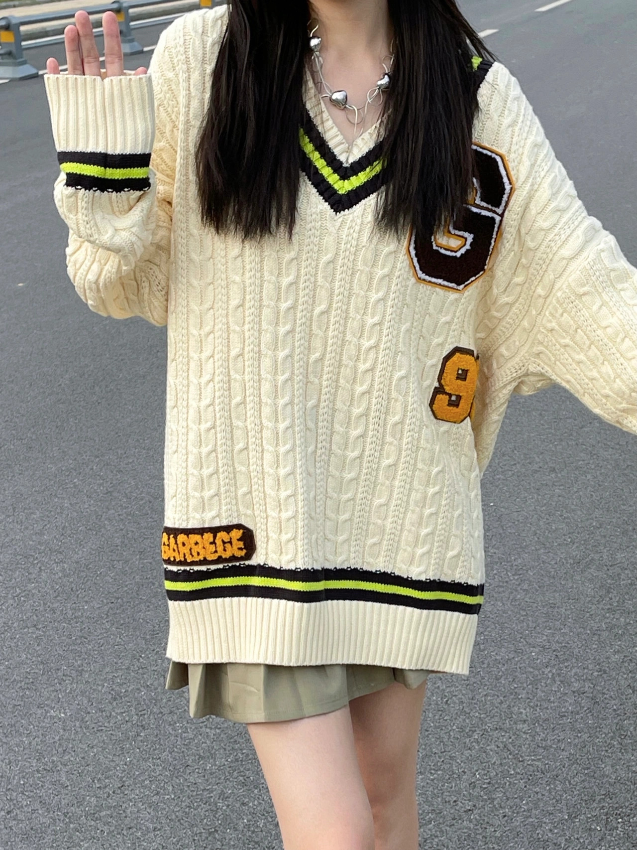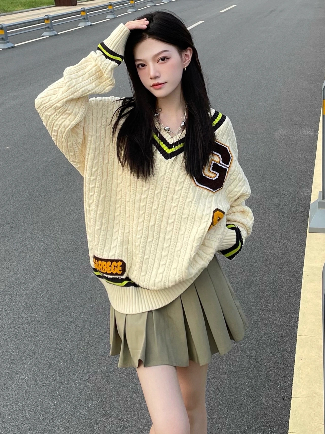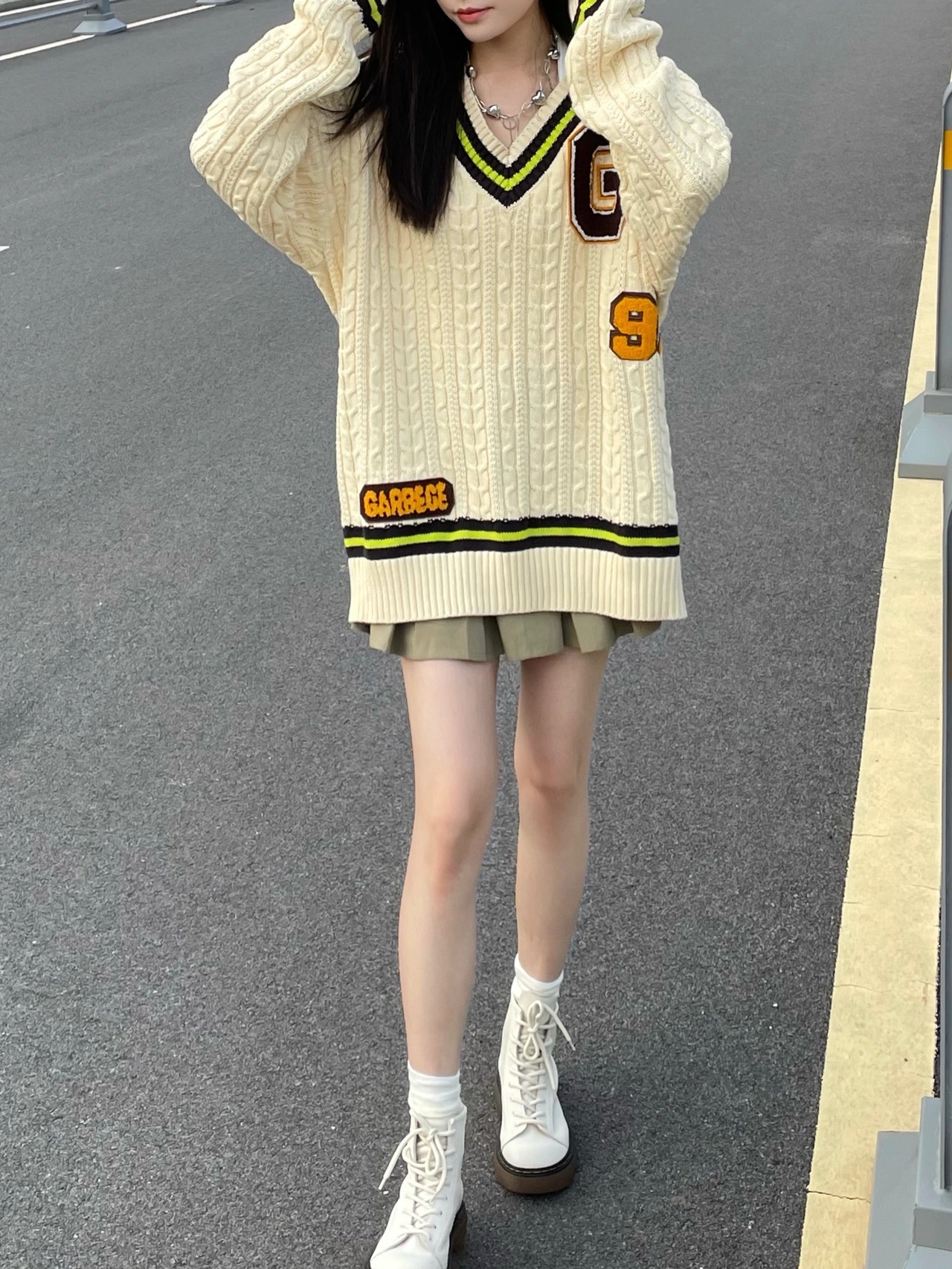 学院风针织毛衣,搭配牛仔背带裤还蛮减龄的,小V领设计,完美修饰颈部线条,衣身采用撞色拼接,打破设计的沉闷感,袖口和衣摆罗纹锁边,立体修身剪裁既能贴合身形,又不会有束缚感!