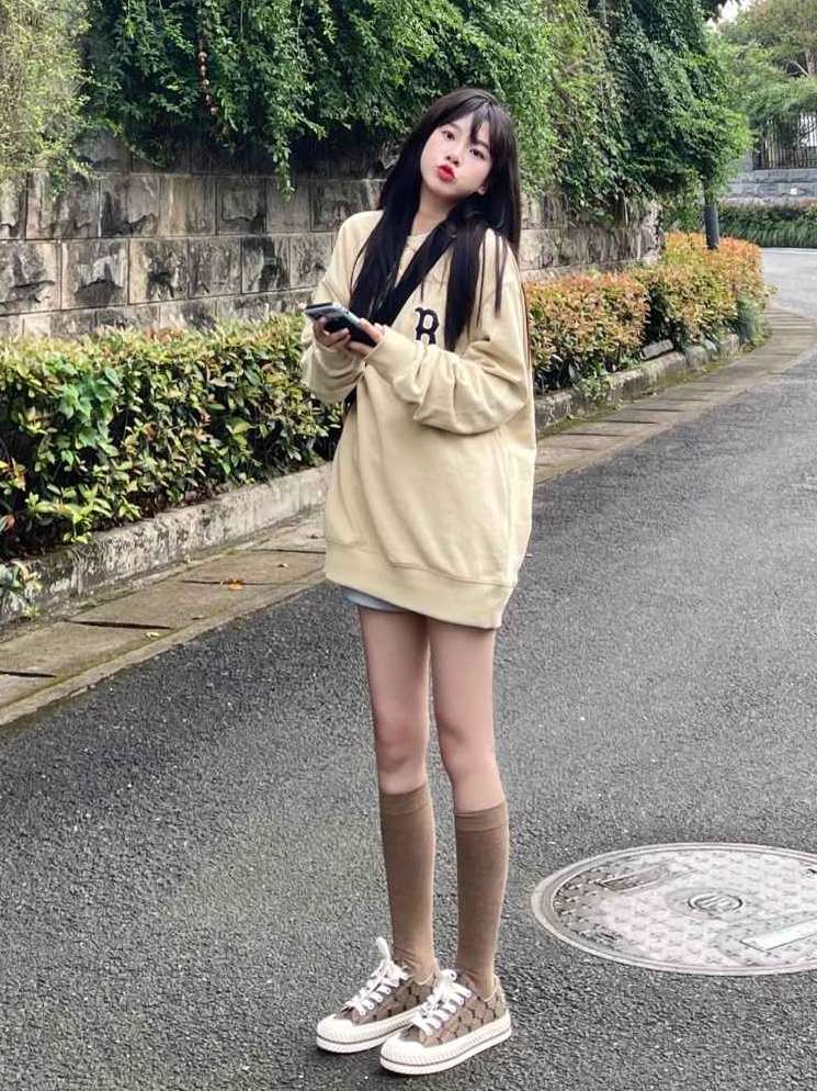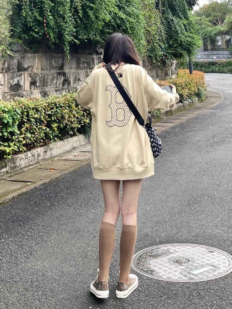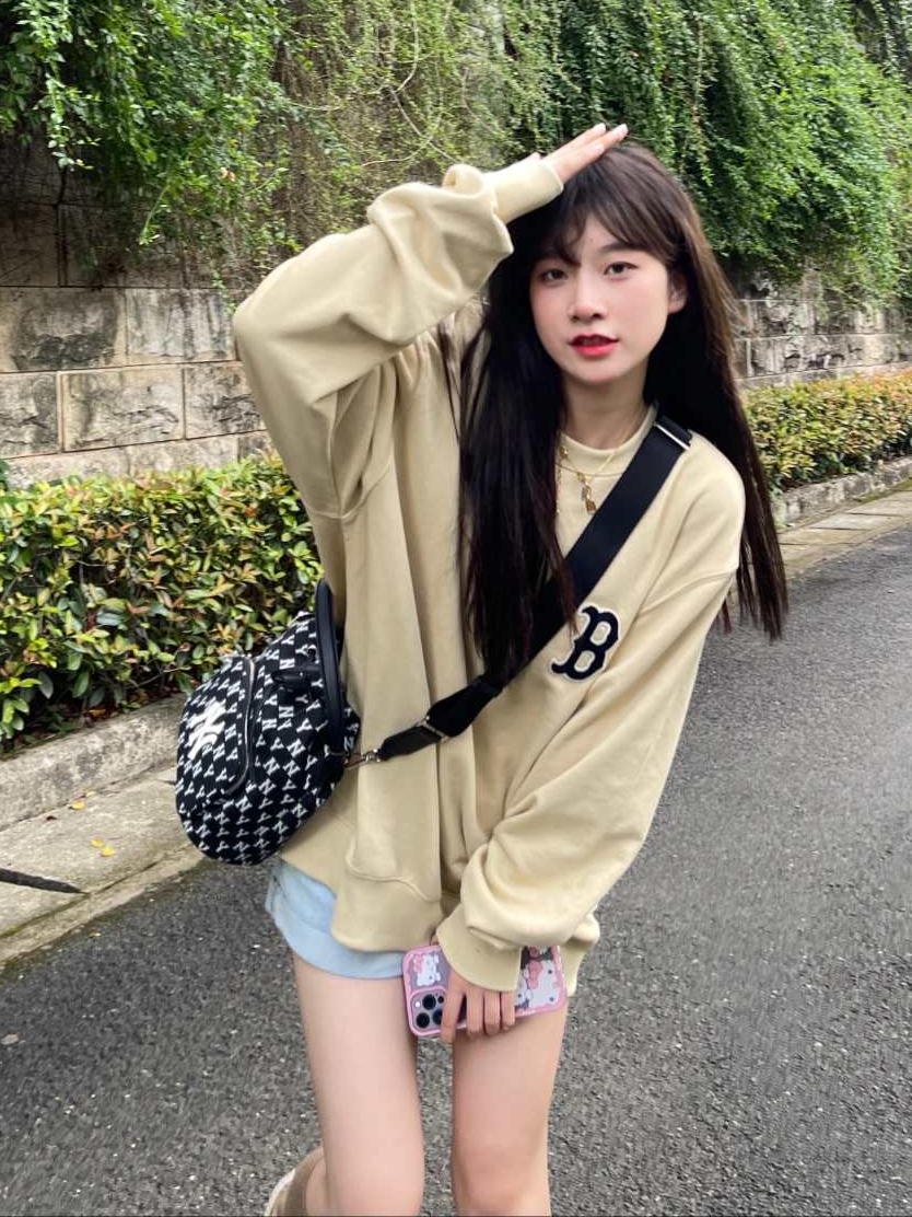 它是充满个性的一款卫衣,简约的圆领,露出白皙锁骨,时尚百搭,胸前的贴布图案,彰显品质,长袖设计,修长手臂线条又不失女人味,宽松的版型,完全不挑人穿喔。