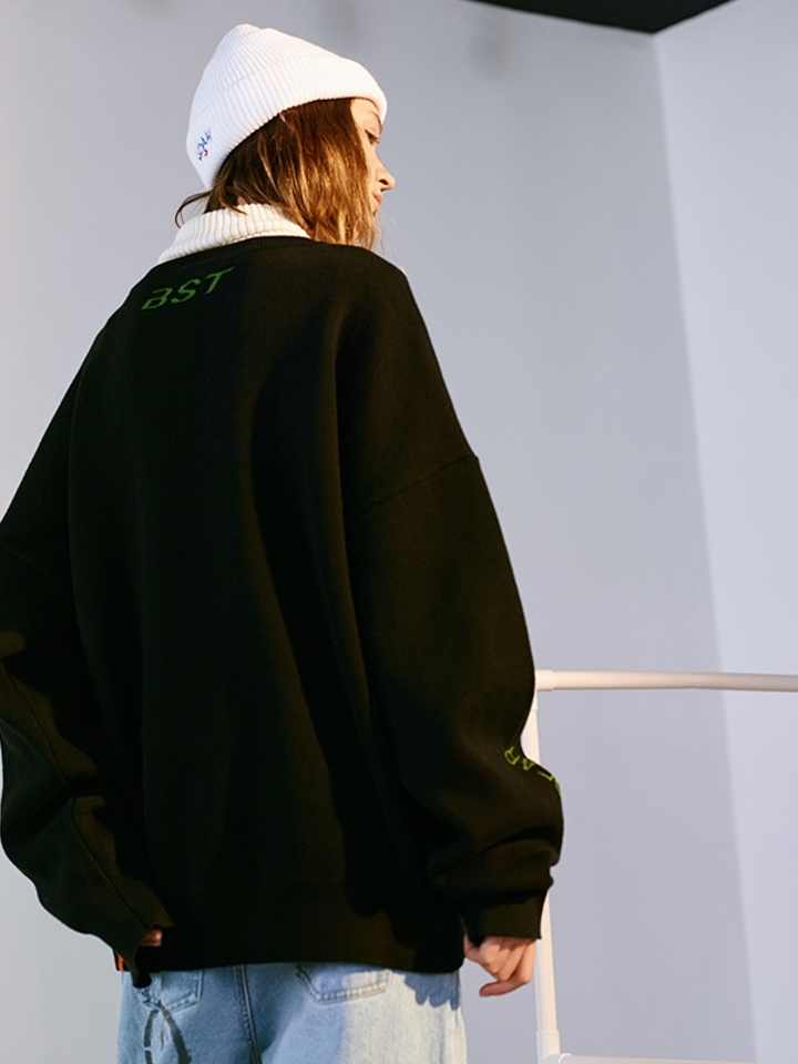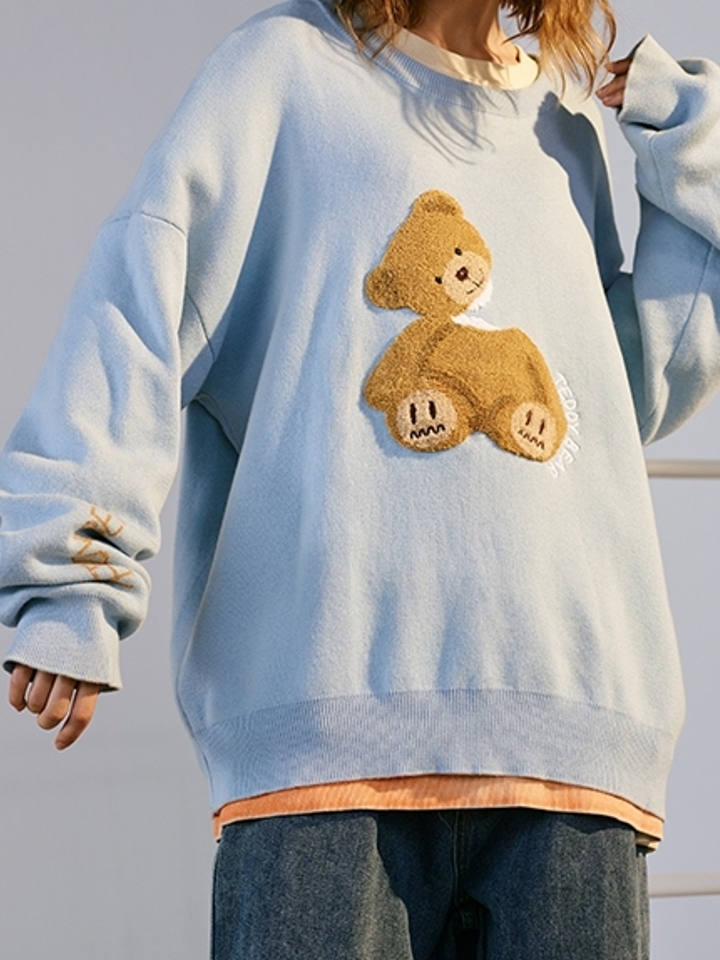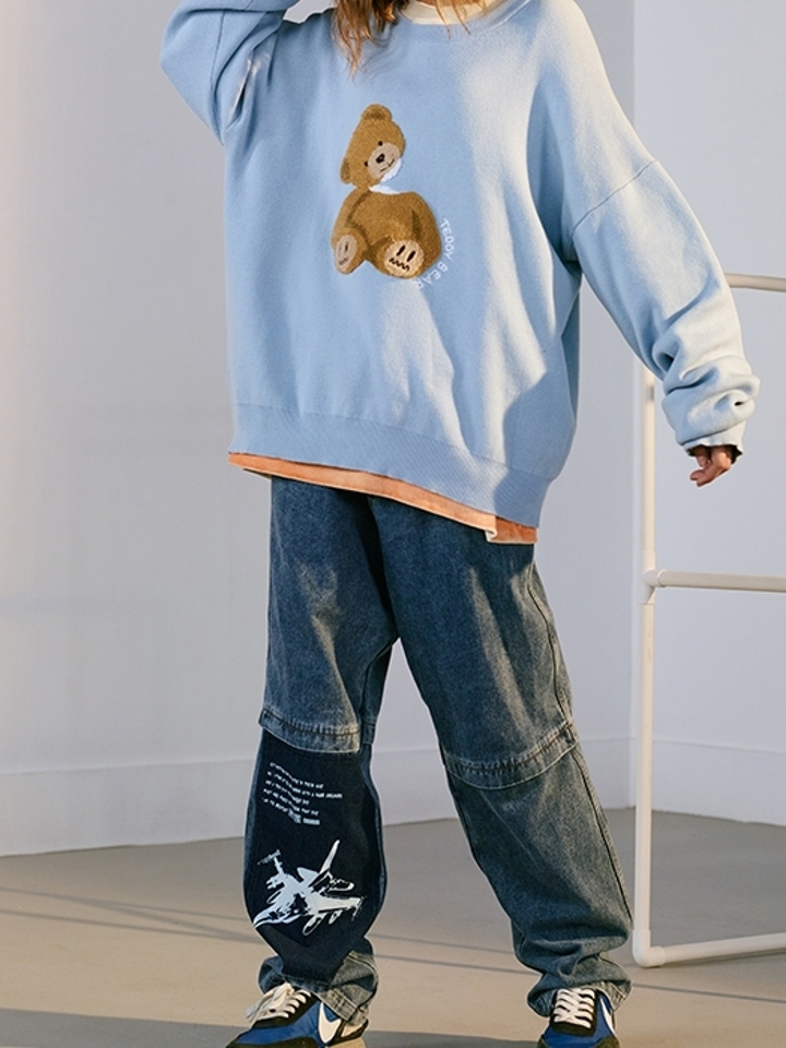 宽松的版型穿着休闲大方。版面以纯色为主添加撞色提花图案,圆领设计简洁,接触颈部十分亲肤精良肩部构造清晰,时尚小熊印花,潮味十足,提高整体的时尚感。