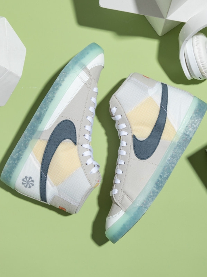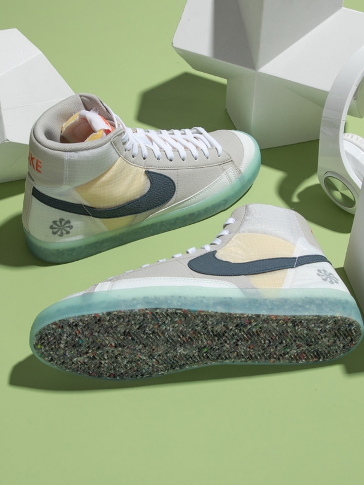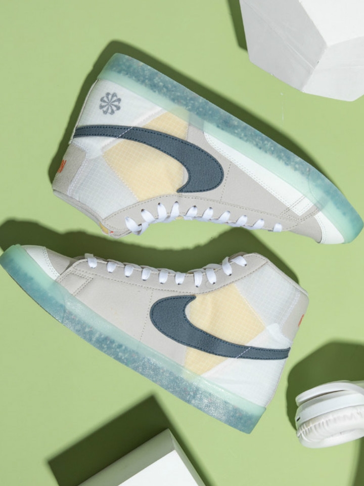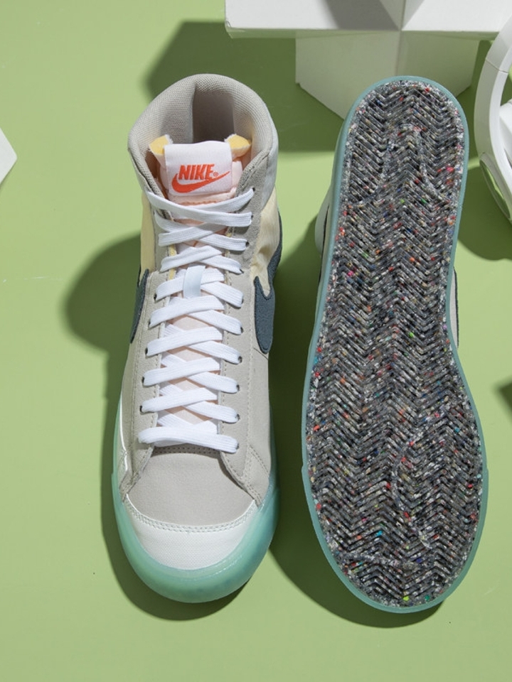 这款Nike Blazer采用可回收材料制成, 在外侧脚踝和鞋垫上印有“MovetoZero”标志。中底采用冰冷的半透明色调。