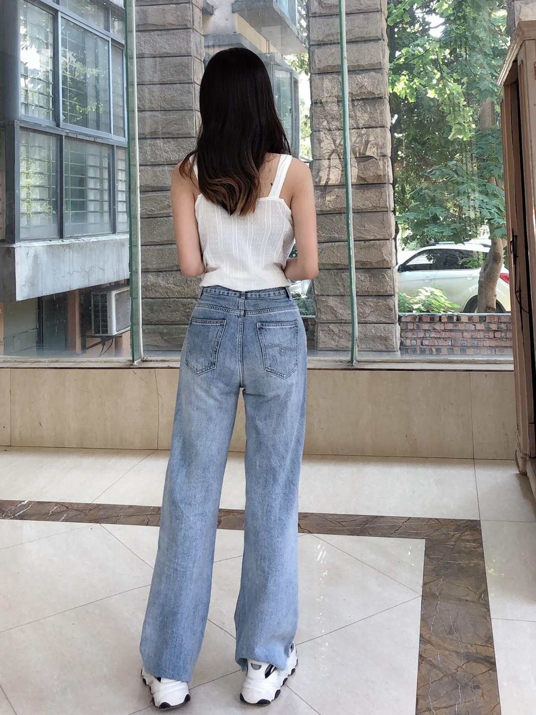 明线车缝工艺,增添线条感,高腰设计,提升腰线,拉长腿部线条,街头风十足。休闲的直筒牛仔裤,可以有效遮盖腿部的小缺陷,包容不完美的腿部线条。