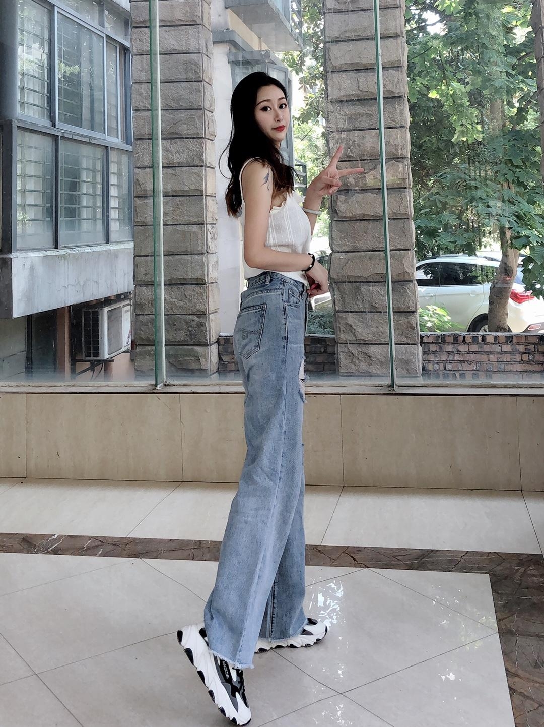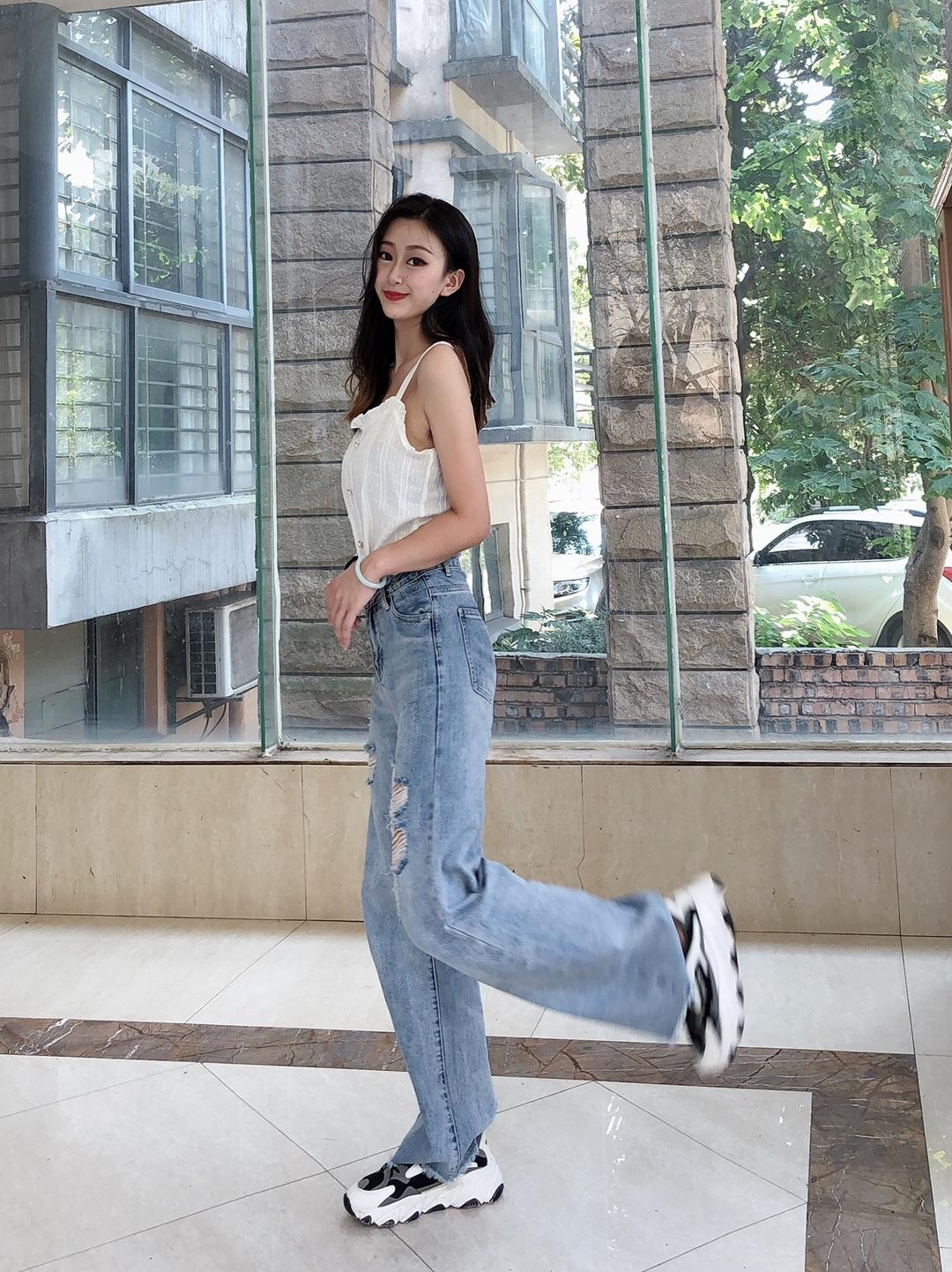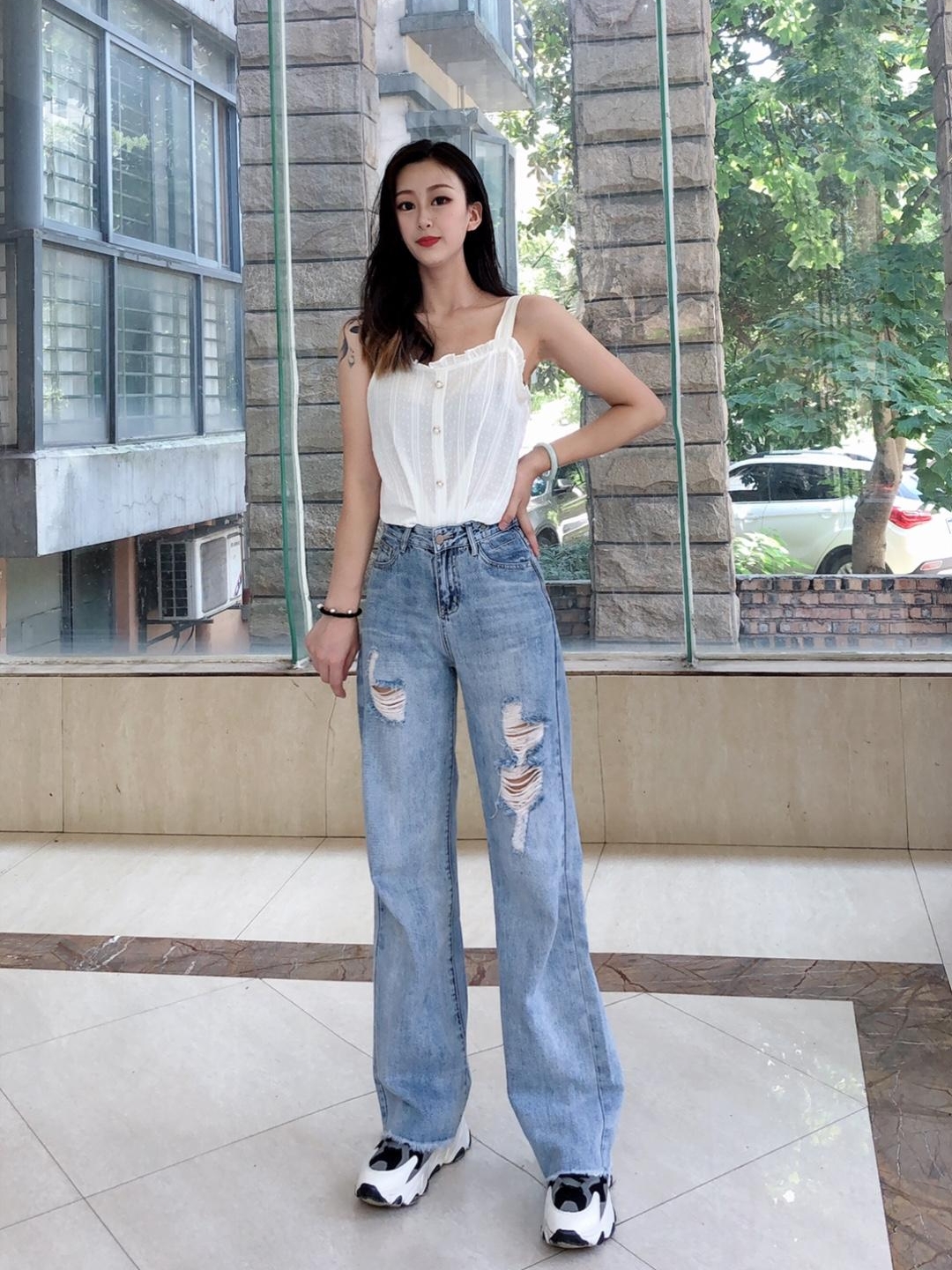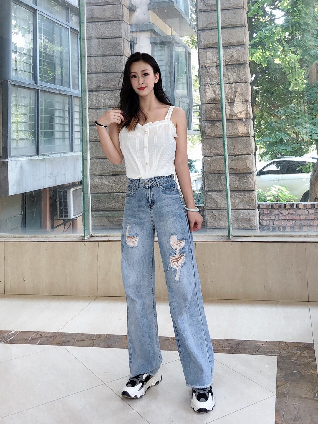 宽松的版型完全是胖美眉的福音,破洞设计有个性,直筒版型修饰腿型,即使腿型不够优美,都会非常显瘦。搭配无袖T恤与小白鞋,佩戴上墨镜,回头率肯定极速提升。
