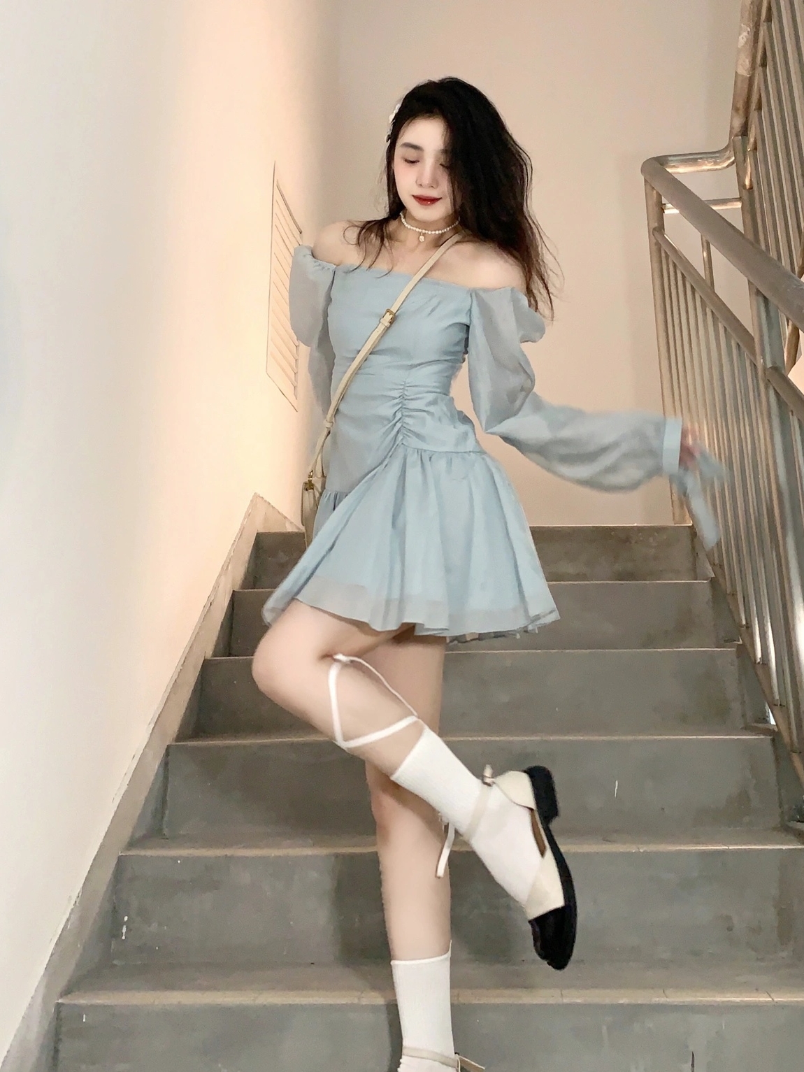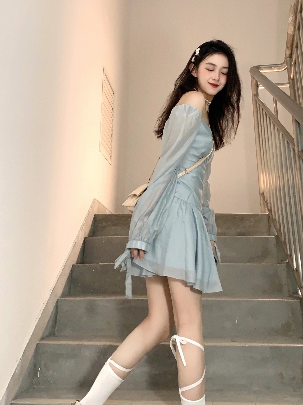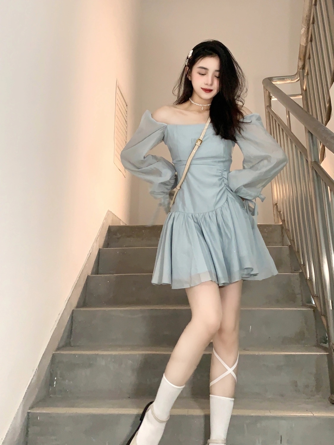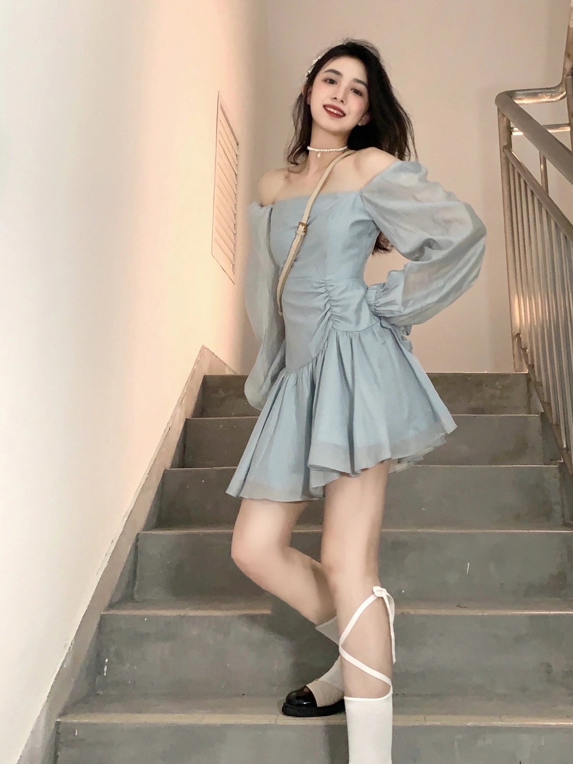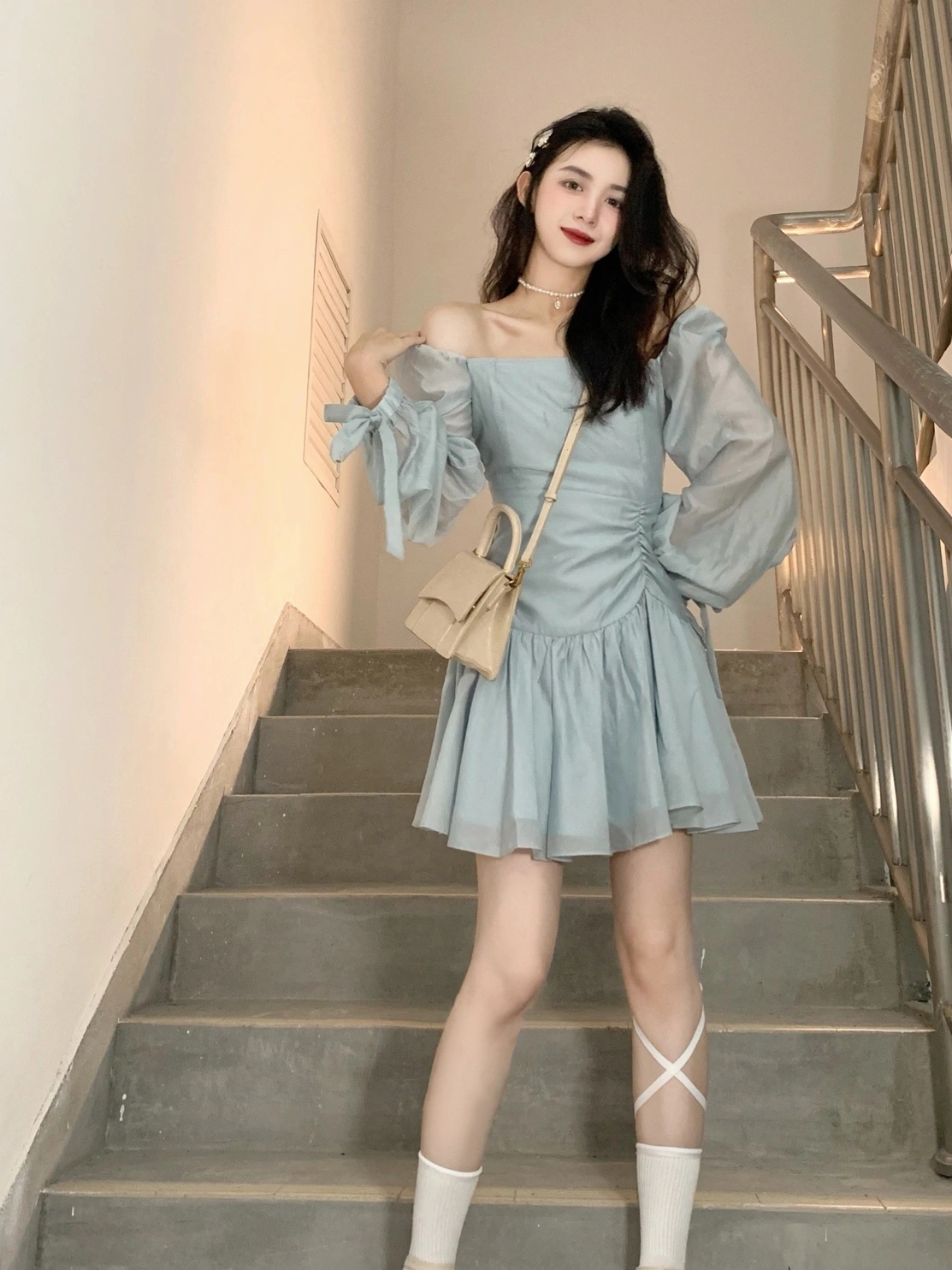 纯欲第一名必须是一字肩,回头率很高,蓝色温柔挂的,收腰褶皱设计配百褶裙摆。