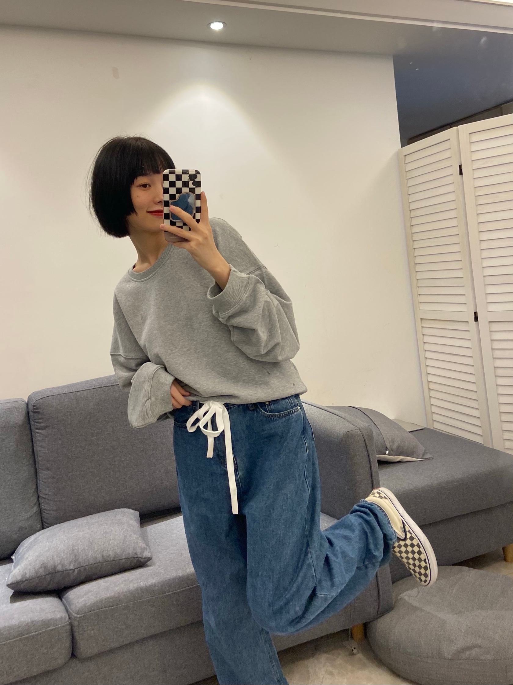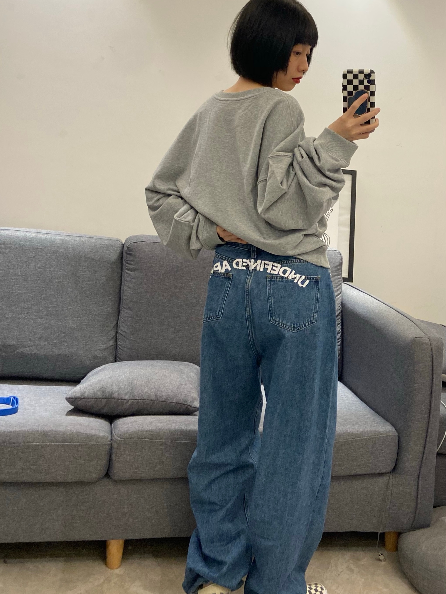 大直筒裤,大腿处比较宽松,裤口阔出。立体裁剪造就的完美版型,穿起来的时候很修饰腿型。臀围包的很好,实际上身效果非常显瘦。在水洗工艺上用了重度做旧的设计,经过多次调整才达到了满意,BF风格,很怀旧的男友中性风,帅帅的。面料很舒服,微有弹力,摸起来很顺滑。