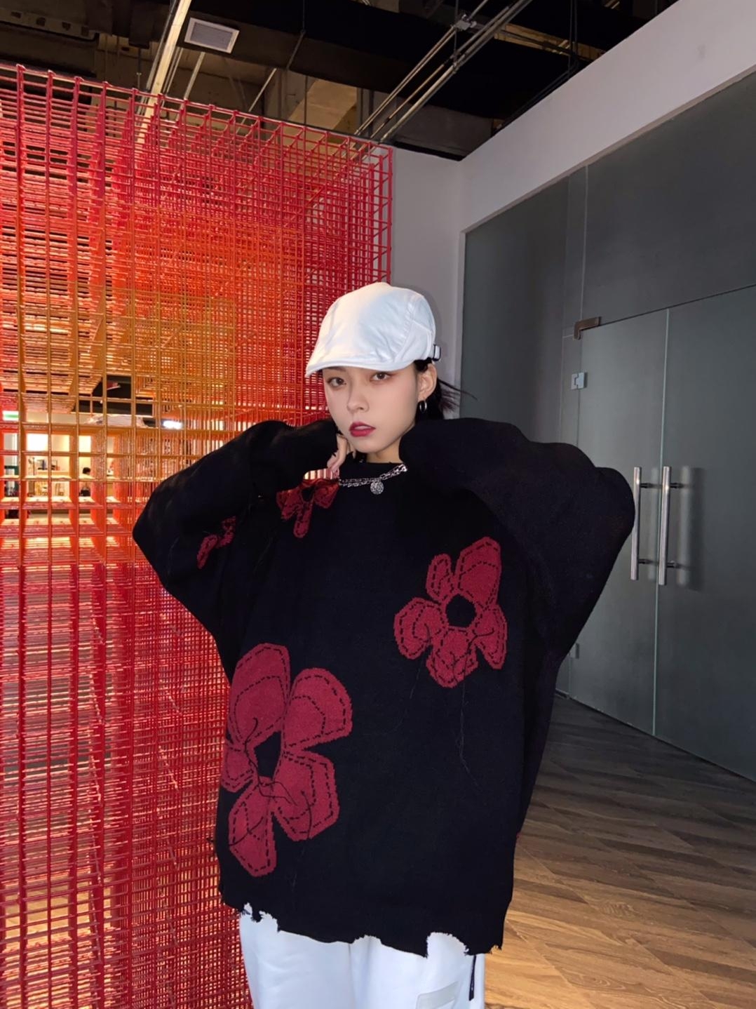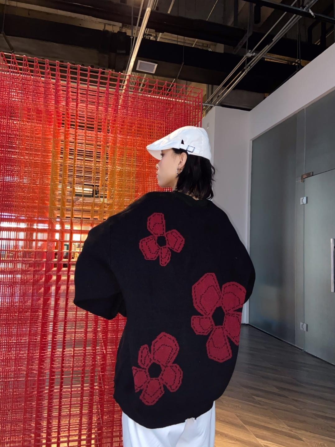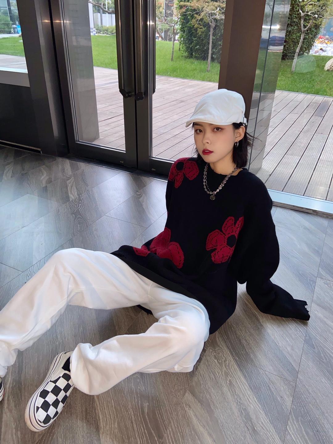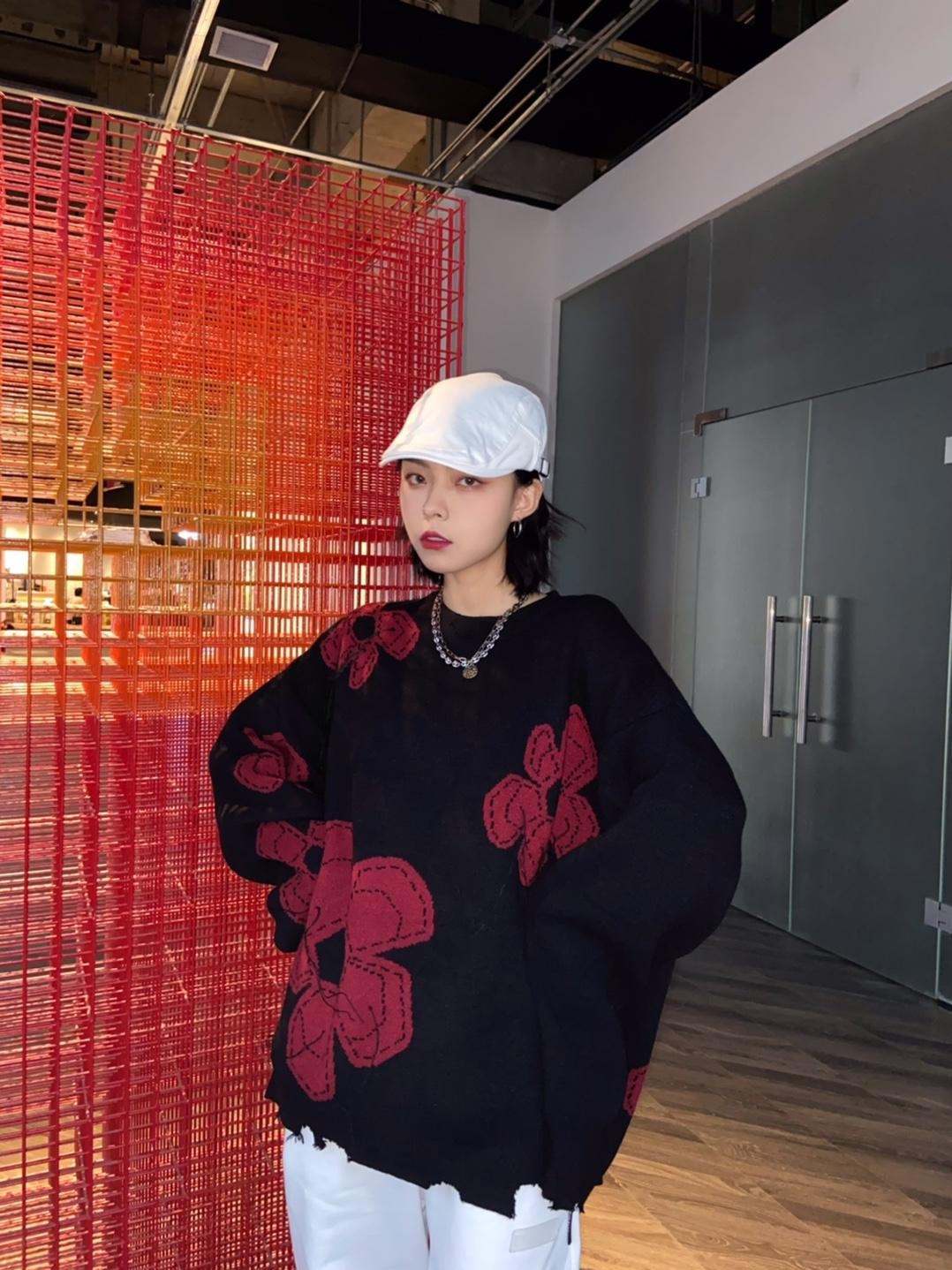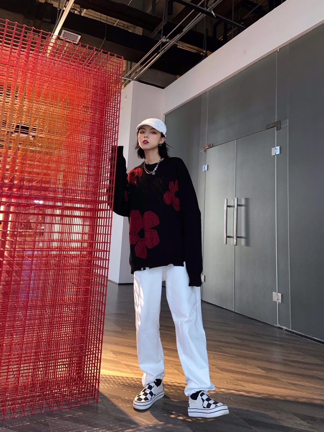 这是一款复古风格针织毛衣,以黑色为底色,加入红色印花元素,视觉上就给人一种清新文艺的感觉,格外有腔调。