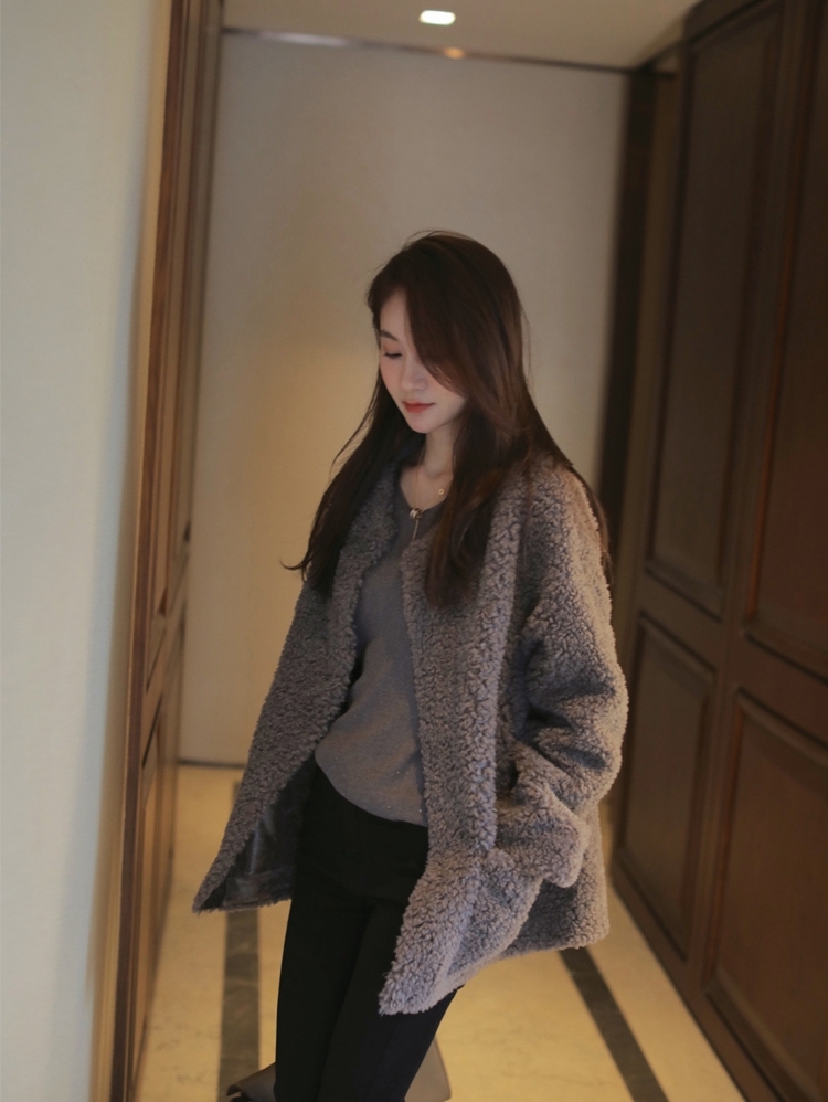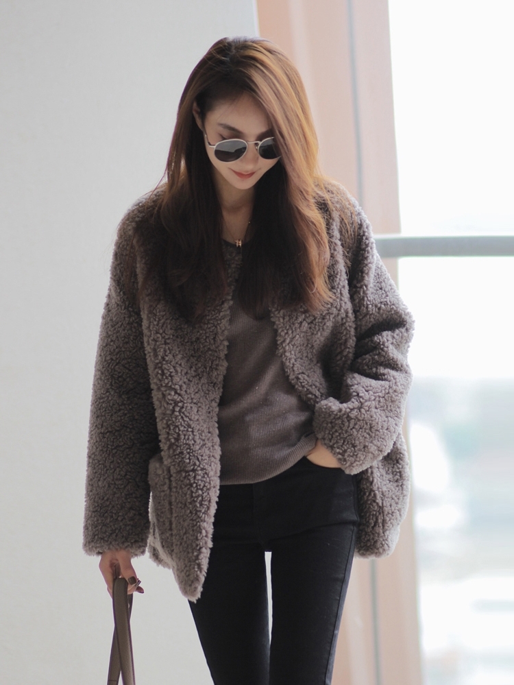 短款的羊羔毛外套,暖和又很显瘦,帅气的小翻领,减龄又很百搭哦,搭配条牛仔裤,超级显高的说。