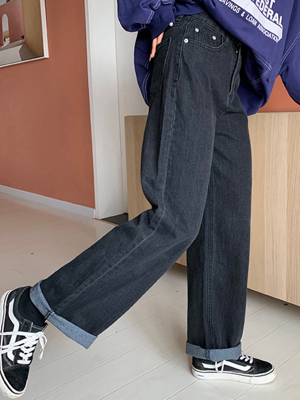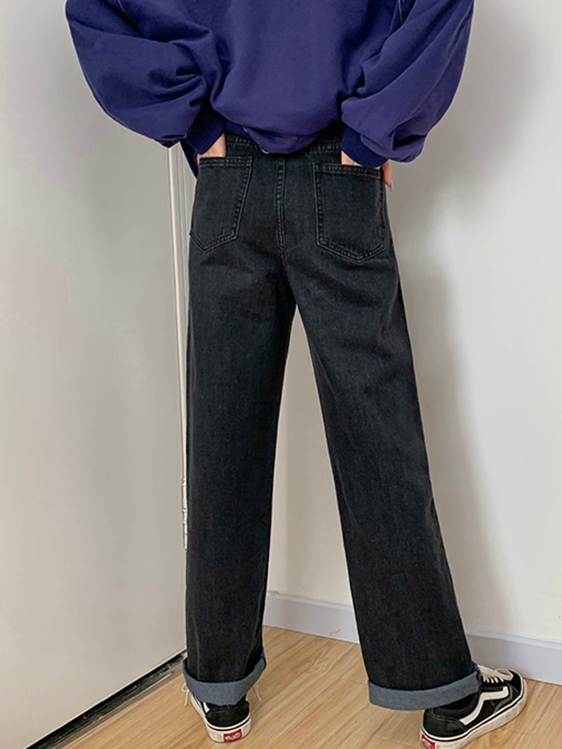 高腰设计,拉长身材比例。高腰牛仔裤,显瘦显腿长。直筒裤型,修饰腿部线条。