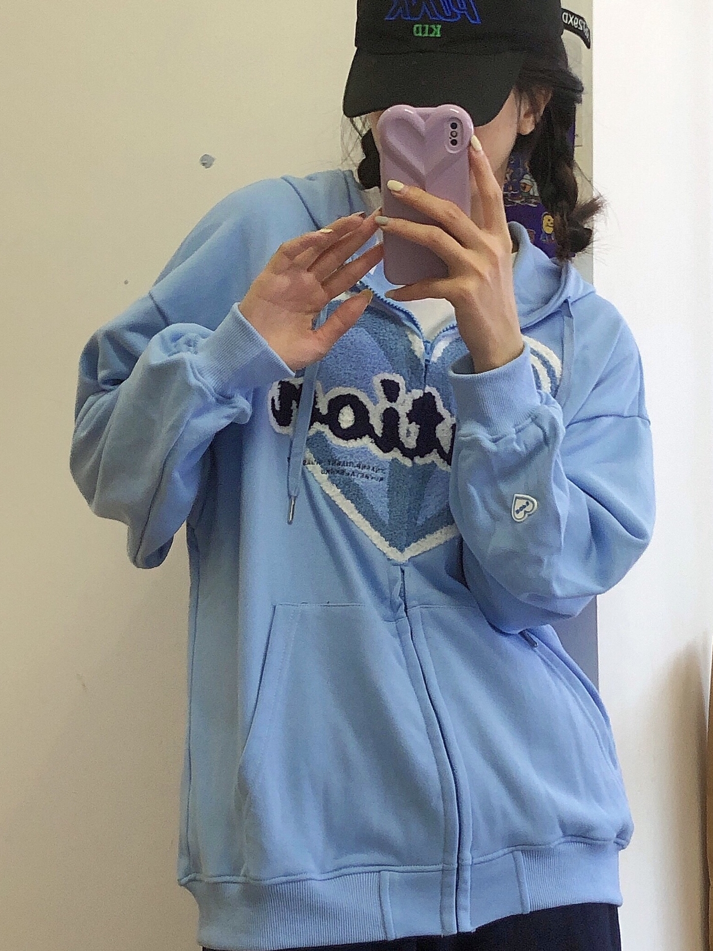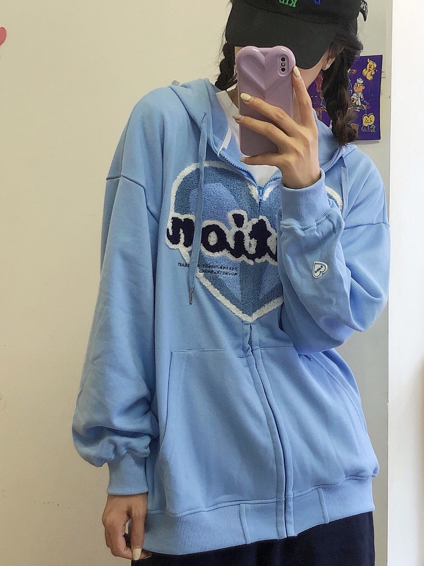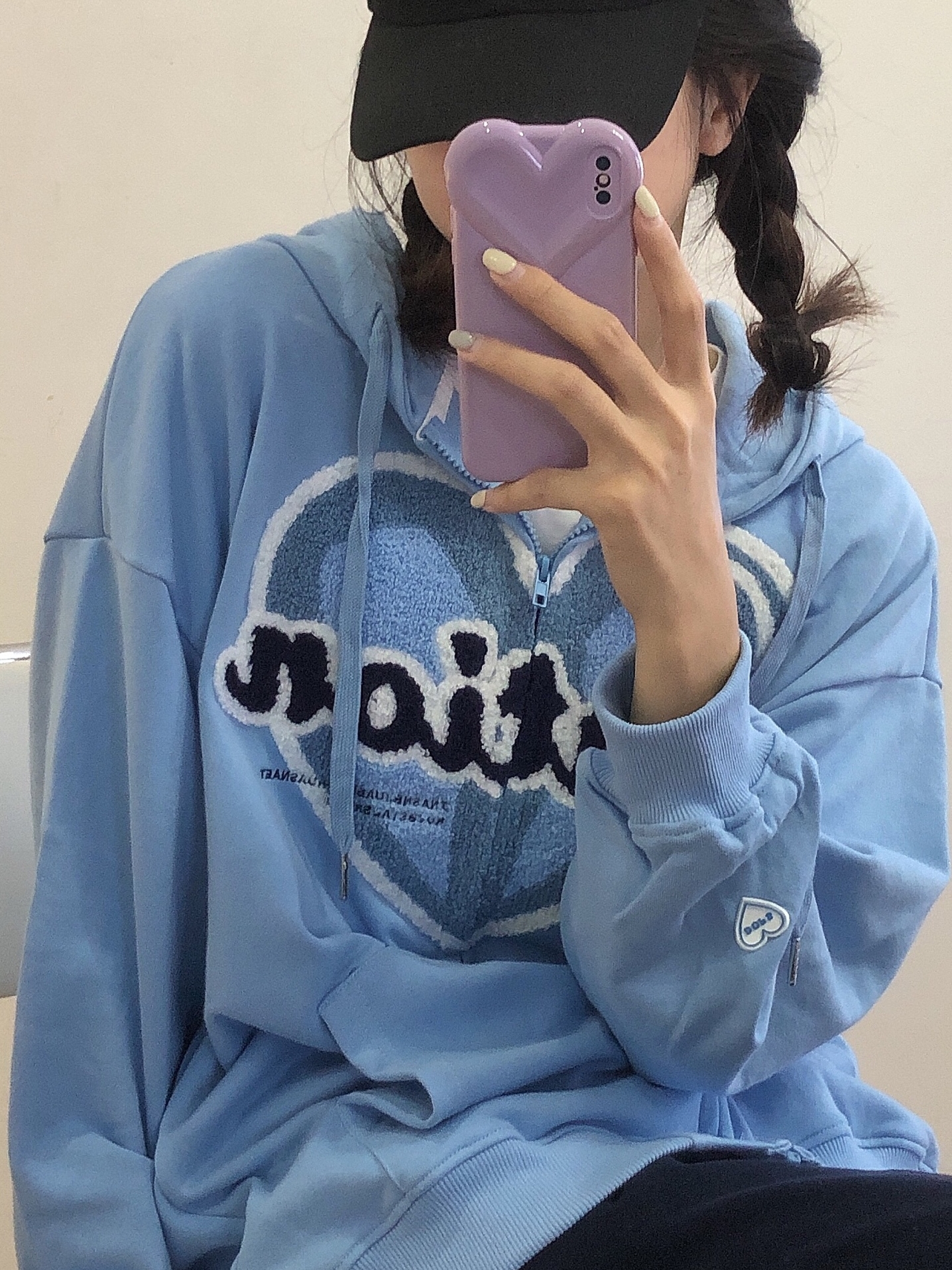 爱心圆领长袖卫衣,罗纹圆领穿着更显可爱,爱心撞色点缀,让整件衣衣瞬间时尚起来,搭配超一条粉色的超短裙更加性感迷人。
