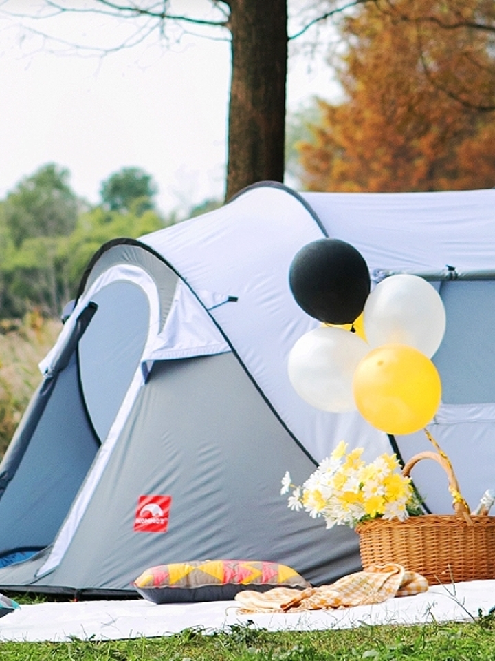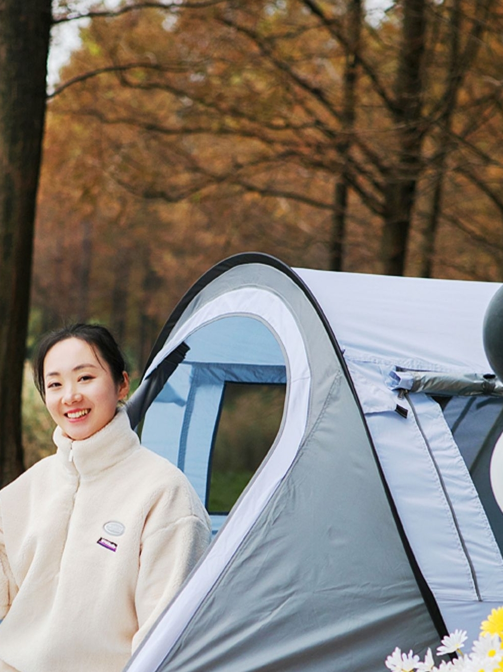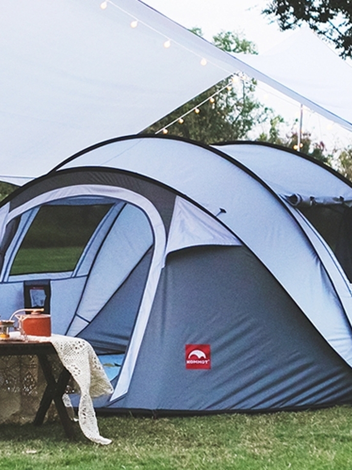 外帐选用190T涂银防水布材质,有效防水防风,抵御阳光中的紫外线,全自动铝杆支架,轻松搭建,省时省力,可用隔帘隔成两个房间,使用更方便,配有防蚊虫纱网门,透气舒适。