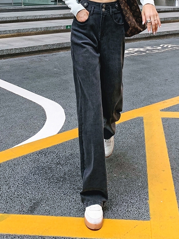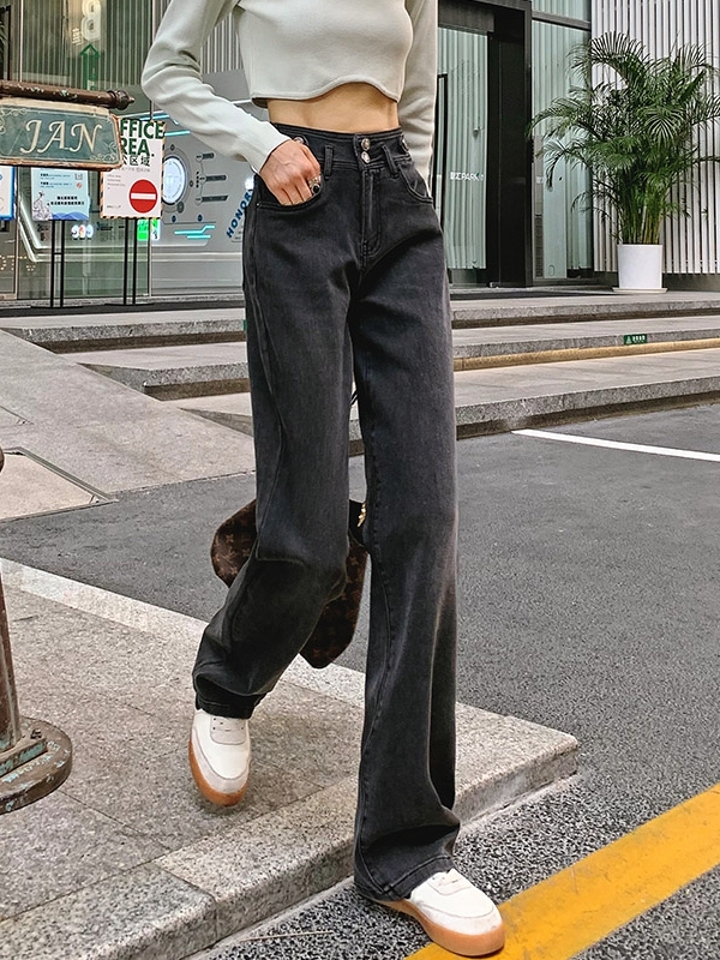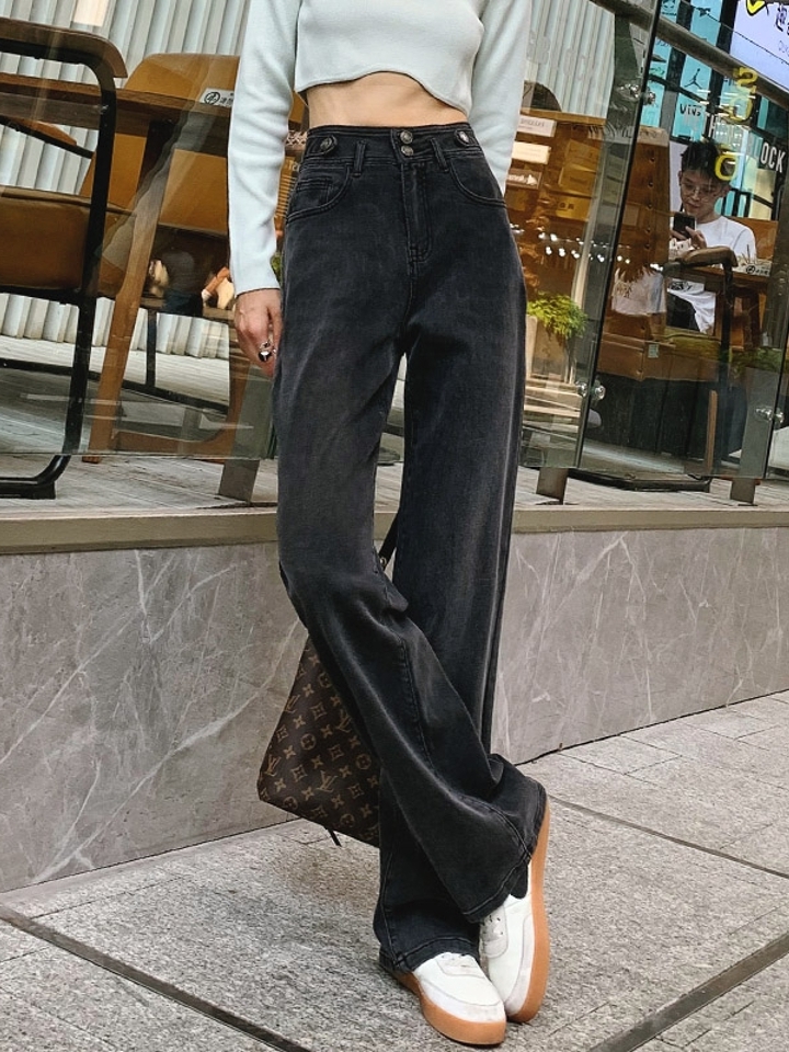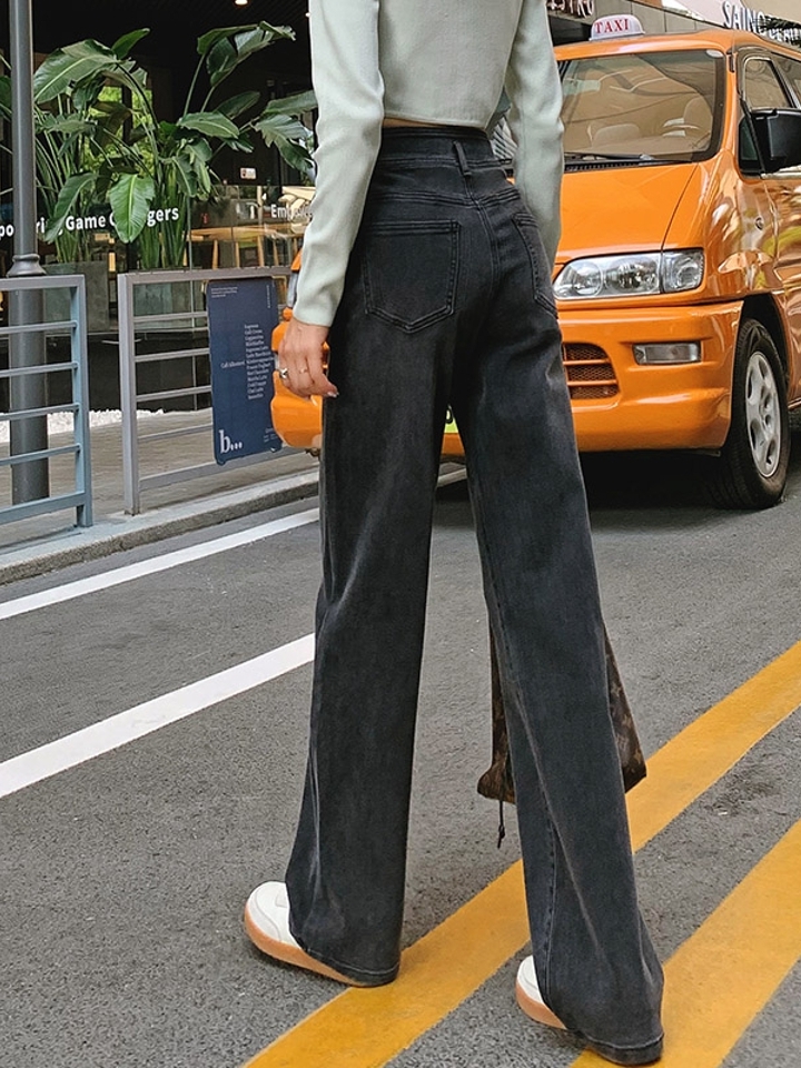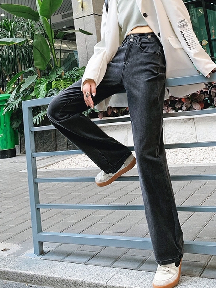 高腰设计,拉长身材比例。高腰牛仔裤,显瘦显腿长。直筒裤型,修饰腿部线条。