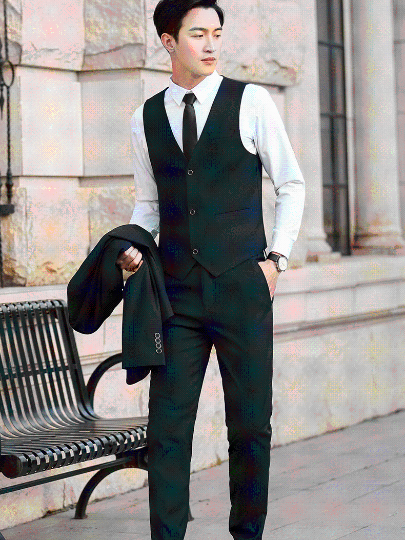 西服是商务男人必备的优雅战衣,一直以来就是儒雅、绅士的代表典范,能轻松驾驭各种不同场合,此款西服可配可脱卸小马甲。