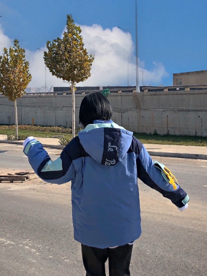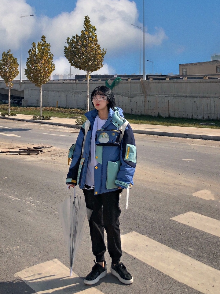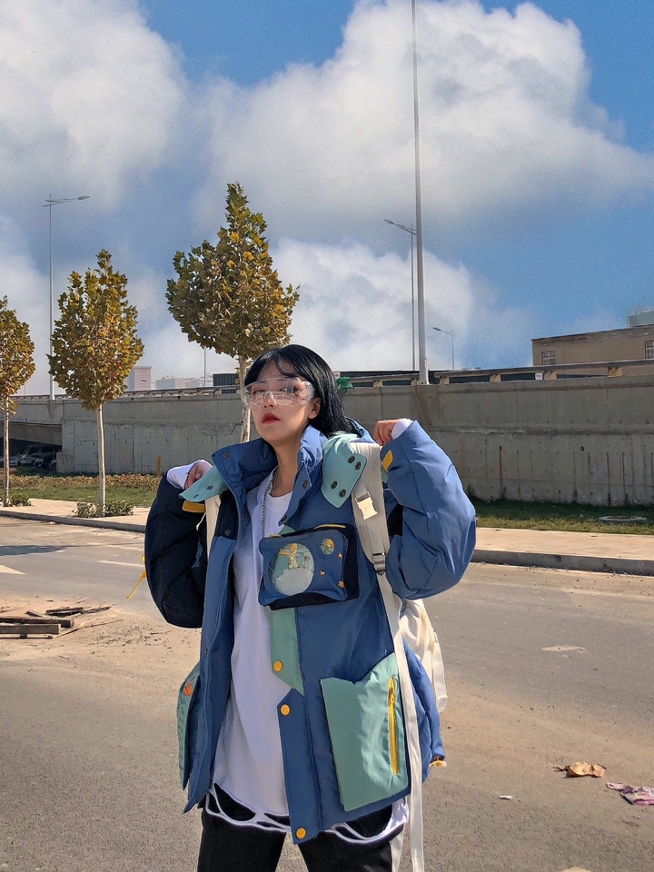 这个外套种草很久了,穿上后会变的蓬松厚实,感觉是暖暖的,小王子的各种元素在这件羽绒服上真的是可爱到爆!从浅蓝到深蓝的色调拼接,真的走在哪都能很吸睛。不过在日常穿搭上,像我这样搭配更不容易出错,外套的色调较多,内搭白T打底,提亮活力。下装黑色束脚裤配黑色运动鞋的搭配,给人一种上浅下深的视觉对比感。