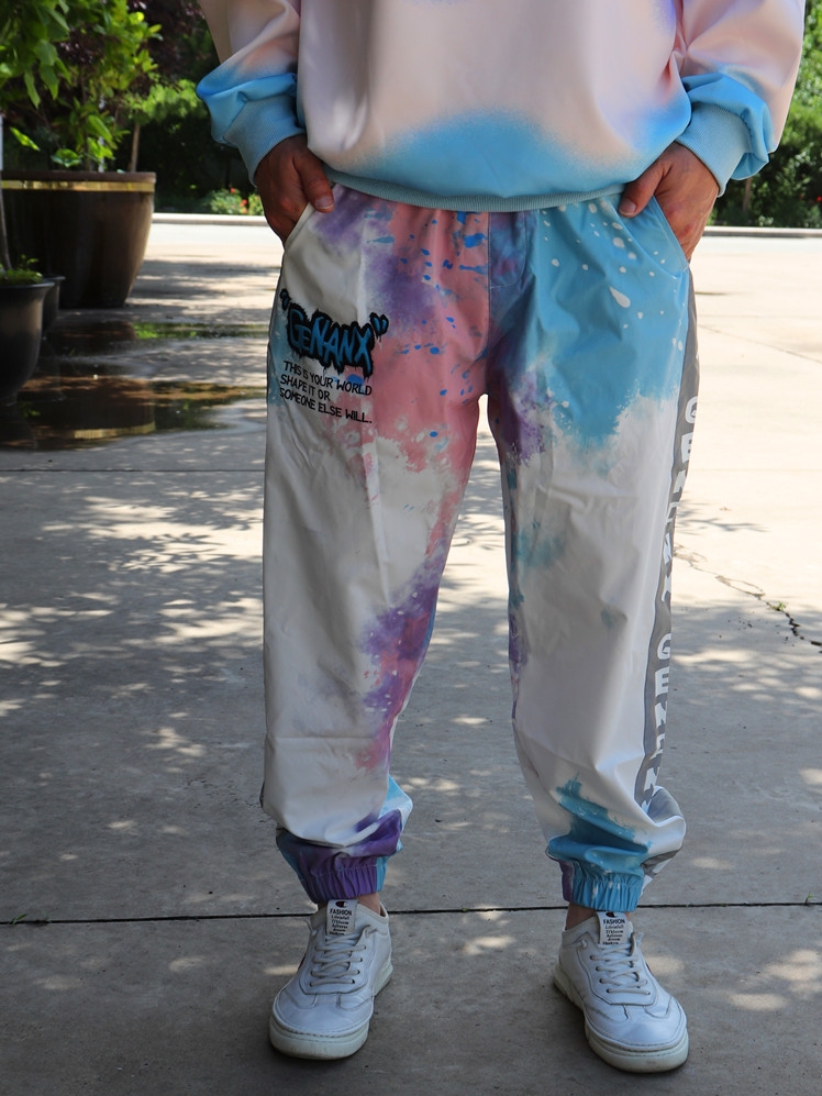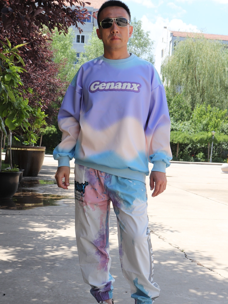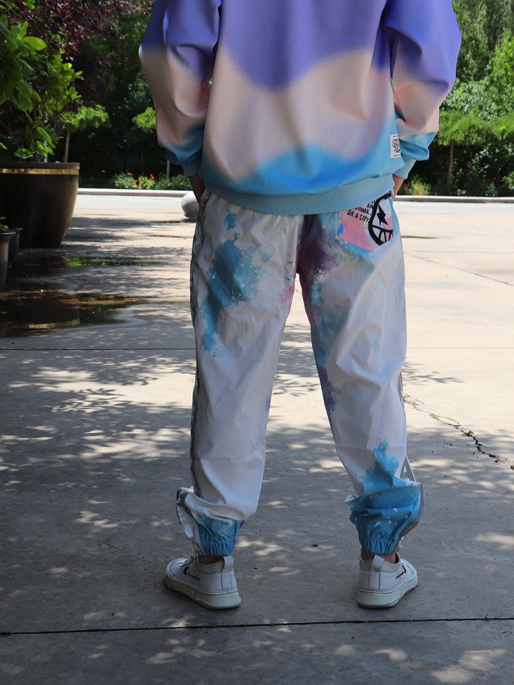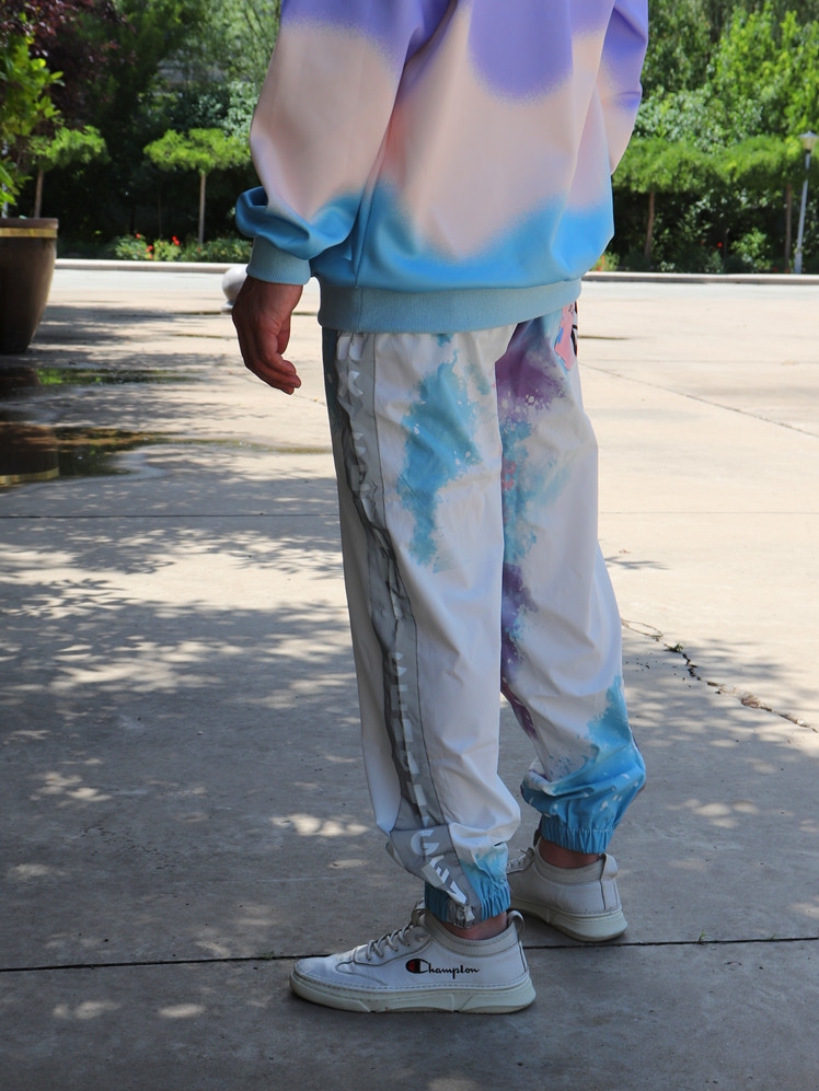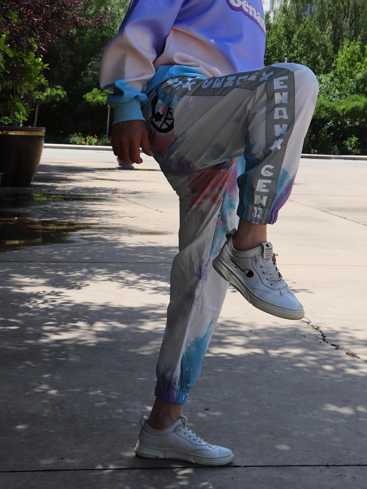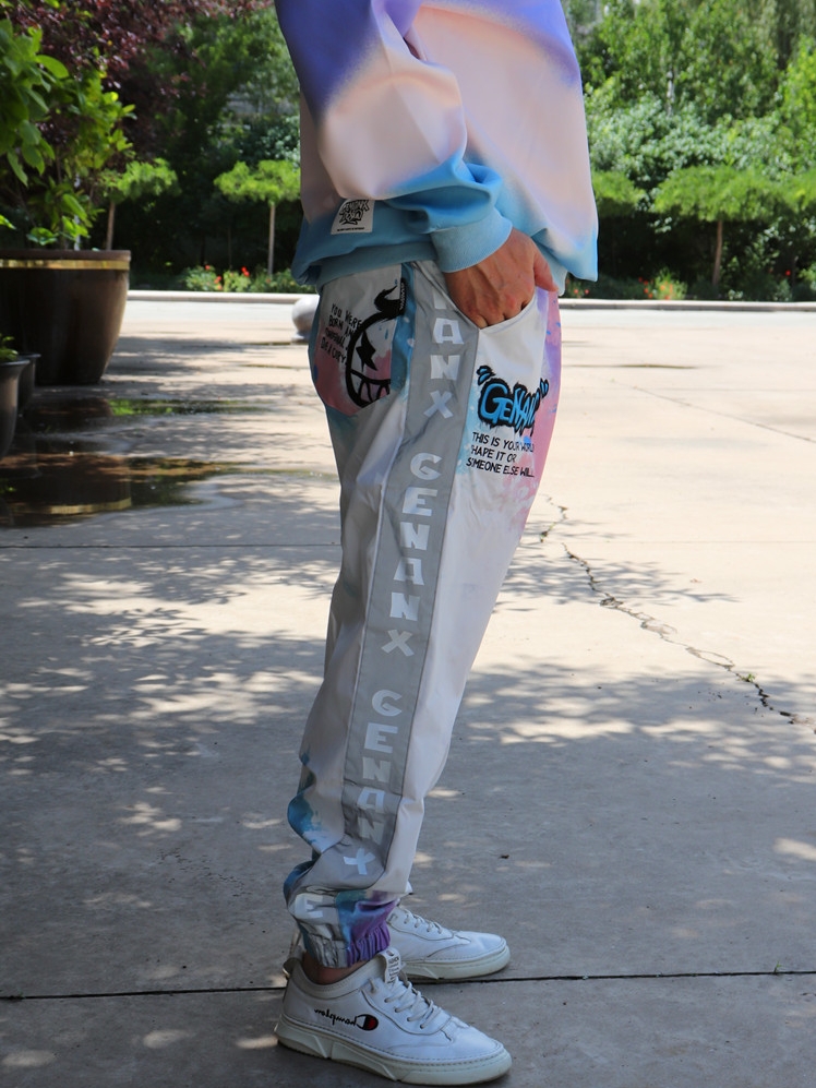 裤腰采用松紧抽绳设计,结合舒适的面料,有着舒适方便的穿着感受。裤身精美的刺绣字母,清晰可见,打破整体纯色的单一感,点缀潮流青春气息。上身搭配同色系的晕染套头卫衣,脚下一双白色休闲板鞋,整体帅气舒适。