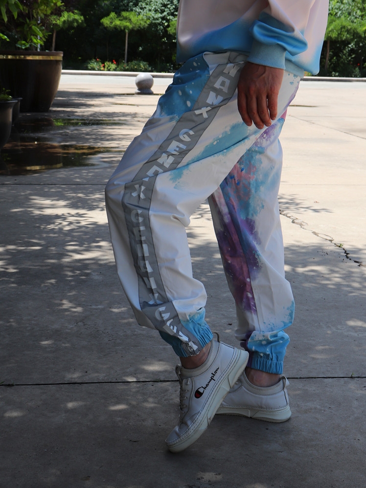 带有浓浓街头运动风的束腿裤,宽松的版型在小腿处却收住,在两侧增加了条纹点缀,再加点英文印花点缀则更加醒目,其宽松的版型也提供了舒适的穿着感。