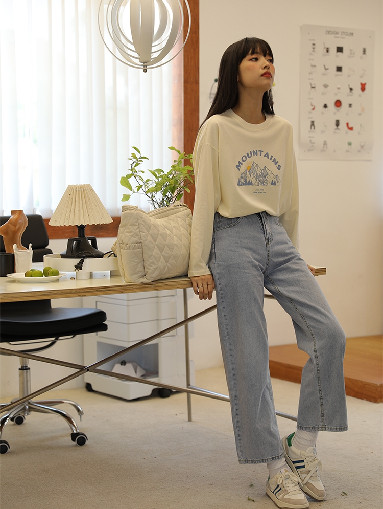 高腰设计,拉长身材比例。高腰牛仔裤,显瘦显腿长。直筒裤型,修饰腿部线条。