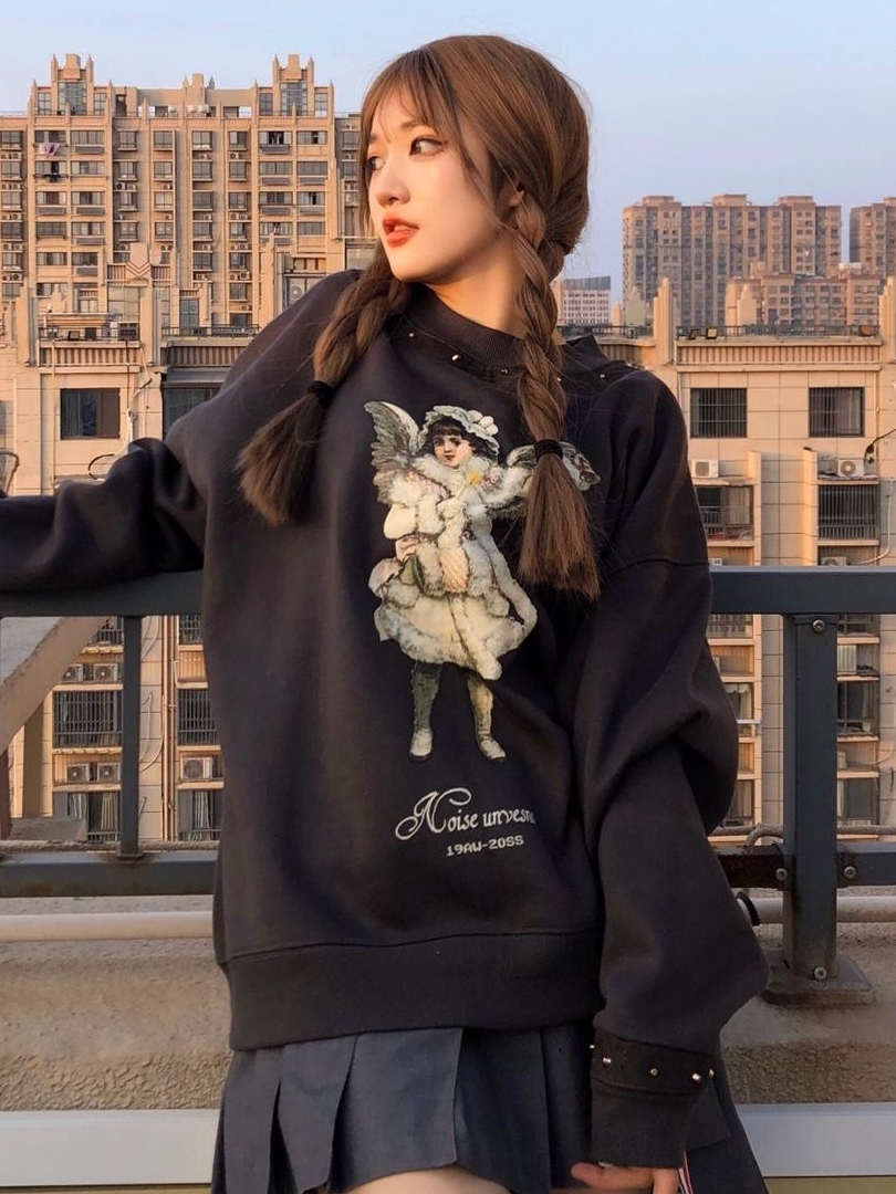 设计师把古欧洲通过印花的手法表现于衣身前幅,营造出视觉亮点,赋予了紫调衣身几分趣味性;并运用了圆领剪裁与收缩袖口及下摆,上身休闲有型,带来更好舒适度。