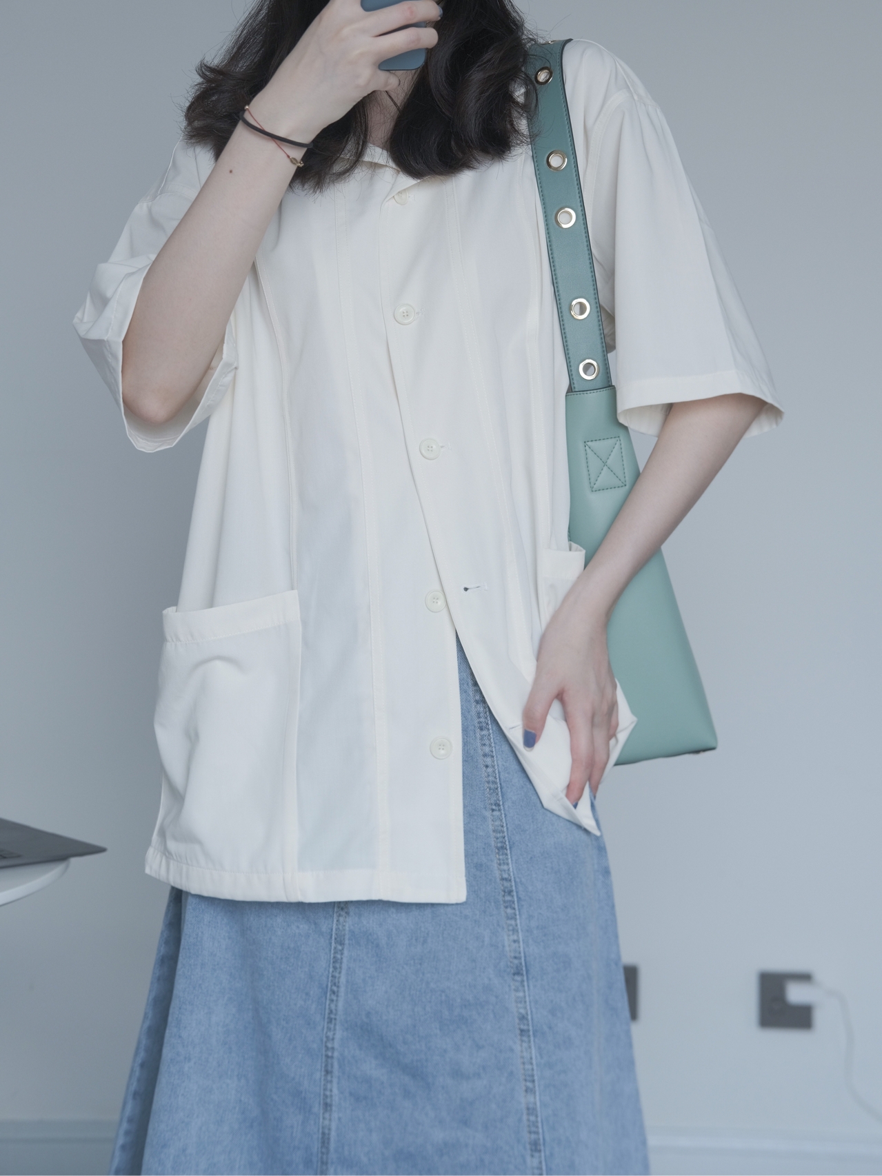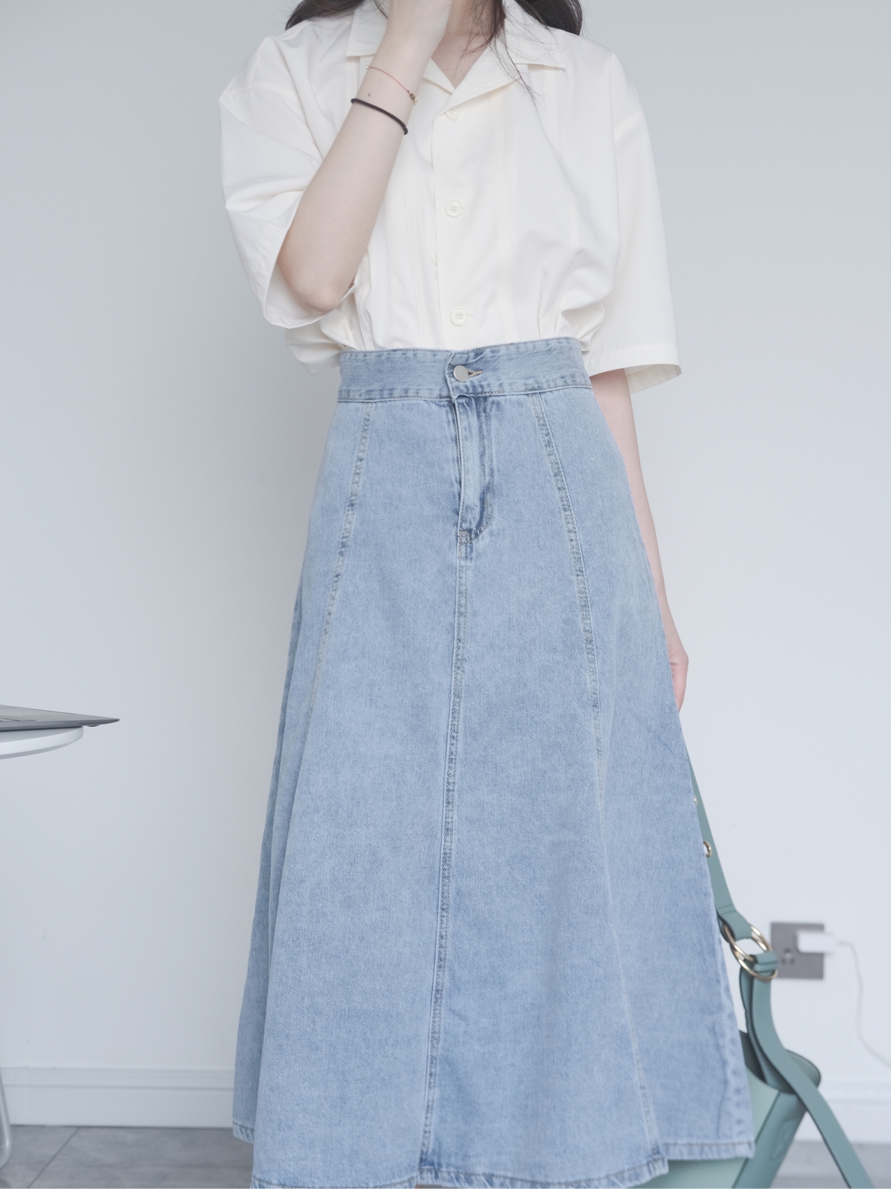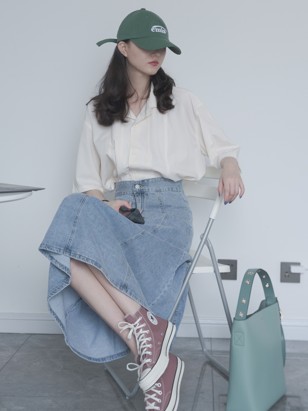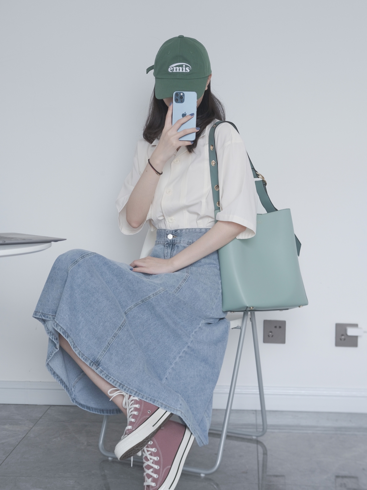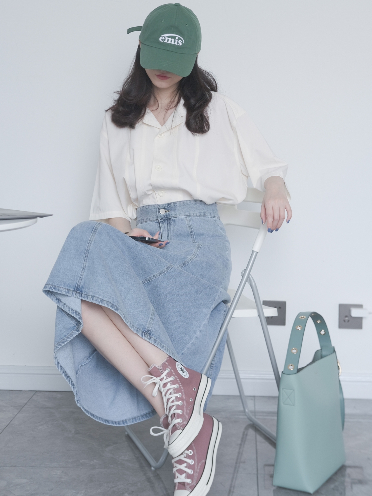 这套的短袖衬衫是LRMADE,牛仔半裙是泷萝,包包是CLI。