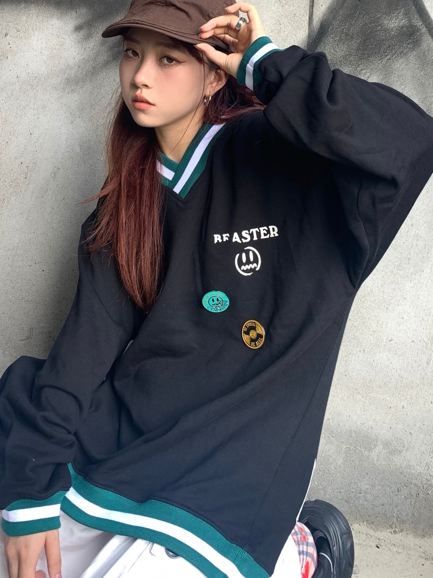 带有日系风格的上衣充满了个性风格,简约大方的宽松款式显瘦遮肉,复古的印花点缀充满了古典的韵味,拼接的V领设计,带有撞色的时尚感,整体风格时尚大气。