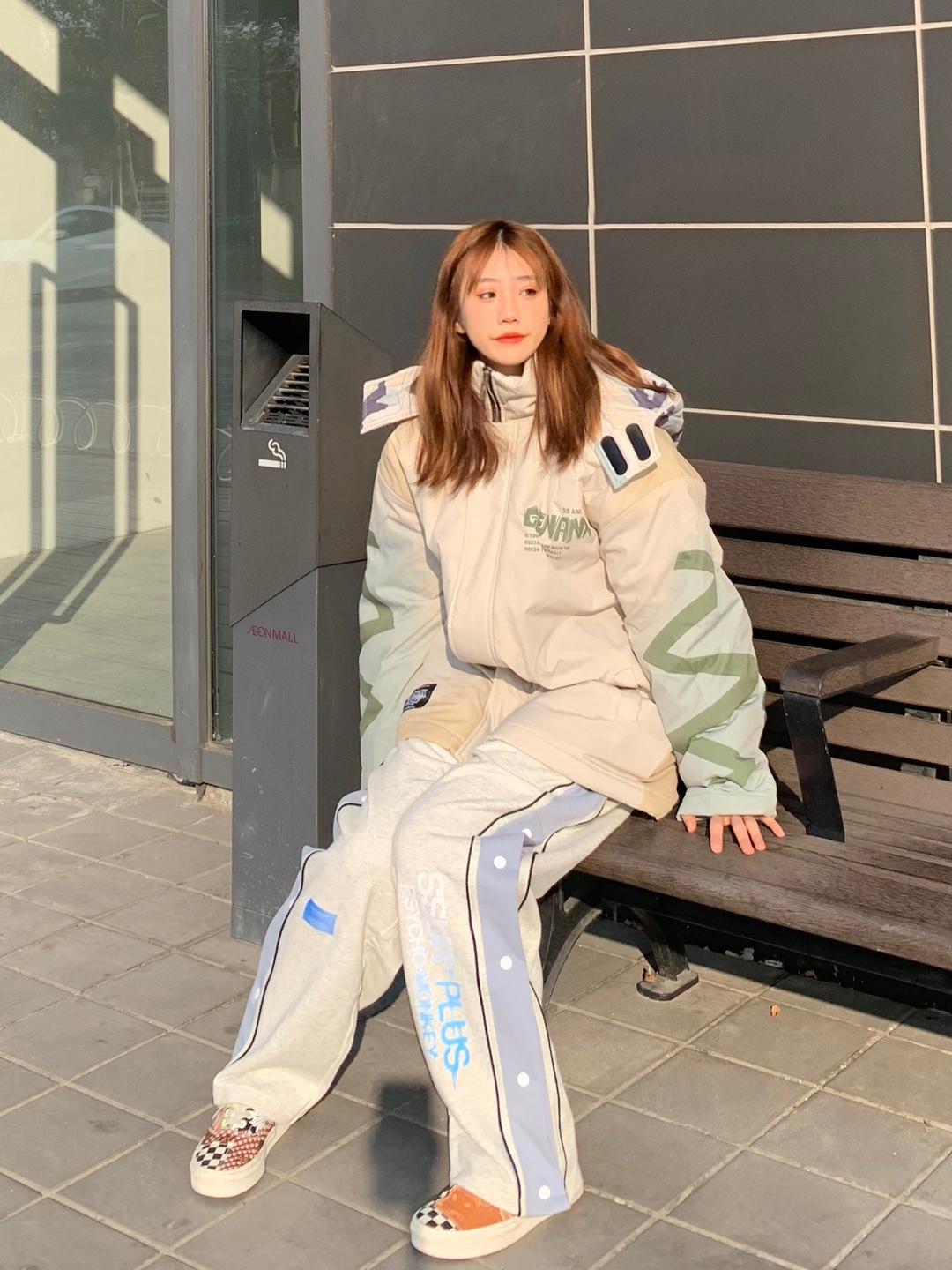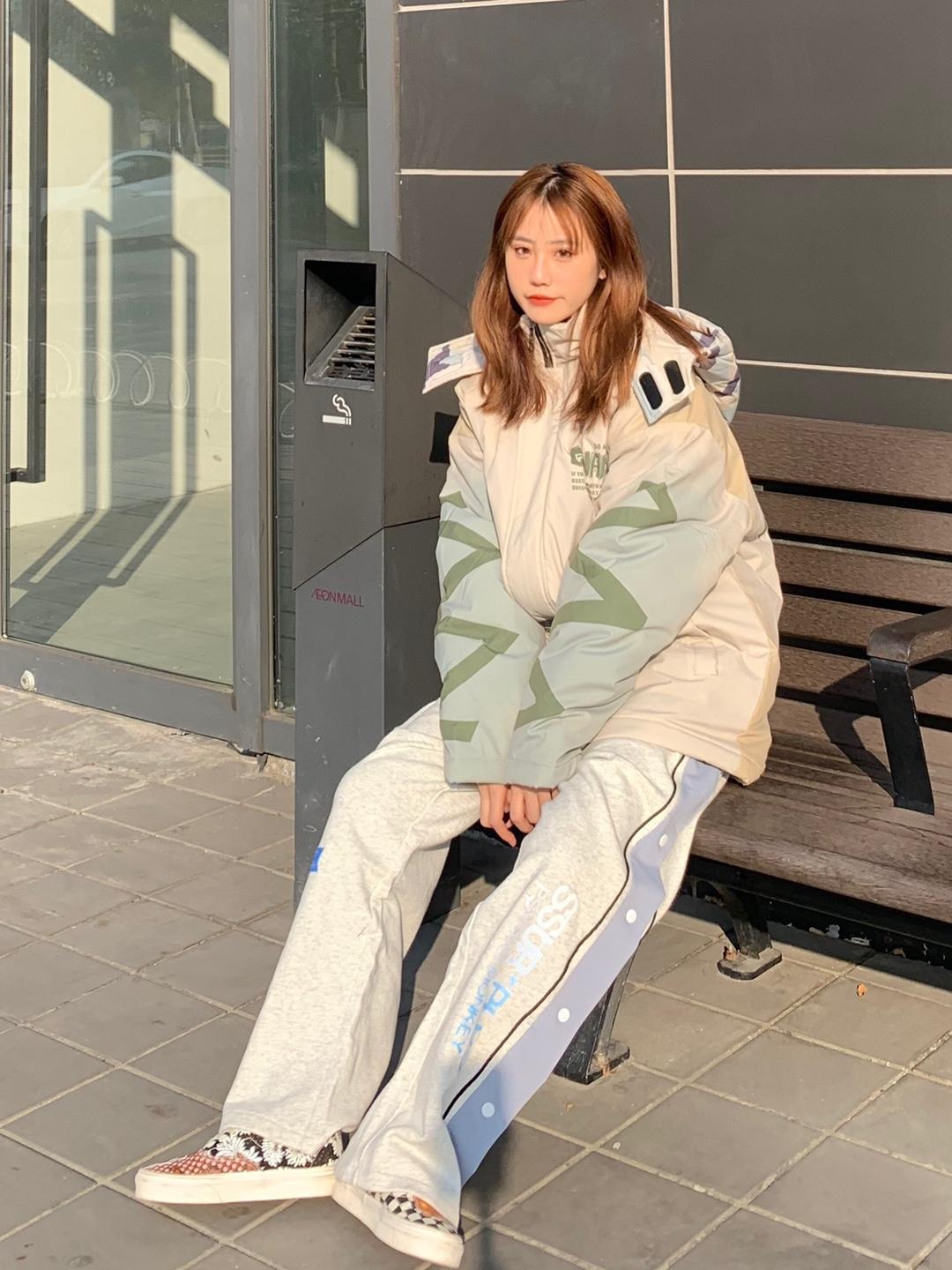 可搭配件灰色长袖上衣,脚上一双休闲板鞋。