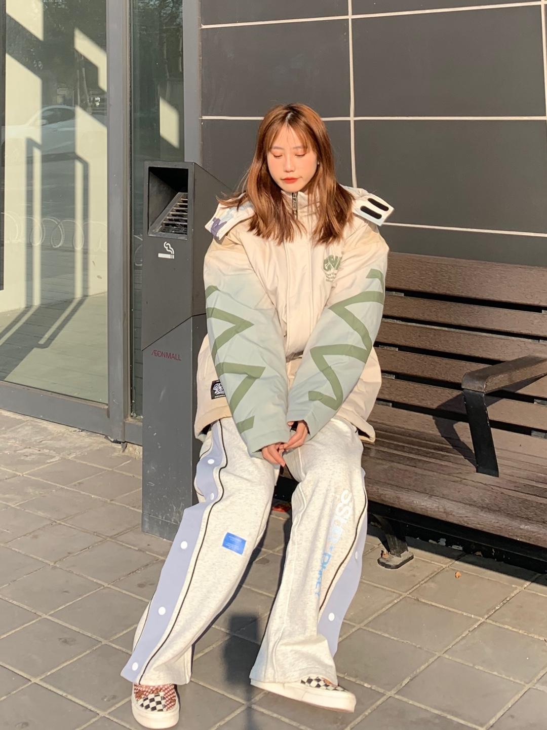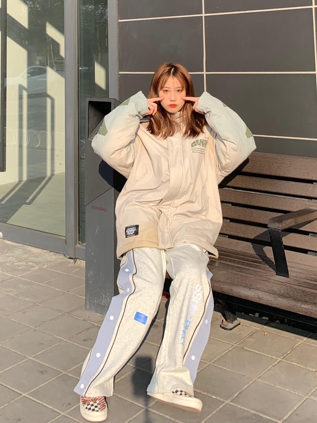 休闲直筒的裤身,侧边采用拼色双排扣的开叉设计。