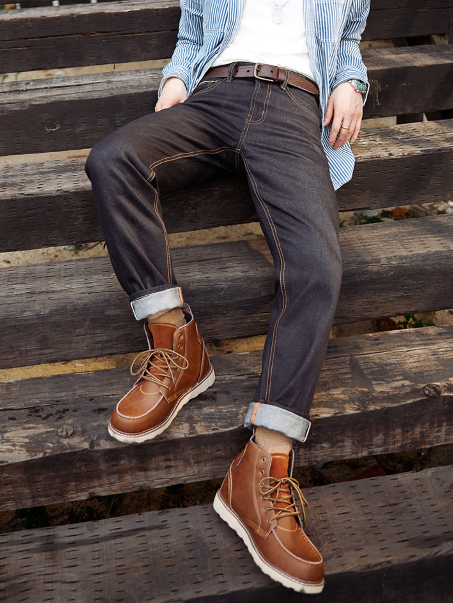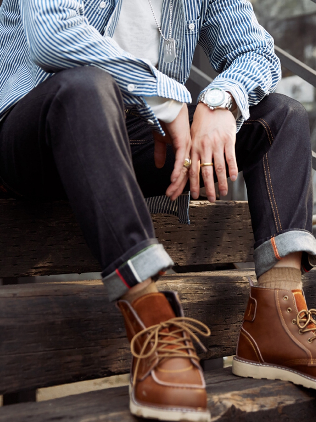彰显浓郁的复古风情,卷边的设计风格,显出随性。精选经典而传统的赤耳丹宁牛仔面料,彰显品质。