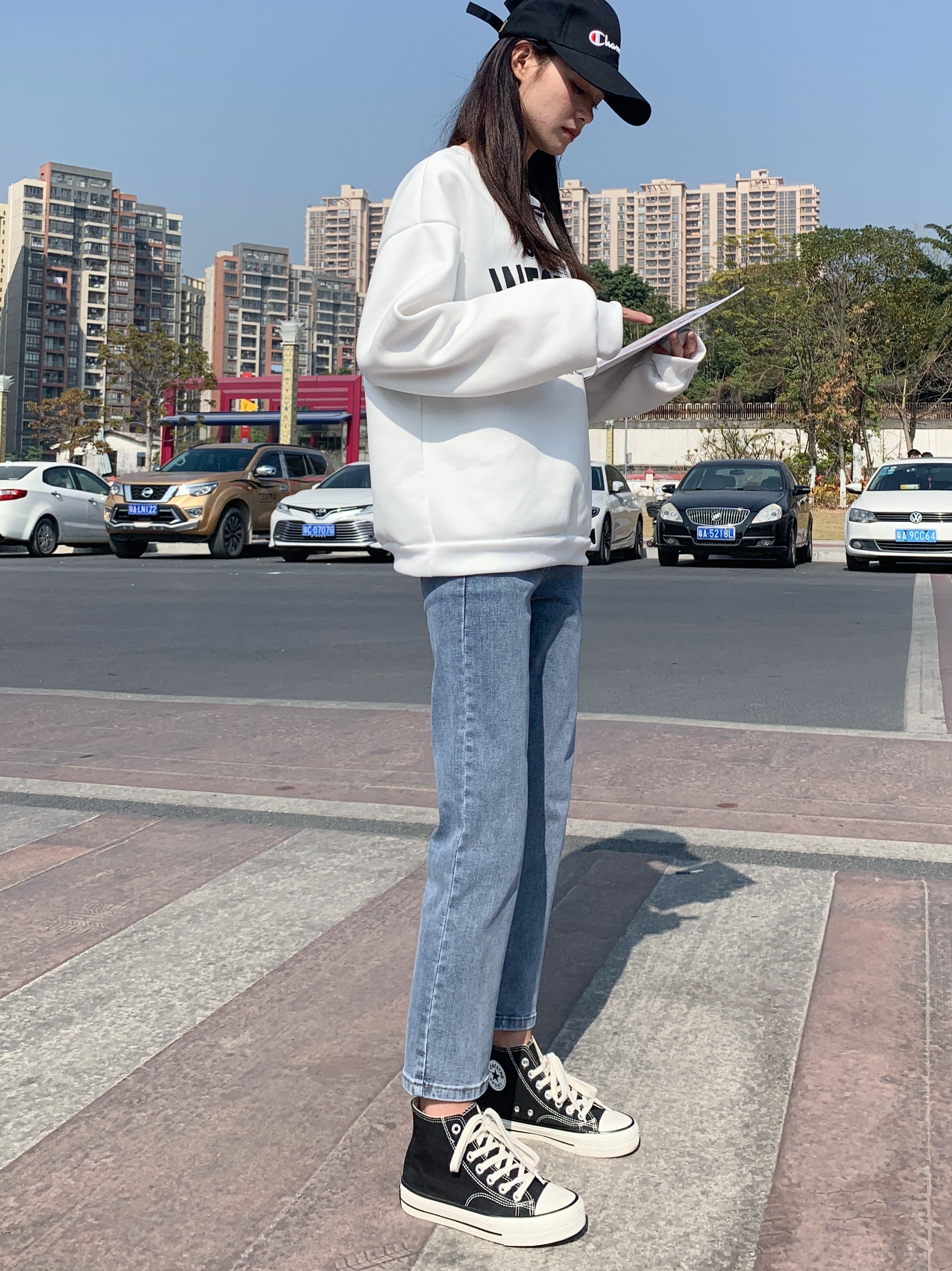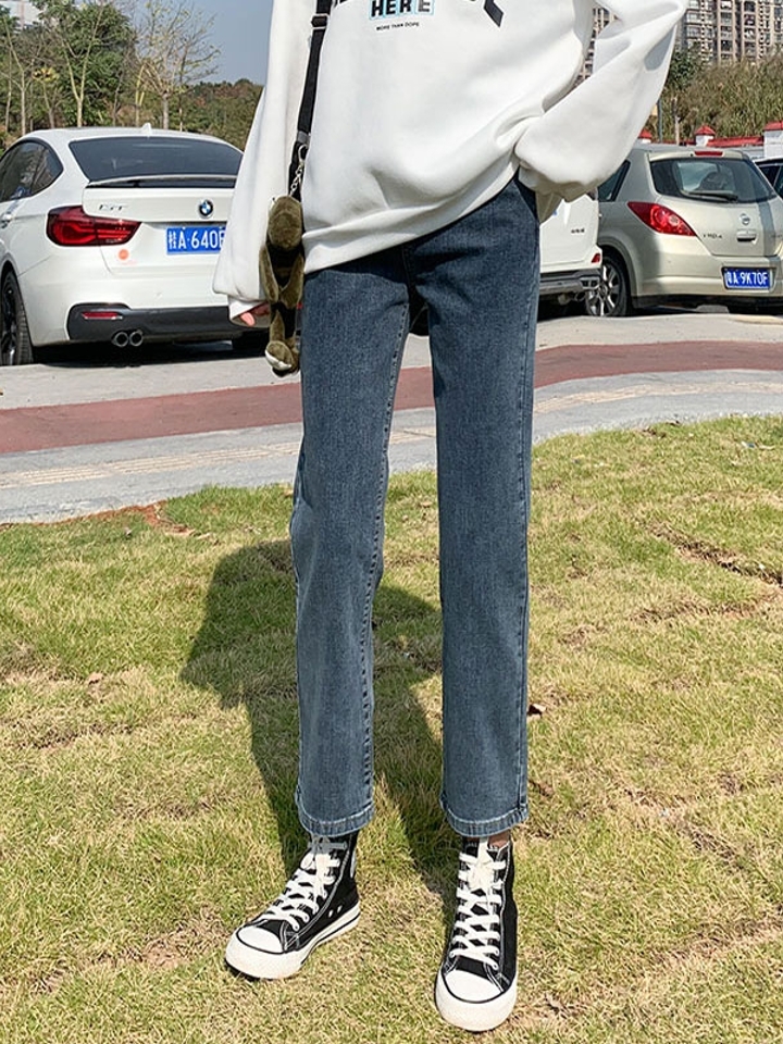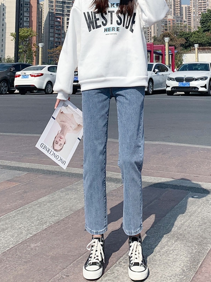高腰设计,拉长身材比例。高腰牛仔裤,显瘦显腿长。直筒裤型,修饰腿部线条。