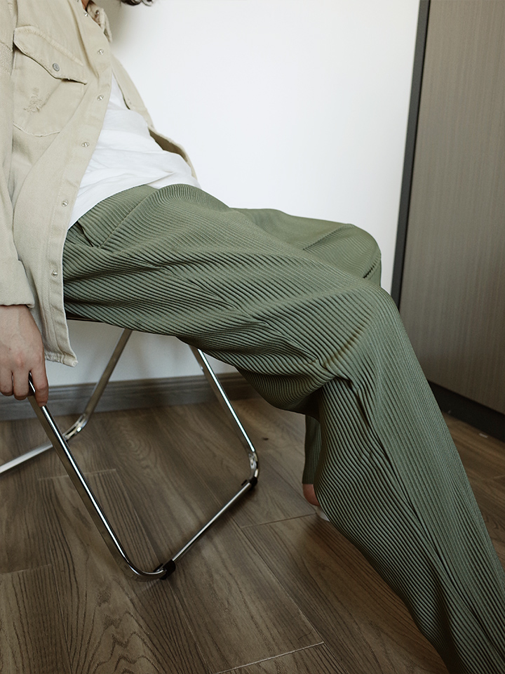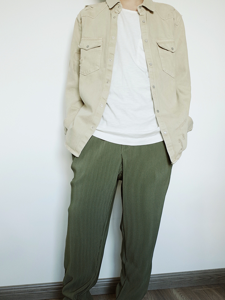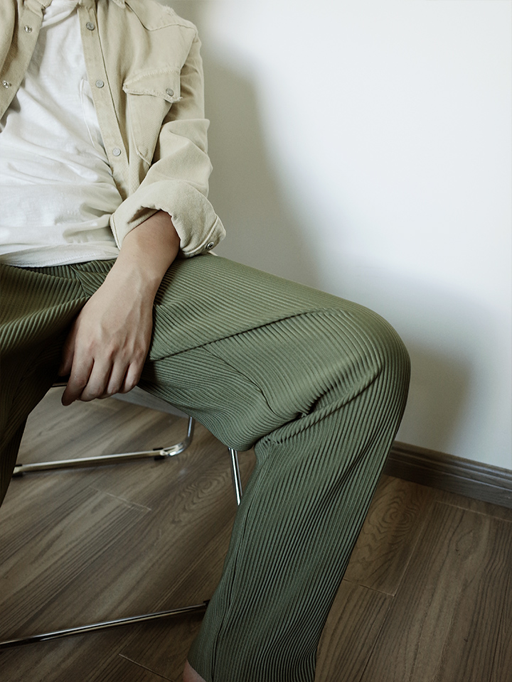 自带光泽感的面料再搭配上小打褶设计,让这款休闲裤更显精致、高级感。上半身可以采用T恤和衬衫的叠搭设计,丰富穿搭的层次感,更显立体性视觉。