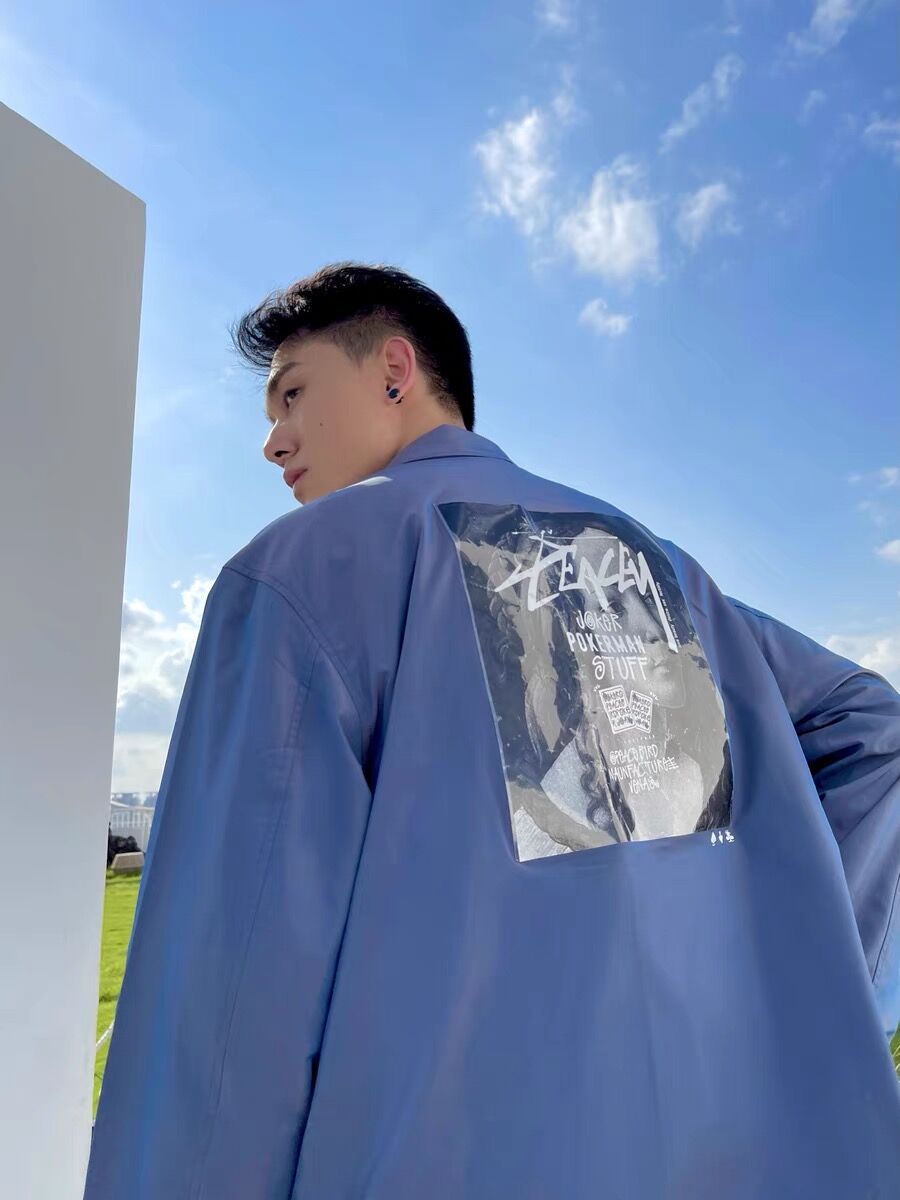 街头风,翻领外套风衣,反光面料,工艺质量好,反光材料在有光线的照耀下,会有反光的效果。