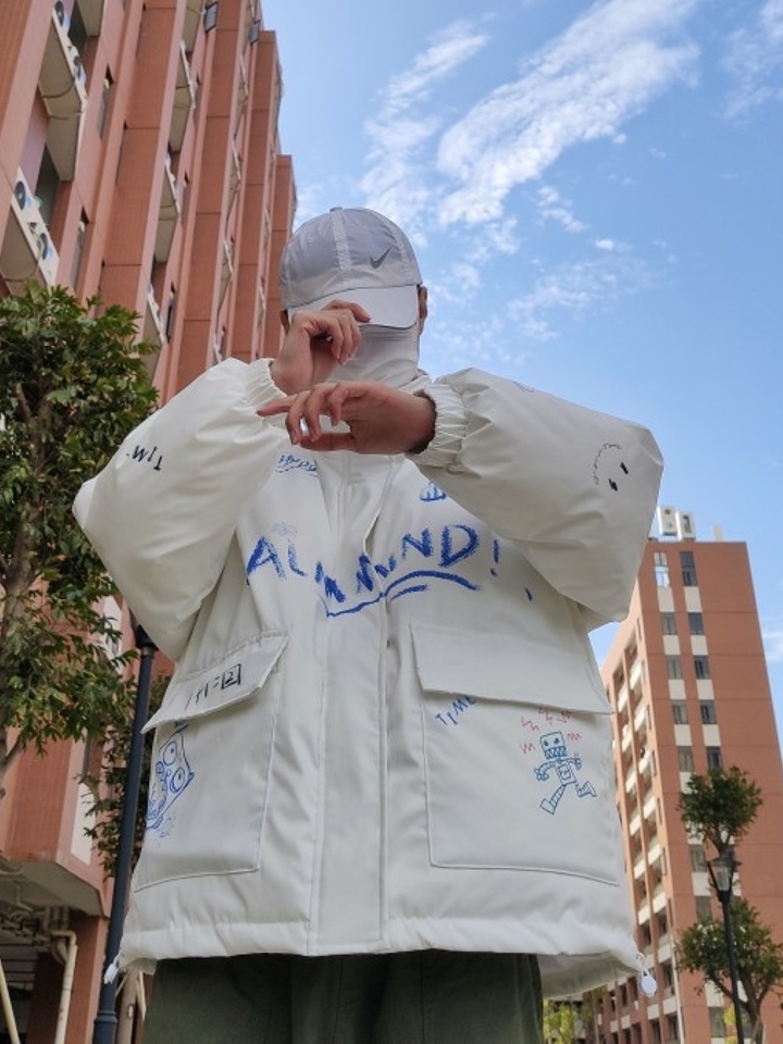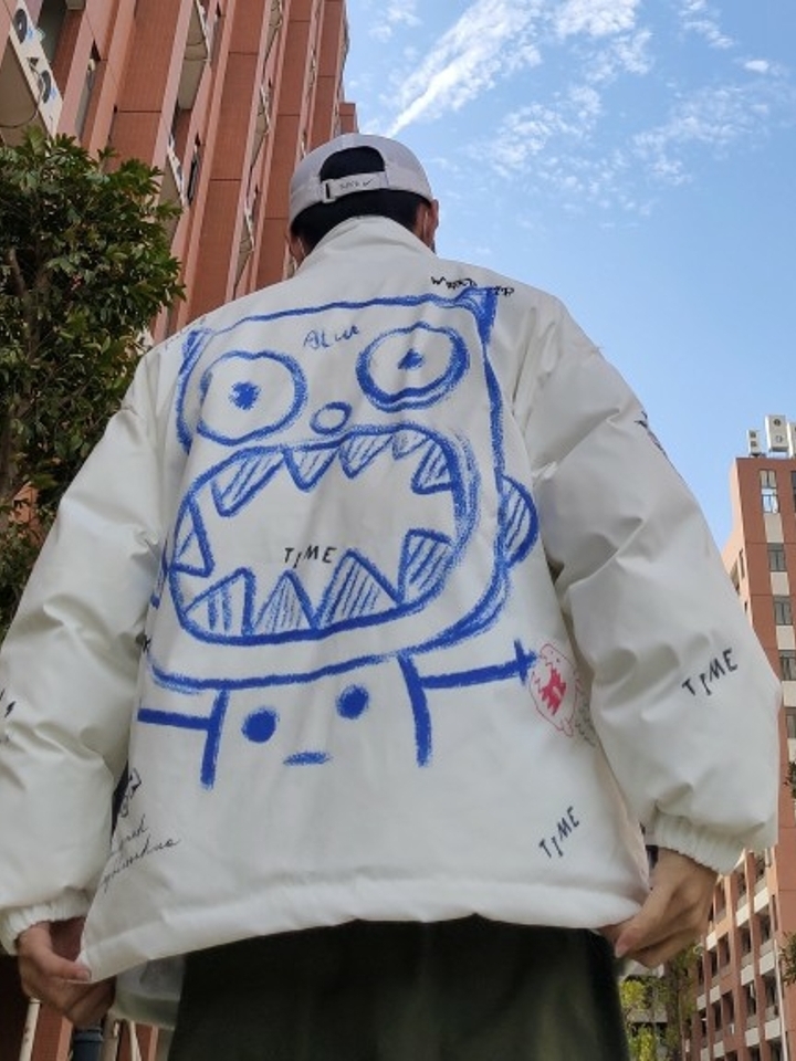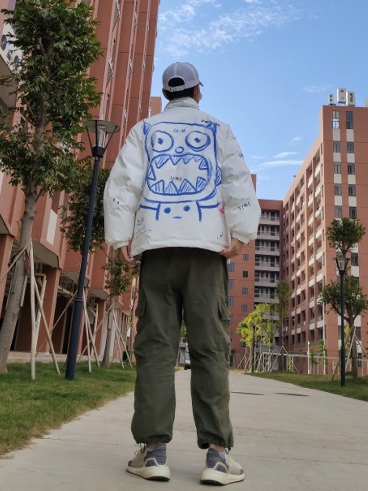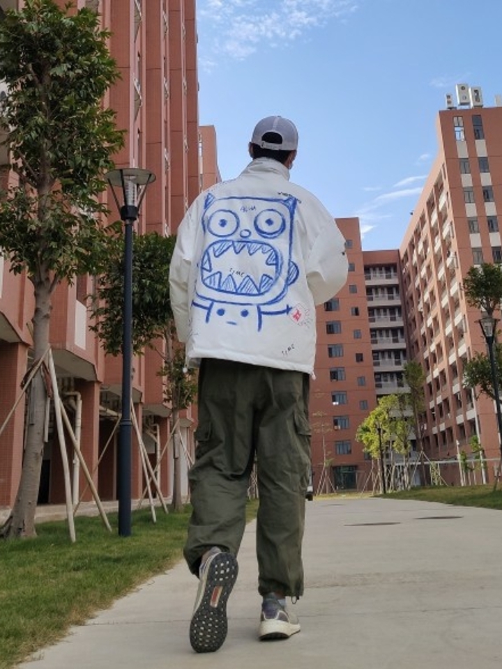 衣服质量不错,图案设计有个性,款式很好看,面料柔软,穿着挺舒服的,上身效果很赞。后幅加入怪兽涂鸦装点,为青春增添几分趣味感。