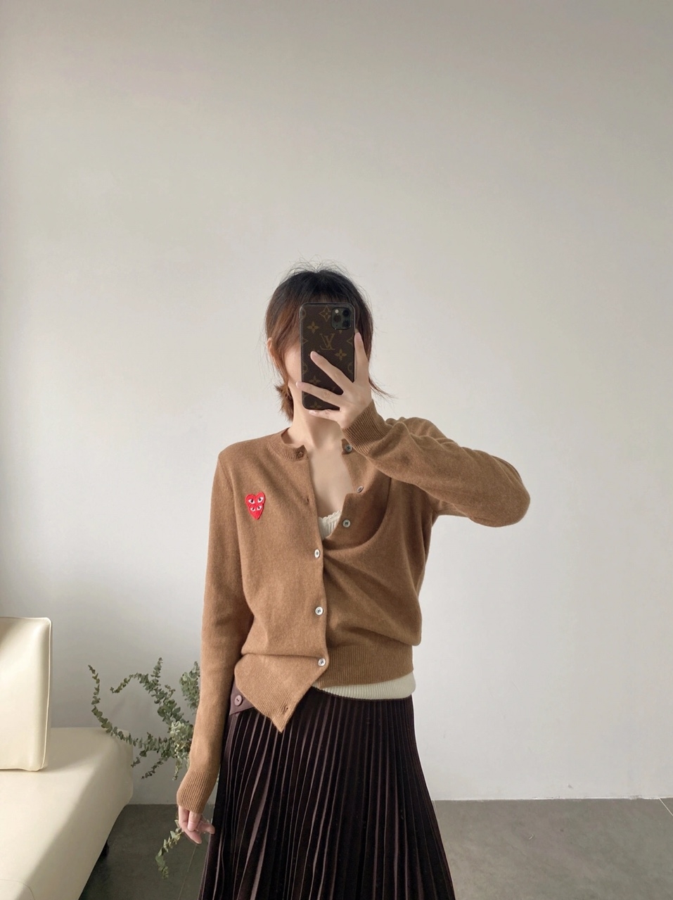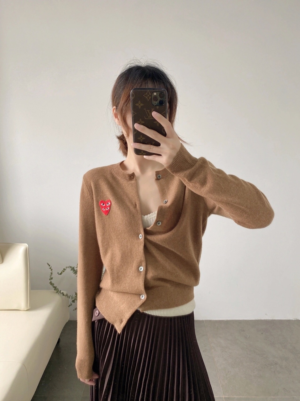 简洁的开衫版型,自然形成的V字领,搭配内衬方便,更显落落大方之美。小巧的撞色桃心图案零星点缀在其中,配合纯净朴素的色调,整体诠释出一种温婉秀气的女性气质。