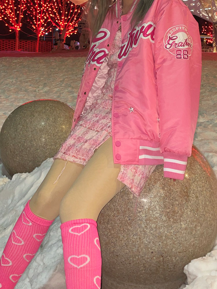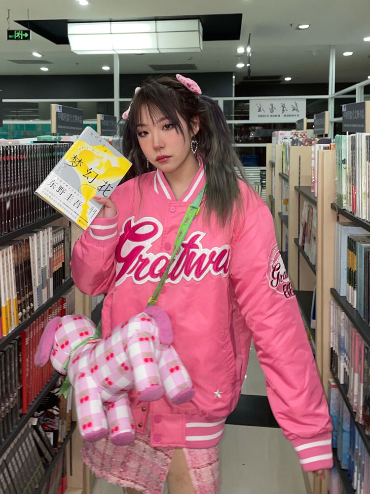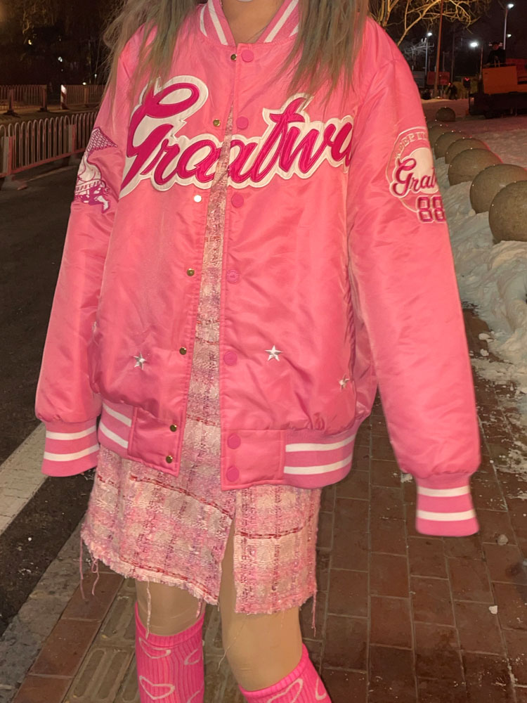 GRAF也太潮了。经典飞行夹克领,结合罗纹领口,带来舒适贴服的穿着体验。粉色调配色,看起来非常有活力。下摆罗纹收口,随意不紧绷,活动自如。