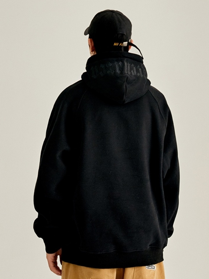 黑色的基础款连帽卫衣,反光印花的设计是这款卫衣的一个设计点,而且连帽的款式设计也是比较减龄的。很百搭的款式。印花的设计丰富了这款黑色卫衣的设计感。