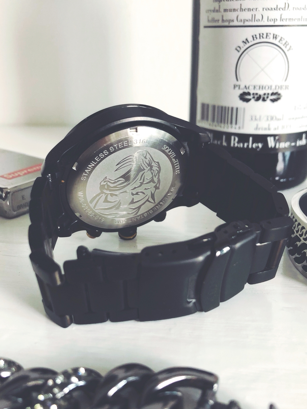 最爱的是黄色的秒针和表帽,这配色太帅,底盖还雕刻着剑齿虎图案,是一款非常百搭有型的手表。